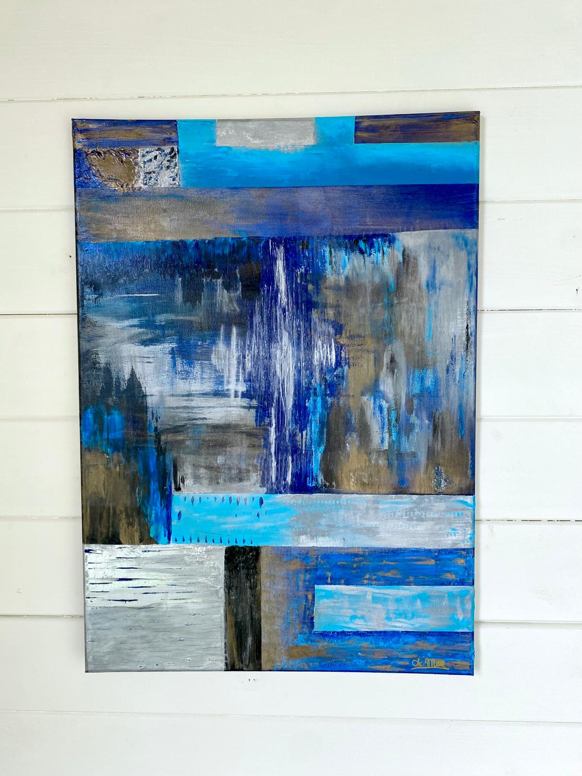 Kompozycja jest podzielona na kilka wyraźnych sekcji, które tworzą wrażenie głębi i ruchu. Dominują odcienie niebieskiego – od jasnego, niemal turkusowego, po głęboki granat. Są one przełamane szarościami, brązami i bielą, co nadaje pracy zarówno chłód, jak i ciepło. Niebieskie tony symbolizują tonię oceaniczną Obraz podzielony jest na poziome i pionowe pasy, które tworzą geometryczne bloki. Górna część zawiera jaśniejsze, bardziej kontrastowe elementy, podczas gdy środkowa i dolna część jest bardziej płynna, z efektem spływających smug, które przypominają wodospad lub deszcz. Te smugi dodają dynamiki i wrażenia ruchu. Wyraźne ślady pędzla i szpachli, nadają pracy surowości i organicznego charakteru. Niektóre fragmenty, szczególnie w górnej lewej części, mają bardziej szorstką, chropowatą powierzchnię, co kontrastuje z gładszymi obszarami. Styl przypomina nowoczesną abstrakcję z elementami ekspresjonizmu.