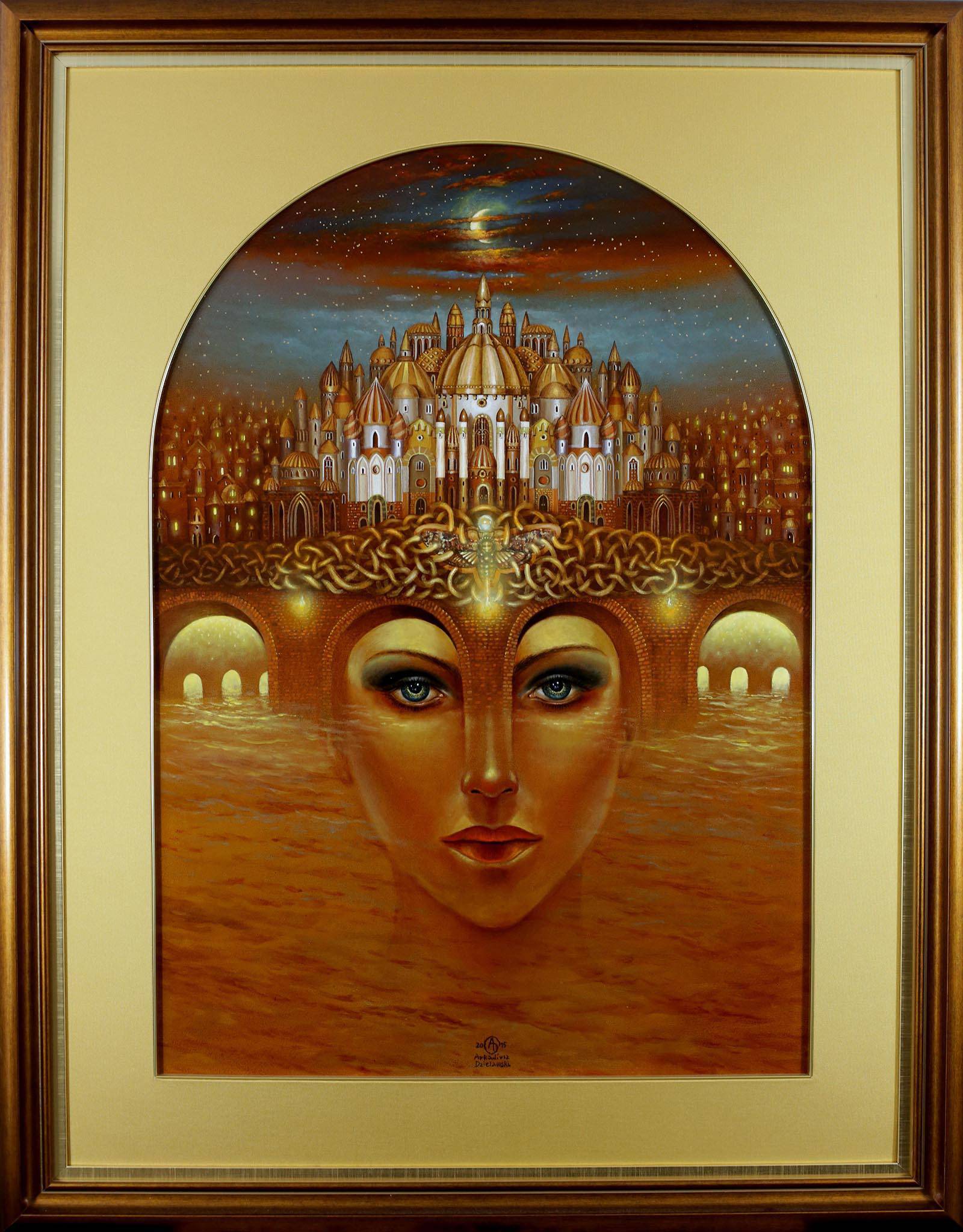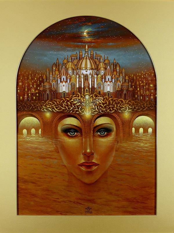 Obraz jest prawdziwie magiczny, a jego kolorystyka opiera się głównie na złotych i ciepłych odcieniach brązu. W centrum znajduje się majestatyczna twarz kobiety, której oczy hipnotyzują głębokim spojrzeniem. Nad nią, jakby z jej myśli, wyłania się fantastyczne miasto z kopułami i misteryjnymi wieżami, rozświetlone blaskiem nocnych gwiazd. Kompozycja jest harmonijna, a architektoniczne detale dodają surrealistycznego uroku. Atmosfera obrazu jest pełna tajemnicy, jakbyśmy zaglądali do świata snów. Jest coś nieuchwytnego, co skłania do zadumy i introspekcji. Technika artystyczna jest wyjątkowa; artysta zastosował subtelne gradienty i precyzyjne detale, które nadają dziełu głębię i teksturę. Użycie światła sprawia, że obraz zdaje się pulsować życiem. Można poczuć, jakby złoty blask dotykał naszej skóry. Emocje, które wywołuje ten obraz, są mieszanką zdumienia i niepokoju. Wywołuje on też takie uczucie, jakbyśmy stali na progu czegoś nieznanego. Dla niektórych może to być "wow moment", chwila, która na długo zapada w pamięć. Mam ochotę wpatrywać się w ten obraz godzinami, odnajdując za każdym razem coś nowego. A teraz sobie wyobraź, że to miasto opowiada swoją historię, jedną nocną przygodę. Czuć w tym wszystkim pewną "magiczną aurę", która jest nie do opisania słowami. Ciekawe, jakie sekrety skrywa ta twarz.