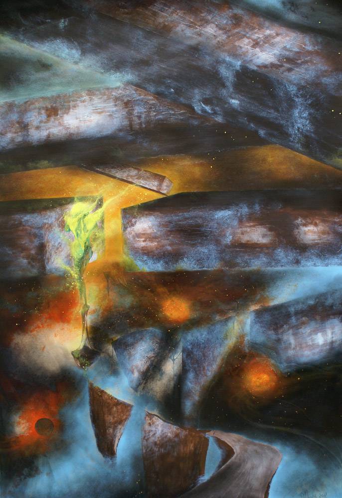 Obraz wybucha mieszanką barw i form, gdzie ciepłe pomarańcze i głębokie błękity zdają się tańczyć na płótnie. Kompozycja przywodzi na myśl abstrakcyjne pejzaże, w których dominują dynamiczne pociągnięcia pędzla. Na pierwszy plan wysuwa się zielony kształt, który niczym struga światła przebija się przez ciemną przestrzeń. Wygląda to trochę jak magia! Atmosfera jest tajemnicza i zagadkowa. Coś jak drzemiąca moc kosmosu. Artysta posłużył się mieszanką technik impresjonistycznych i surrealistycznych. Ślady pędzla są wyraźne, a farby mieszają się w nieprzewidywalny sposób, tworząc efekt głębi i ruchu. To tak, jakby obraz chciał opowiedzieć swoją własną historię. Można poczuć przekaz: coś się kończy, a coś zaczyna. Intryguje, prowokuje do myślenia. Każdy może zinterpretować ten obraz na swój sposób. Jedni mogą czuć się zainspirowani, inni może odrobinę zdezorientowani, ale w tym też tkwi jego urok, czy nie? Ta wszechogarniająca "mystery" sprawia, że nie sposób oderwać oczu. Artysta stworzył dzieło, które zaprasza do refleksji. I kto wie, może każda odpowiedź jest prawidłowa.