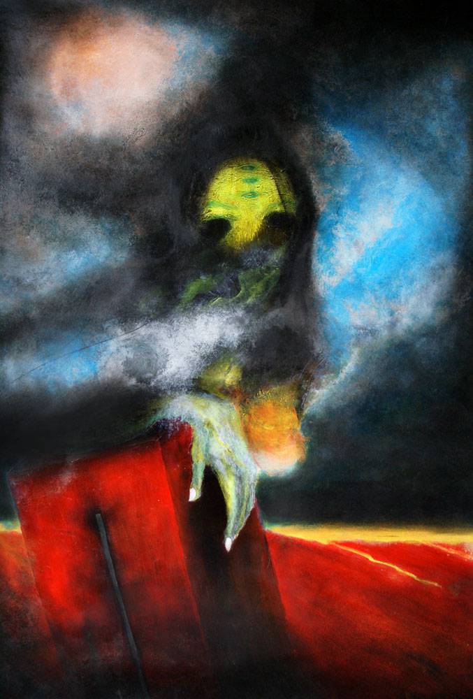 Obraz rozsiewa aurę tajemniczości i niepokoju, jakby z innego świata nalało się do naszego kawałek snu. Dominują ciemne barwy - czerń i granat, ale i żywiołowa czerwień, która wbija się w oko, tworząc mocny kontrast. W centrum widać jakby twarz, może maska, o dziwnie jaskrawej zieleni. Ręka wyłania się z tła, przyciągając uwagę, jakby chciała dosięgnąć czegoś poza ramą. It's kinda spooky! Wszystko otacza tajemnicza mgła, która unosi się jak duch. Styl jest surrealistyczny, z dużą dawką abstrakcji. Artysta zdaje się igrać z naszymi uczuciami, podsyłając nutę niepewności i zdziwienia. Czy to wizyta z innego świata? Można poczuć pewną grozę, ale i fascynację, jakby odkrywało się tajemne ścieżki wyobraźni. Technika malarska jest pełna energii, z wyrazistymi pociągnięciami pędzla, które tworzą dynamiczne ruchy. Myślę sobie, że to obraz, który każdemu opowie inną historię. Coś jak zgryw ze snem.