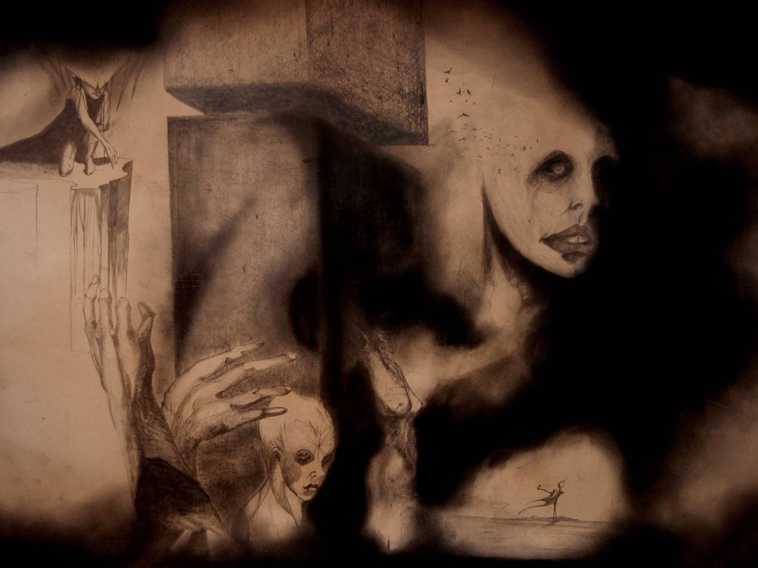 Obraz emanuje mroczną, nieco surrealistyczną aurą, w której czerń i szarość dominują, tworząc tajemniczy klimat. Rysunki widoczne na dziele zdają się być szkicowane ołówkiem, pełne są miękkich cieni i wyrazistych kontrastów. Postacie przedstawione na obrazie, a szczególnie duża, wyłaniająca się twarz o smutnych oczach, budzą uczucie niepokoju. Jakby coś było nie tak, jakby coś kryło się za rogiem. Kompozycja jest dynamiczna, ręce wyciągające się z różnych stron dodają niepokoju i napięcia, jakby próbowały coś złapać, coś ważnego. Artystycznie, obraz używa technik rysunku tradycyjnego, lecz sposób cieniowania i zastosowanie przestrzeni negatywnej potrafią wbić się w pamięć. Trochę jak puzzle, które próbujesz ułożyć, ale ciągle ci jakiś element ucieka. Atmosfera jest intensywna, full of mystery, momentami przytłaczająca. Intrygujący jest też mały, delikatny baletnicowy motyw na horyzoncie, który wprowadza subtelny kontrast do dominującej ciemności. "Jest tam duch!", powiedziałby pewnie siedmiolatek, patrząc na to dzieło. I coś by w tym było, bo obraz skłania do refleksji nad naszymi własnymi lękami i tajemnicami, które skrywamy. Moje emocje jako odbiorcy oscylują między fascynacją a lekkim strachem, bo dzieło jednocześnie przyciąga i odpycha. I to chyba jest jego największa siła.