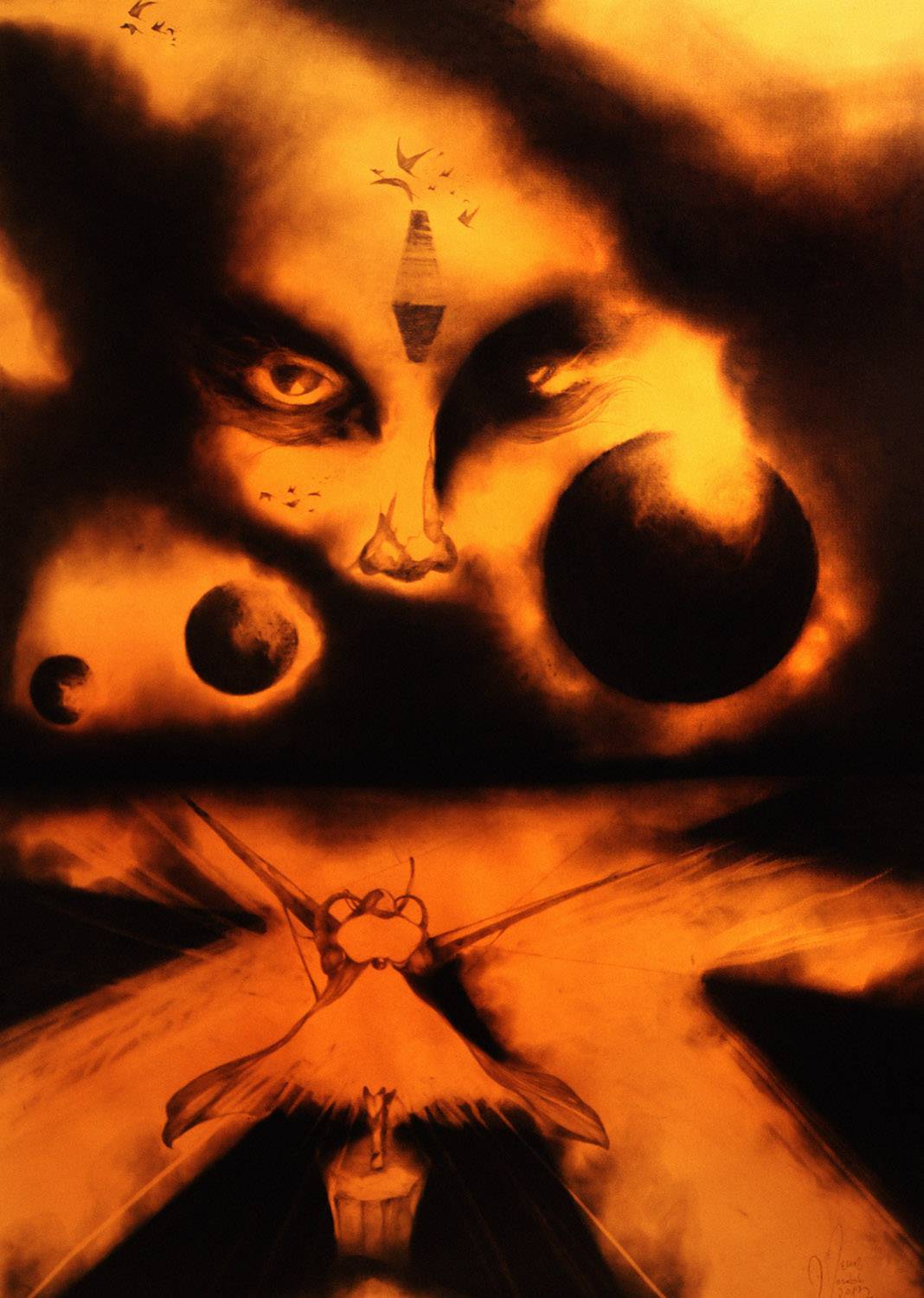 Obraz zanurza nas w niezwykły świat nostalgicznych barw i tajemniczego klimatu. Dominują tutaj odcienie pomarańczu i czerni, które tworzą hipnotyzującą kompozycję. Centralnym punktem są oczy, które zdają się przenikać i obserwować odbiorcę, podczas gdy w tle unoszą się abstrakcyjne formy przypominające planety. Wyraźnie widać dynamiczne linie, które nadają obrazowi rytm i energię. Styl artysty jest wyrafinowany, baśniowy, a techniki malarskie subtelne. Całość emanuje atmosferą zagadkowości, jakbyśmy zanurzali się w świat snu czy wyobraźni. Obraz budzi niepokój, a jednocześnie fascynację, pozostawiając nas z pytaniem o znaczenie przedstawionych postaci. Patrząc na ten obraz, czuję się jak dziecko odkrywające zupełnie nowy, magiczny świat. Wow, to jest takie piękne! Takie emocjonalne reakcje może wywołać, gdyż odwołuje się do naszej podświadomości, przypominając, jak ważne jest szukanie piękna w chaosie. Obraz jest jak sen, z którego nie chcemy się obudzić, pełen intensywnego koloru i symboliki. One word: mesmerizing.
