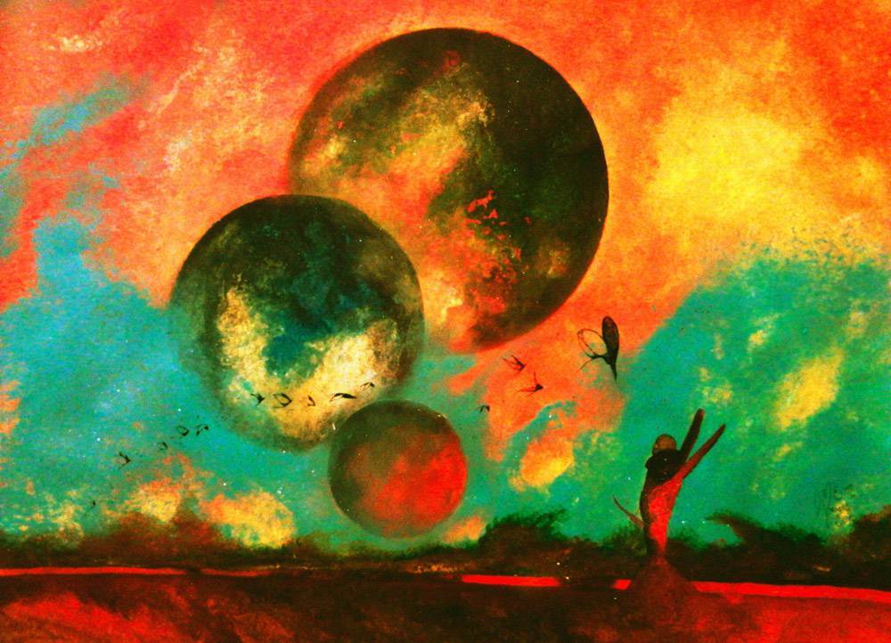 Ten obraz to prawdziwa eksplozja kolorów, które przyciągają wzrok jak magnes. Dominują na nim intensywne czerwienie i turkusy, które przeplatają się, tworząc dynamiczne tło. Pośrodku obrazu unoszą się trzy wielkie kule, które przypominają planety zawieszone w kosmicznej przestrzeni. Kule mają nieregularne, lekko zamglone kształty, które dodają dziełu nieco tajemniczej atmosfery. Dominujący nastrój to mieszanka chaosu i spokoju. Czy to ogień, czy bajkowe niebo – trudno powiedzieć, ale na pewno jest magiczne. Artysta używa techniki mieszania farb, co dodaje obrazowi tekstury i głębi. Może też wywołać uczucie uniesienia, trochę jak jazda na rollercoasterze, kiedy wszystko wokół się kręci. Patrząc na tę scenę, można poczuć ciekawość i chęć odkrycia, co kryje się poza tymi kulami. Postać na dole obrazu, z rękami uniesionymi wysoko, dodaje kompozycji dynamiki. Wygląda, jakby tańczyła w rytmie muzyki płynącej z samego obrazu. Jest tu coś z dziecięcej radości i beztroski. „Lubię kolory, bo są takie fajne!” – mógłby powiedzieć 7-latek patrząc na ten obraz. Obraz inspiruje do refleksji, do myślenia o nieskończoności świata. Czy to jest science fiction, czy może coś z głębi snu? Jest po prostu "amazing". Detale są na tyle niejednoznaczne, że mogą wyzwalać indywidualne interpretacje. Nawet jeśli nie wszystko jest jasne jak słońce, to przecież sztuka ma czarować i budzić wyobraźnię.