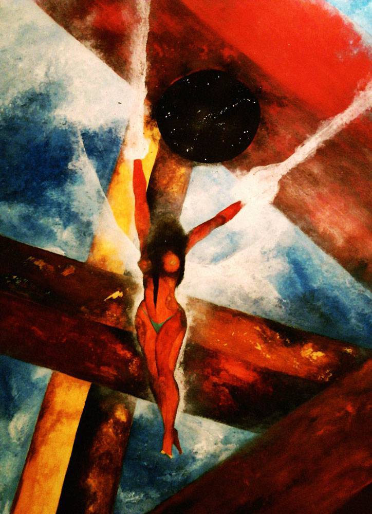Obraz hipnotyzuje swoją dynamiczną kompozycją i intensywnymi barwami. Dominują jaskrawe odcienie czerwieni i niebieskiego, które przeplatają się w spiralnym splocie. Centralnym punktem dzieła jest postać kobiety, która zdaje się unosić, jakby była częścią jakiegoś magicznego rytuału. No i wow! Jej ciało zostało ukazane z niezwykłą płynnością i siłą, a kontrastujące z tym ciemne tło tworzy aurę tajemniczości. Atmosfera obrazu jest pełna napięcia i energii. Czujemy jakby wszystko dookoła pulsowało. Artysta zastosował techniki, które przypominają akwarelę, dodając delikatności i efemeryczności do całej sceny. Pociągnięcia pędzla są odważne, pełne pewności i żywiołowości. Dzieło prowokuje do interpretacji. Można poczuć tutaj walkę między światłem a ciemnością, jakby postać była rozpięta między dwoma światami. A może to symbolizuje przełom, zmianę? Osobiście wzrusza mnie to, bo widzę tu odzwierciedlenie własnych zmagań. It's like a personal journey. Patrząc, czuję przypływ adrenaliny, ale też pewną melancholię. Obraz jest jak otwarta książka. Dla każdego opowiada inną historię. Dla mnie to opowieść o odwadze i poszukiwaniu swojego miejsca w chaosie świata.