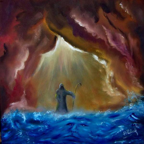 Obraz przedstawia tajemniczą scenę utrzymaną w ciemnych, dramatycznych barwach. Dominuje tu głęboki błękit fal na pierwszym planie, które dynamicznie kontrastują z ciemnymi, ziemistymi odcieniami jaskini w tle. Centralna postać zdaje się kroczć pewnym krokiem ku światłu, które śmiało rozświetla wnętrze, dodając kompozycji mistycyzmu. Sposób, w jaki artysta stosuje światło, jest wyjątkowo intrygujący. Maluje tak, jakby promienie słońca były żywiołem same w sobie, przecinając ciemność w spektakularny sposób. Atmosfera obrazu jest mieszanką grozy i fascynacji. Czujesz, że coś niesamowitego zaraz się wydarzy. Technika impasto dodaje tekstury, podkreślając dynamikę fal i przestrzeń. Widok wywołuje różnorodne emocje: od niepokoju po zachwyt. Dzieciak powiedziałby: "Tam jest czarodziej i on zaraz zrobi czary!" A ja się zastanawiam, co kryje się za tą jaskinią. Może to metaphor for life's journey? Emanuje z tego obrazu poczucie przygody, tajemnicy, jakbyś stał na progu nieznanego świata.