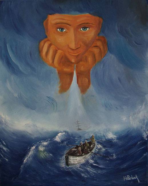 Na obrazie dominują intensywne odcienie niebieskiego i białe fale, które burzliwie unoszą małą łódkę z kilkoma ludźmi. Na niebie widnieje ogromna twarz, która zdaje się obserwować scenę z góry. Jej duże niebieskie oczy przyciągają wzrok, a uśmiech wydaje się być ciepły i tajemniczy. Obraz ma niesamowity, dreamlike klimat, jakby pochodził z fantazji albo snu. Artysta zastosował techniki olejne, tworząc dynamiczne pociągnięcia pędzla, które nadają wodzie ruch. Twarz jest bardziej statyczna, co kontrastuje z burzliwym morzem i może symbolizować spokój w chaosie. Wywołuje to uczucie jednoczesnego zaskoczenia i fascynacji. Jakby ktoś z góry czuwał nad żeglarzami, ale nie do końca wiemy, czy ich chroni, czy tylko obserwuje. Czy to opowieść o przygodzie, czy może alegoria życia i jego niespodzianek? Patrzyłam na to i pomyślałam, wow, jak ten obraz potrafi zaczarować. Dla dziecka te emocje mogą wyglądać jak magiczna podróż. W końcu, na morzu zawsze można poczuć ten przypływ "freedom". Obraz może przypomnieć o siłach natury, które są większe od nas, ale pokazuje też, że jest w tym jakaś niesamowita harmonia.