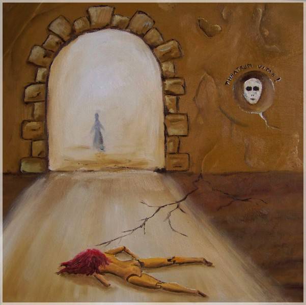 Ten obraz emanuje tajemniczością i niepokojem. Na pierwszym planie widzimy manekina z rozczochranymi włosami leżącego nieruchomo na ziemi, przypominającego postać z marionetki, co budzi skojarzenie z kruchością i bezradnością ludzkiej egzystencji. Ciepłe, brązowe tony dominują kompozycję, nadając jej archaiczny wygląd. Cień, jakby pojawiający się z innego wymiaru, zamyka się nad postacią w oddali, co może symbolizować nieuchronność losu albo drzwi do nieznanego świata. Muralowy styl obrazu i grubo nałożona farba przyciąga uwagę, tworząc wrażenie surowości i ciężkości. Ta scena jest jak z horroru. Na ścianie wmurowana maska otoczona napisem "THÉÂTRUM VITAE" sugeruje teatralność życia, jakby osooby były jedynie kukiełkami w większej grze. Wzrok przyciąga również delikatna pajęczyna pęknięć na powierzchni, przypominająca o kruchości naszych planów. Moje serce trochę przyspiesza na widok tej kompozycji, bo przypomina, że życie pełne jest niepewności i niewiadomych. Ten obraz to prawdziwy "enigma".