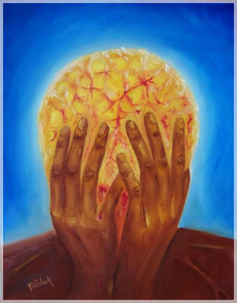 Na obrazie widzimy ręce przyciśnięte do jaskrawo żółtej kuli, przypominającej mozaikę lub rozżarzoną planetę. Tło to głęboki, nasycony błękit, który pięknie kontrastuje z ciepłem głównego motywu. Obraz jest zbudowany z wyraźnych kształtów, a dominująca kolorystyka przyciąga oko niczym magnes. Atmosfera jest pełna tajemnicy i czegoś nieuchwytnego. To trochę jak zagadka, którą trudno rozwiązać, ale intryguje i wciąga. Artystyczne podejście autora jest tchnieniem nowoczesności – widać tu elementy surrealizmu. Realistyczne detale rąk kontrastują z abstrakcyjnym przedstawieniem kuli. Technika? Jakby zrozumienie świata wymykało się spod pędzla. Struktura plam na kuli przypomina subtelne przenikanie się światła i cienia, co dodaje głębi i skomplikowanej prostoty. Patrząc na ten obraz, można poczuć mieszankę fascynacji i niepewności. Jakbyśmy zaglądali do wnętrza siebie. Dzieciak by powiedział: „To jest wielka żółta piłka”. Takie human connection, które trudno wyrazić słowami. Wydaje się, że dzieło zaprasza do osobistej refleksji nad naszą emocjonalną i duchową rzeczywistością. Intymność i otwartość jednocześnie, wow.