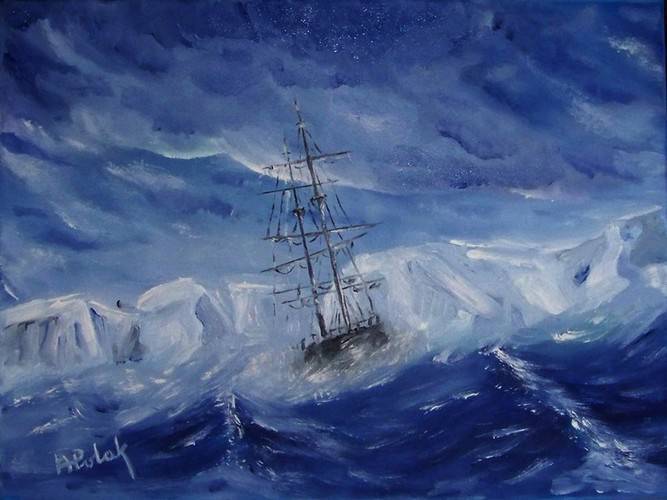 Na obrazie widzimy żaglowiec zmagający się z potężnym oceanem. Całość utrzymana jest w chłodnej palecie błękitów i szarości, co nadaje scenie dramatyczny, niemalże groźny nastrój. Fale zdają się gryźć brzeg statku, a niebo nad nim pełne jest burzowych chmur, które zwiastują niebezpieczeństwo. Kompozycja skupia się na centralnym umiejscowieniu statku, co dodatkowo podkreśla jego samotność i kruchość w obliczu żywiołu. Artysta zastosował technikę impastu, co można dostrzec w dynamicznych pociągnięciach pędzla sugerujących ruch i siłę fali. Dzięki temu obraz wygląda na żywy, niemalże kipi energią. Jest tu pewien kontrast między spokojem przyczajonym w tle a gwałtownością pierwszego planu. Obraz ten może wywoływać w widzu uczucie niepokoju, ale i fascynacji naturą – jej nieprzewidywalnością i pięknem. Jak dla mnie, to takie „wow”, kiedy patrzę na te fale, nie? Można poczuć się jak pirat, który mierzy się z przygodą swojego życia. Dla dziecka ten obraz to może być: statek płynie i fale są duże. W całym chaosie kryje się jednak pewien harmoniczny rytm, co robi go bardzo engaging dla odbiorcy.