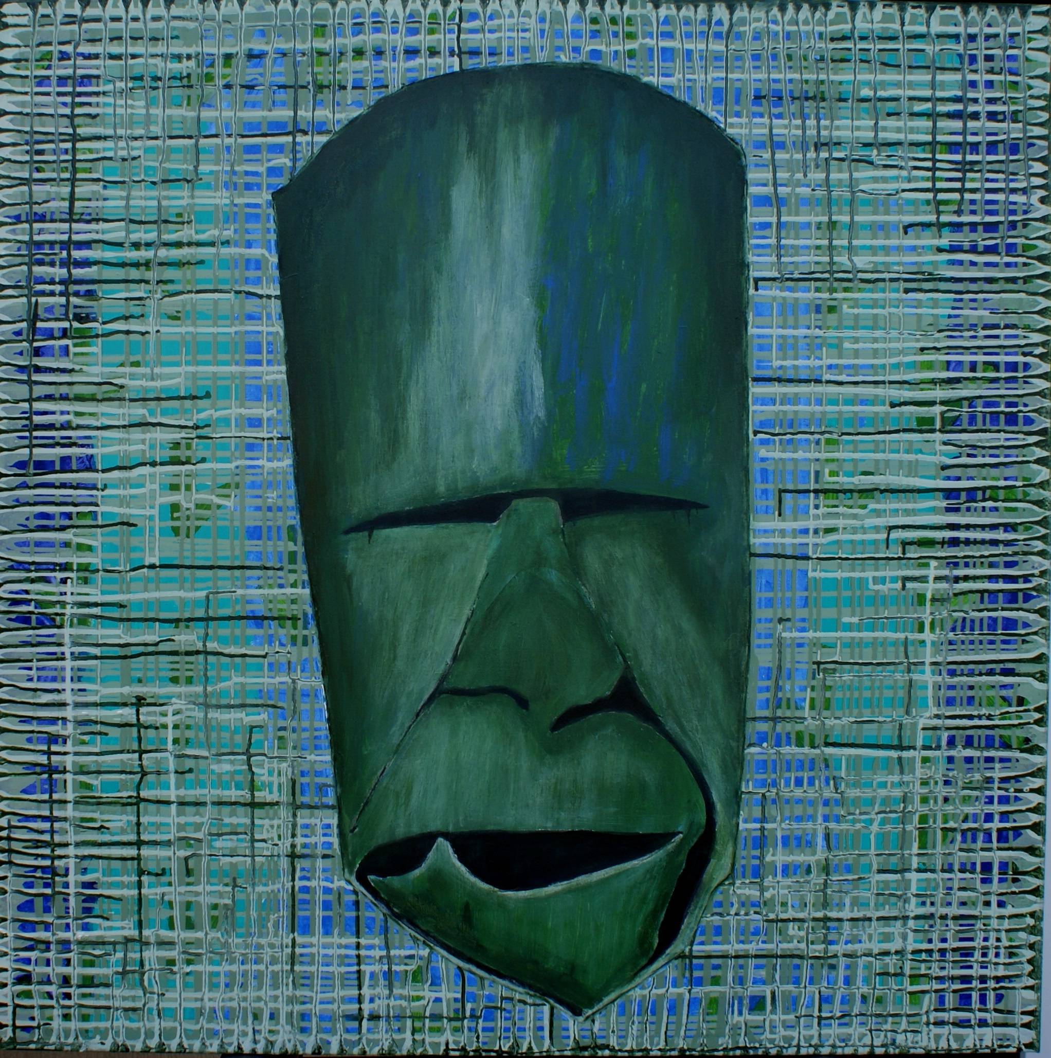 Na obrazie dominuje tajemnicza, zielona maska, której masywne kontury wyróżniają się na tle geometrycznej, kratkowej sieci w odcieniach błękitu i zieleni. Struktura siatki przypomina delikatnie utkany gobelin, otaczając maskę jak nierozerwalna sieć pajęcza. Kolory są chłodne, co wprowadza atmosferę spokoju i może nawet lekkiego niepokoju. To trochę jak zimny powiew w letni wieczór. Styl artystyczny łączy w sobie elementy abstrakcji z surrealizmem, tworząc intrygujący dialog między formą a przestrzenią. Artysta z wielką precyzją nałożył farby, co sugeruje technikę impasto, dodając głębi i tekstury. Maska zdaje się patrzeć w głąb duszy oglądającego, co może wywołać różne emocje – od zaciekawienia po niepewność. Jest jak postać z bajki, ale z lekkim twistem. „Czy to maska z bajki?” zapytałoby dziecko. To dzieło sprawia, że człowiek się zatrzymuje, myśli, mruży oczy, szukając sensu w chaosie linii. Odbiorca może poczuć się jak eksplorator na nieznanym terytorium imaginacji. Ten obraz to naprawdę coś, co można by określić jednym słowem: mesmerizing. Personalnie, czuć tu pewną melancholię jak podczas deszczowego dnia, gdy siedzisz przy oknie i obserwujesz krople deszczu spływające powoli po szybie. Wciągające i niepokojące jednocześnie.