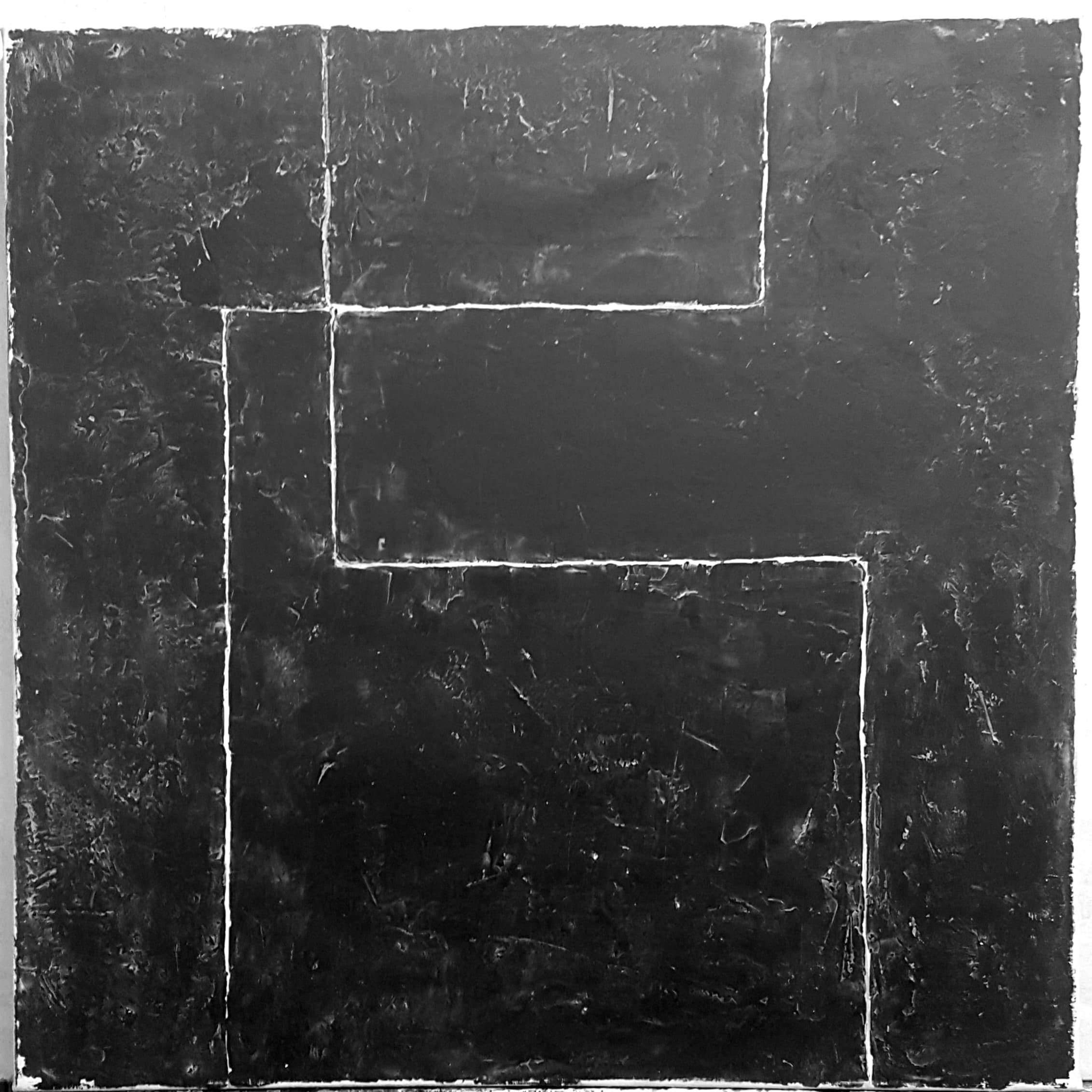Na tym obrazie dominuje czarność, która wciąga wzrok w głębiny nieznanego. Kompozycja jest geometryczna, przypominając labirynt prostokątnych kształtów, które łączą się w coś większego niż suma ich części. Kolory są stłumione, a tekstura powierzchni wydaje się chropowata, jakby artysta wydrapał coś z głębi swojej duszy. Nastrój tego dzieła można opisać jako enigmatyczny, niemal hipnotyczny, a nawet trochę niepokojący. Styl jest minimalistyczny, ale nie pozbawiony dramatyzmu, a technika – surowa, bez zbędnych ozdobników. Dla niektórych ten obraz może wywoływać poczucie przytłoczenia, dla innych – ciekawość. Ciekawe, że takie proste formy mogą wzbudzać tak różnorodne emocje. Może to jest właśnie magiczne w sztuce: "Ciemność chyba ma sekret". Szczerze, patrząc na to, można poczuć nutkę zakłopotania, ale i fascynacji. Jeden rzut oka i się czujesz jak w filmie noir, gdzie wszystko jest "mysterious". Ten obraz, mimo swojej prostoty, zachęca do refleksji i stawia pytania, a przecież to właśnie czyni sztukę żywą.
