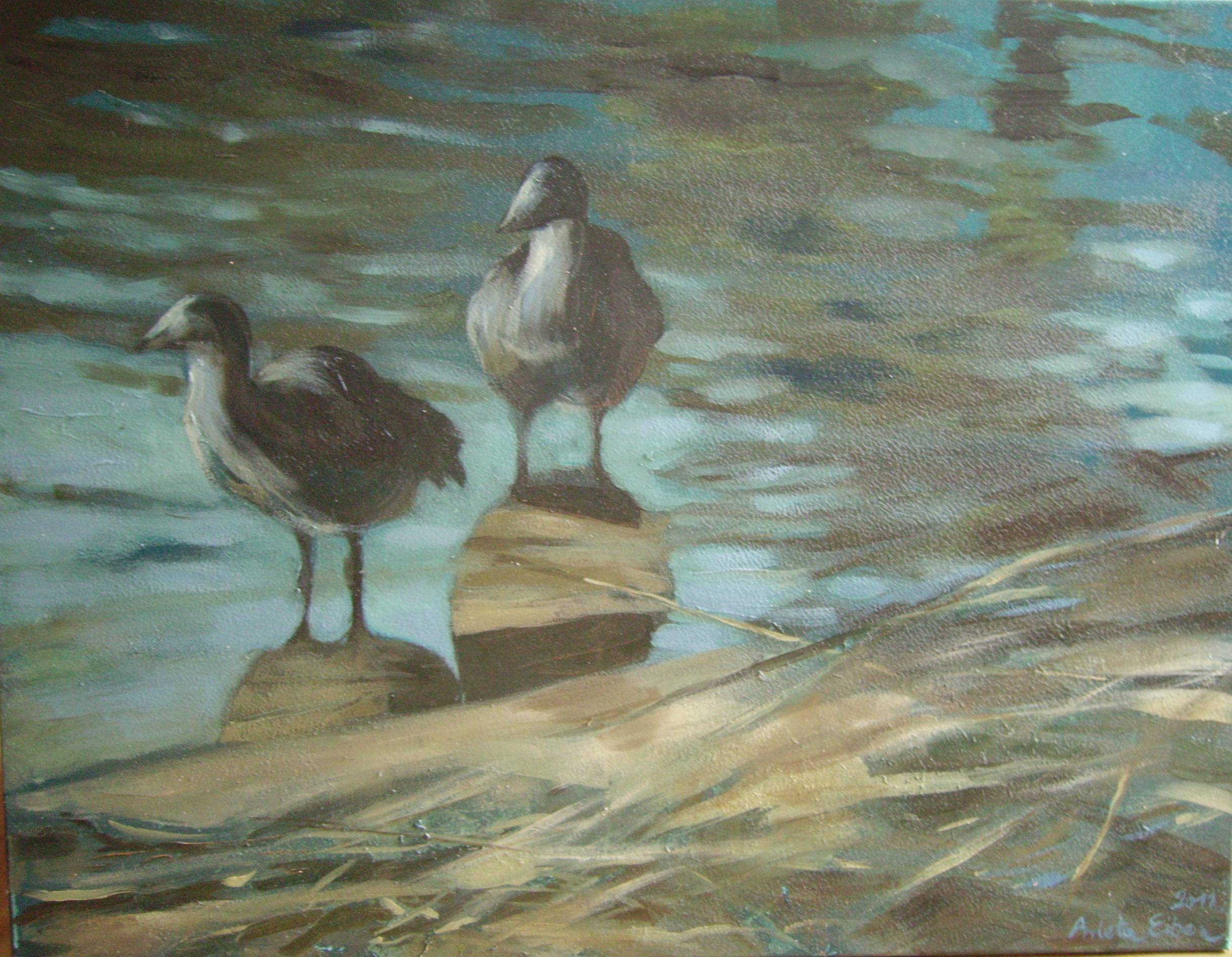 Na obrazie przedstawiono dwa ptaki stojące na brzegu, które zdają się kontemplować spokojną taflę wody. Dominują tu stonowane kolory, głównie zielenie i brązy, z delikatnym akcentem błękitu odbitego na powierzchni wody. Kompozycja jest wyważona; centralne umiejscowienie ptaków przyciąga wzrok, a ich lekkie rozmycie nadaje dynamizmu. Atmosfera obrazu emanuje spokojem i refleksją. Jest taki chill, który mocno przyciąga. W tym malunku można wyczuć impresjonistyczne wpływy – szybkie pociągnięcia pędzla, które tworzą lekko rozmyty efekt. Całość wydaje się migotliwa jak wspomnienie z letniego dnia nad jeziorem. Patrzysz na te ptaki i myślisz sobie: "Czy one też marzą?". Kiedy dziecko spojrzy na to, może powiedzieć: "Te ptaszki są smutne bez przyjaciół!". Obraz wciąga jak dobry book, dając pole do różnych interpretacji. Może wzbudzić w nas tęsknotę za wolnością, czystą radość bycia tu i teraz. Urokliwie niepozorny, na pewno zostaje w pamięci.