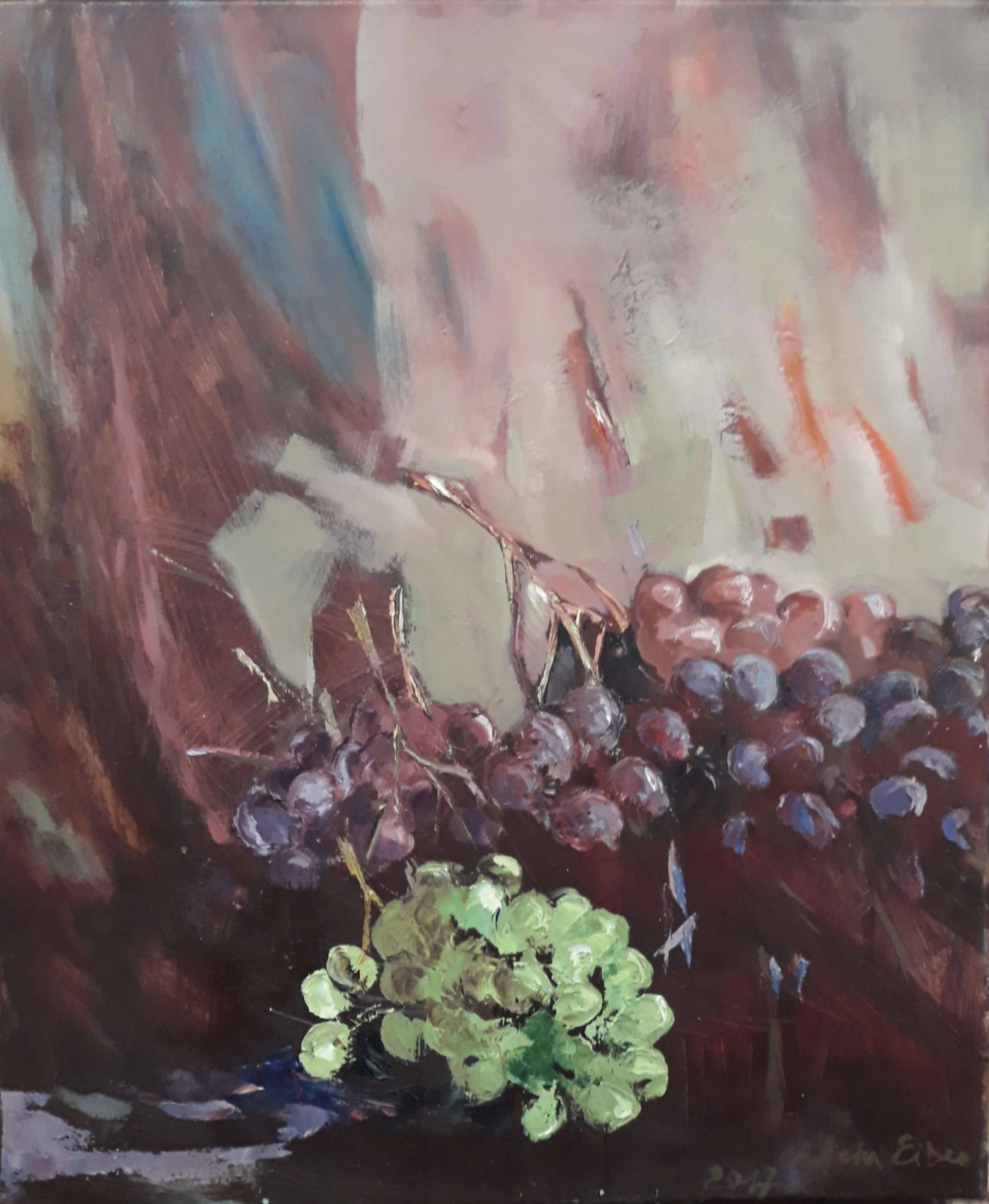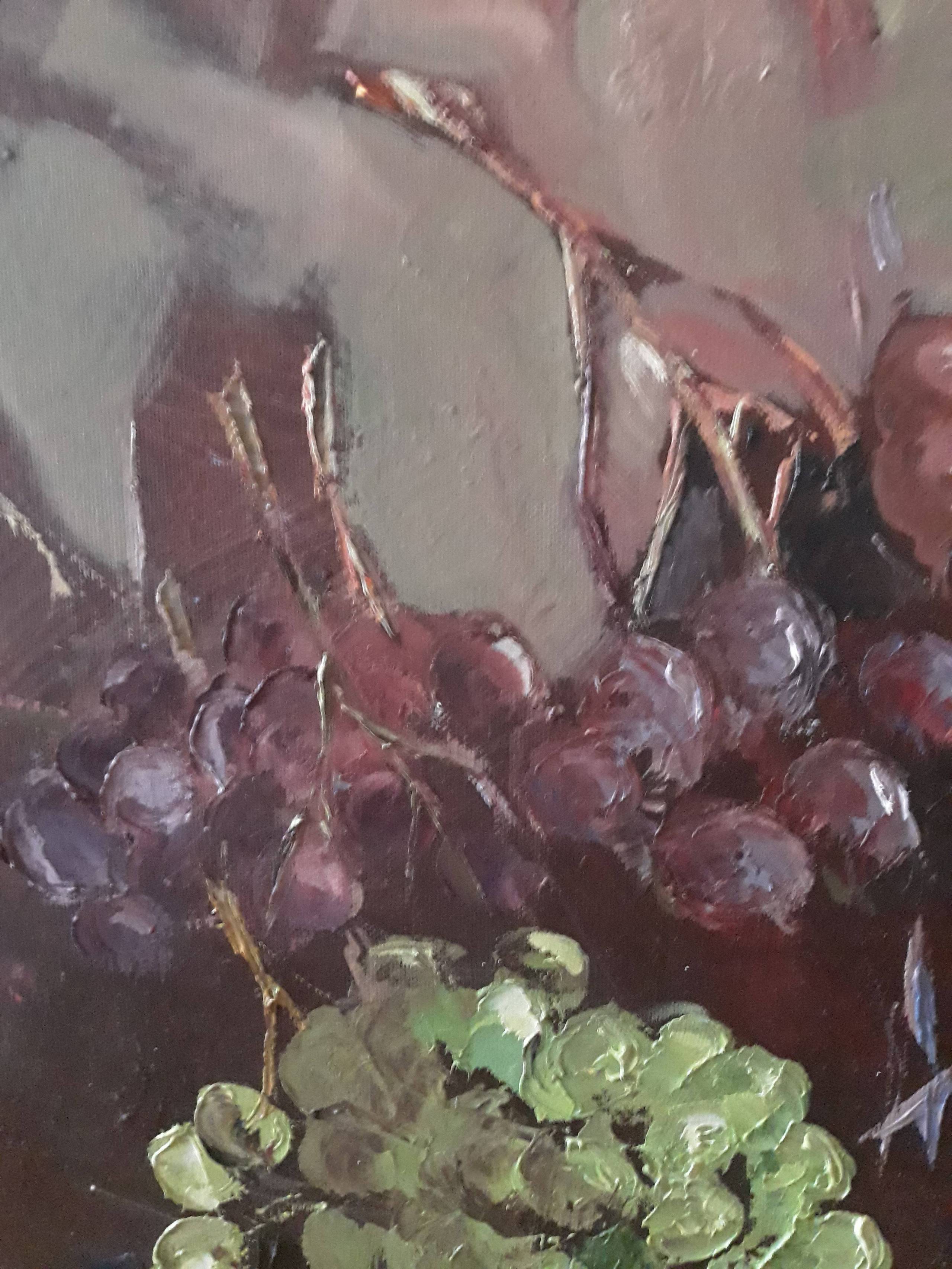 Na obrazie widzimy kolorową kompozycję martwej natury, złożoną głównie z kiści winogron w odcieniach zieleni i purpury. Tło jest zamglone, barwy mieszają się ze sobą, tworząc efekt półprzezroczystości i delikatności. Przenikające się smugi brązu i niebieskiego wydają się tańczyć w tle obrazu, dodając mu dynamizmu. Atmosfera dzieła jest spokojna, nostalgiczna, jakby zatrzymana w czasie. Użyta technika przypomina impresjonistyczne podejście, gdzie szybkie pociągnięcia pędzla i swobodna gra kolorów tworzą emocjonalną głębię. Można odczuć ciszę dojrzałego letniego popołudnia. Dzieciak powiedziałby: "Mniam, lubię zielone winogrona!". Obraz wywołuje poczucie przyjemnej melancholii, widz może poczuć zapach dojrzałych owoców. Touch of nostalgia sprawia, że chce się zanurzyć w tej chwili jeszcze głębiej. Łączące się barwy i cienie dodają jego kompozycji tajemniczości i magii. To sztuka, która z pewnością skradnie serce każdego amatora sztuki martwej natury. wyjątkowy sposób inspirowany klasyką.