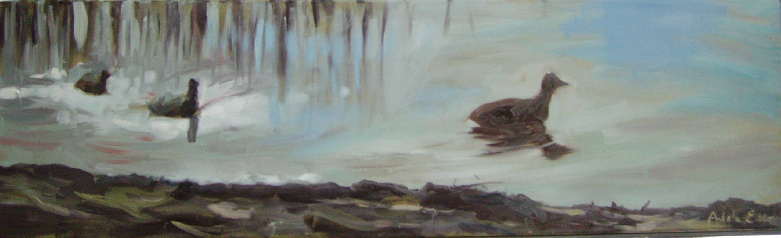 Obraz przedstawia spokojną scenę na stawie, gdzie widać dwie kaczki pływające w wodzie o odcieniach szarości i błękitu. W tle widać delikatne odbicia drzew. Kolory są stonowane, z przewagą brązów, beży i zieleni, co nadaje kompozycji melancholijny, prawie nostalgiczny nastrój. Kiedy patrzę na ten obraz, czuję się jakbym szedł na spacer w chłodny poranek. Jest cicho. Styl artysty jest impresjonistyczny, z wyraźnym naciskiem na atmosferę i nastrój chwili. Pociągnięcia pędzla są dynamiczne, co dodaje żywotności i ruchu wody. Można zauważyć technikę rozmycia, która nadaje scenerii subtelność i delikatność. Taki obraz może wywoływać u odbiorcy poczucie spokoju, ale także refleksji nad przemijaniem i pięknem prostych chwil. Dziecko mogłoby powiedzieć: "Kaczki są super, pływają i pływają!". Ta scena przypomina mi moje dziecięce eskapady nad jezioro, te chwile, kiedy słońce jeszcze śpi, a natura budzi się powoli. To mnie uspokaja. Czasem tak niewiele potrzeba, żeby poczuć, że wszystko jest w porządku. To uczucie, kiedy patrząc na obraz czujesz "serenity", zrozumienie świata w jego najbardziej naturalnej postaci.