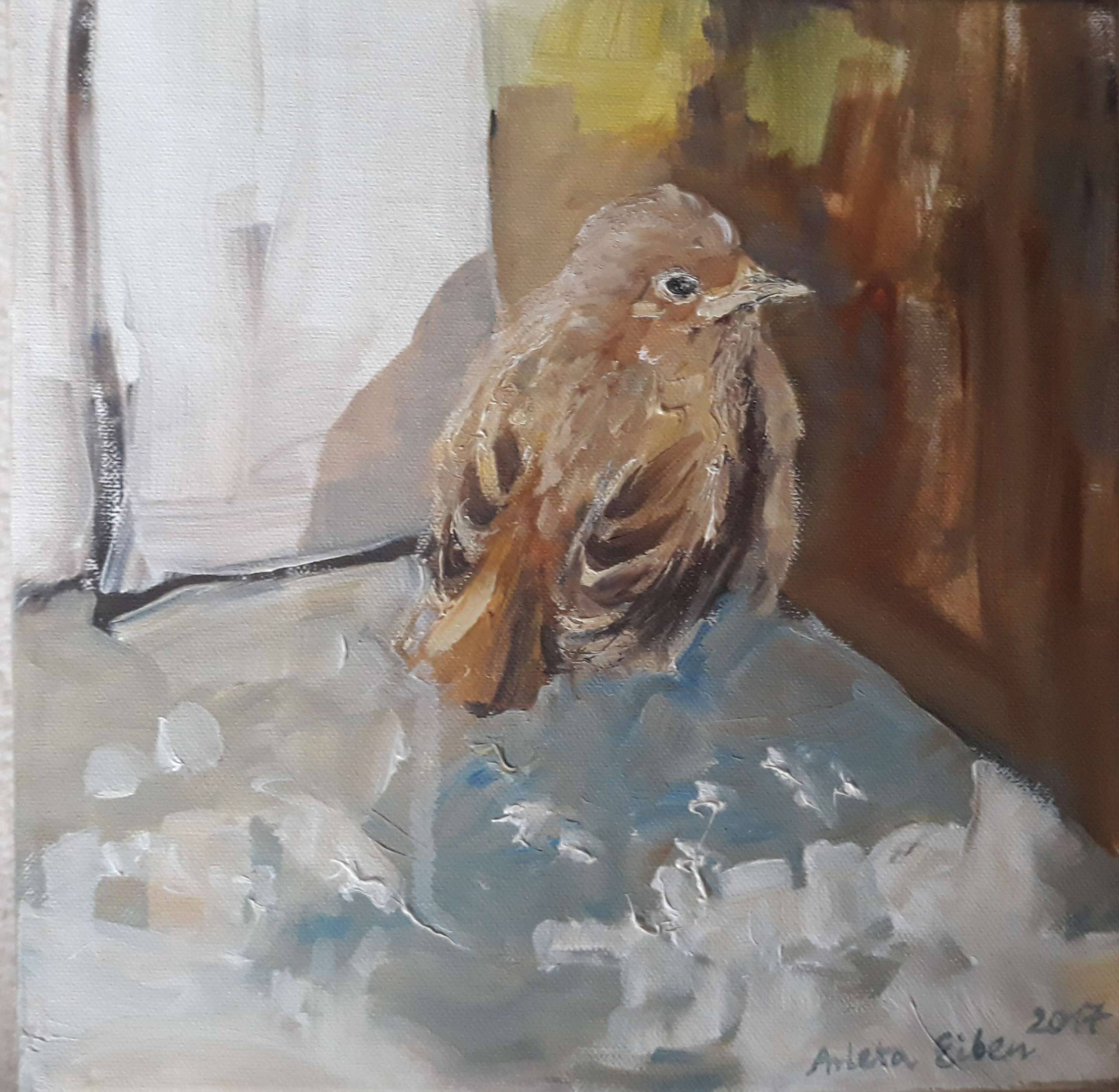 Na obrazie widzimy małego ptaszka, który siedzi przy ścianie. Jego pióra, w odcieniach brązu i beżu, oddają miękkość i ciepło. Tło jest dość neutralne, z bielami i szarościami przenikającymi się z delikatnymi cieniami. Kompozycja skupia się na tym jedynym punkcie, jakim jest ptaszek, sprawiając, że reszta wydaje się być lekko rozmyta, jakby w oddali. Atmosfera obrazu jest cicha, pełna spokoju. Artystyczny styl realistyczny z nutą impresjonizmu sprawia, że pędzle tworzą dynamiczne ruchy, nadając żywotności. Patrząc na ten obraz, można poczuć melancholię i delikatność, jakby ptaszek szukał schronienia. A może on po prostu zgubił się i czeka na swojego przyjaciela. "Ten ptaszek na pewno jest głodny" – takie myśli mogłoby przyjść do głowy maluchowi. Kolory obrazują ciepło domowego ogniska mixed z chłodem zewnętrznego świata. Patrząc na niego, czuję przypływ czułości i pragnienia, by chronić to maleństwo. To dzieło naprawdę touch my heart.