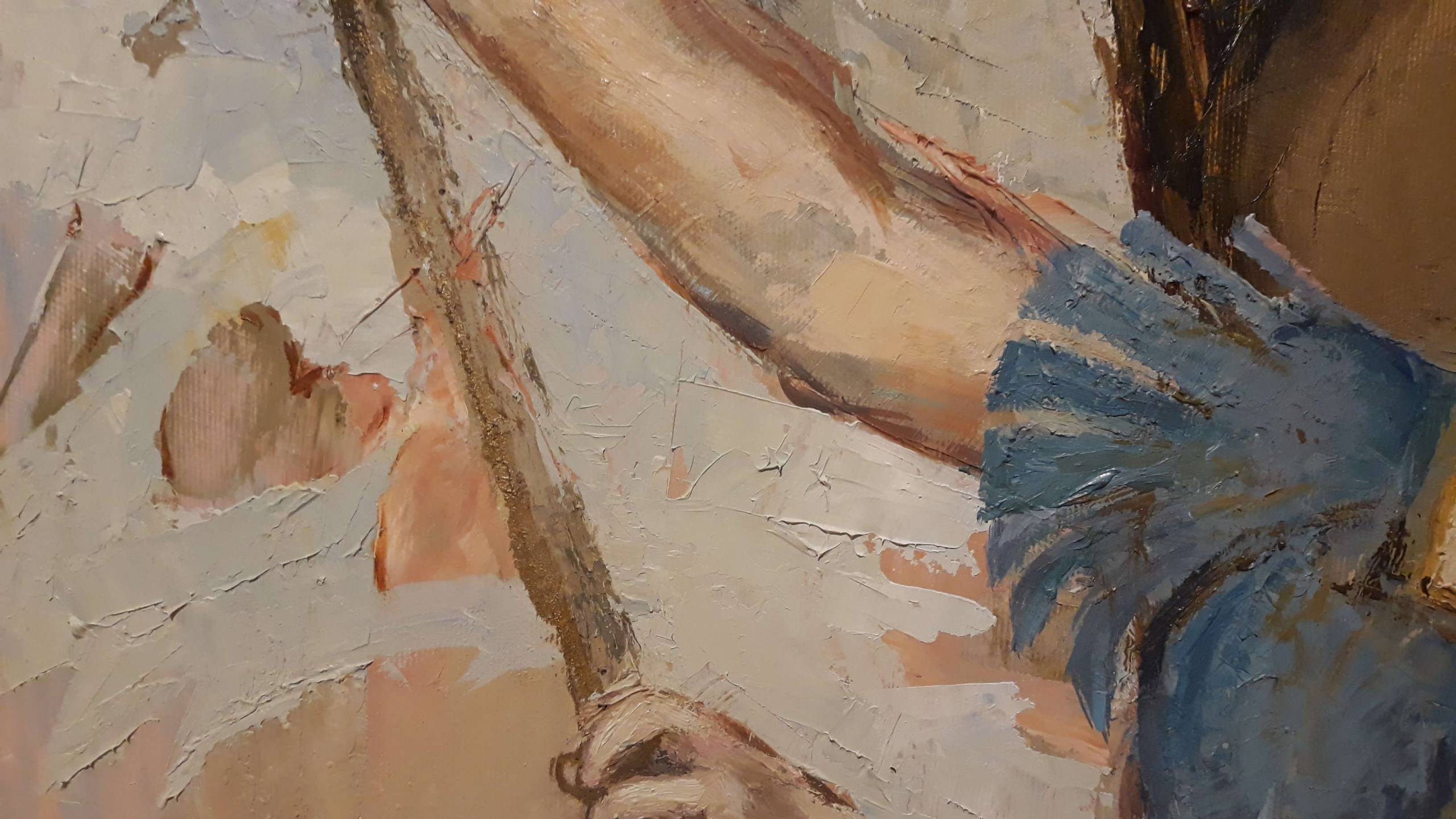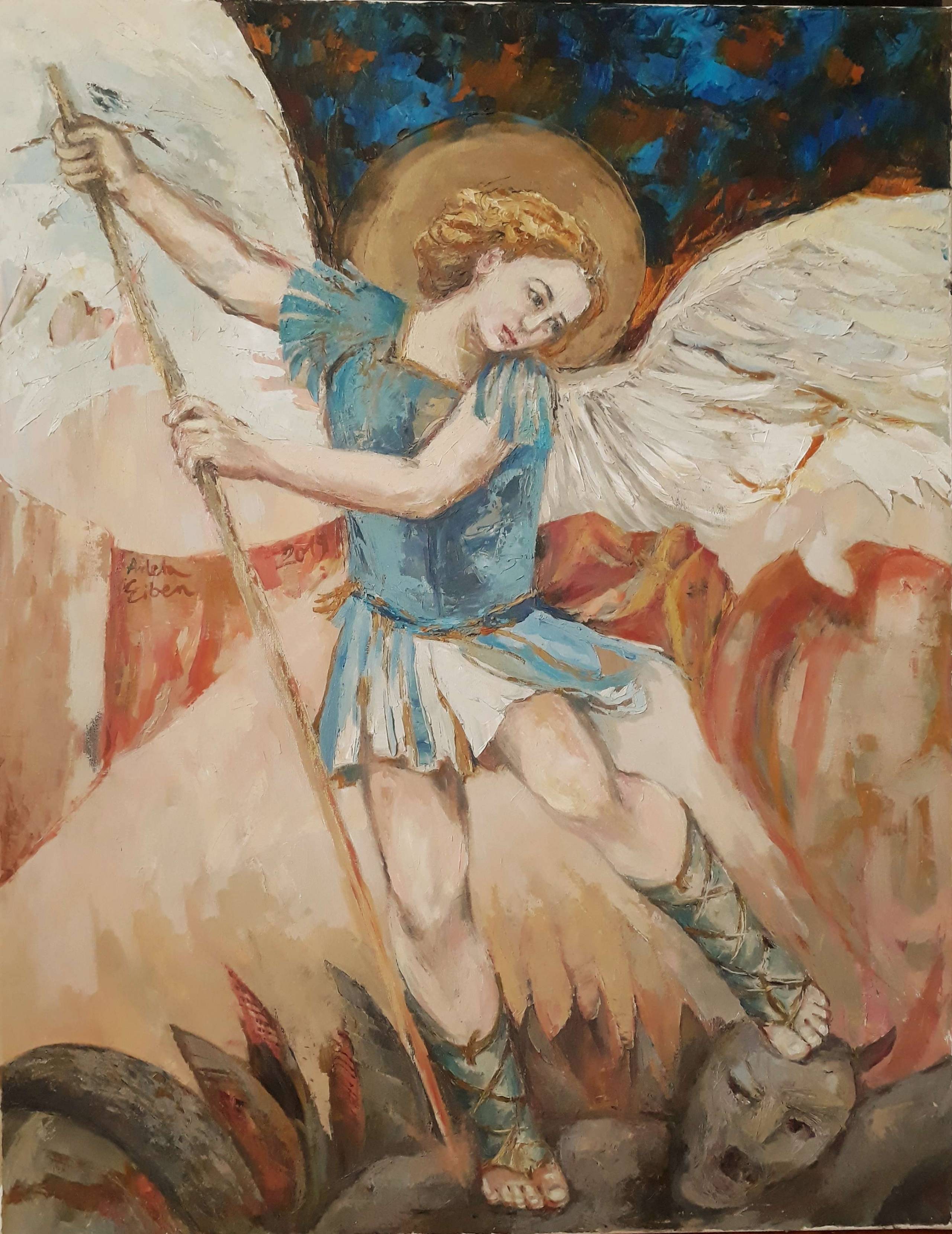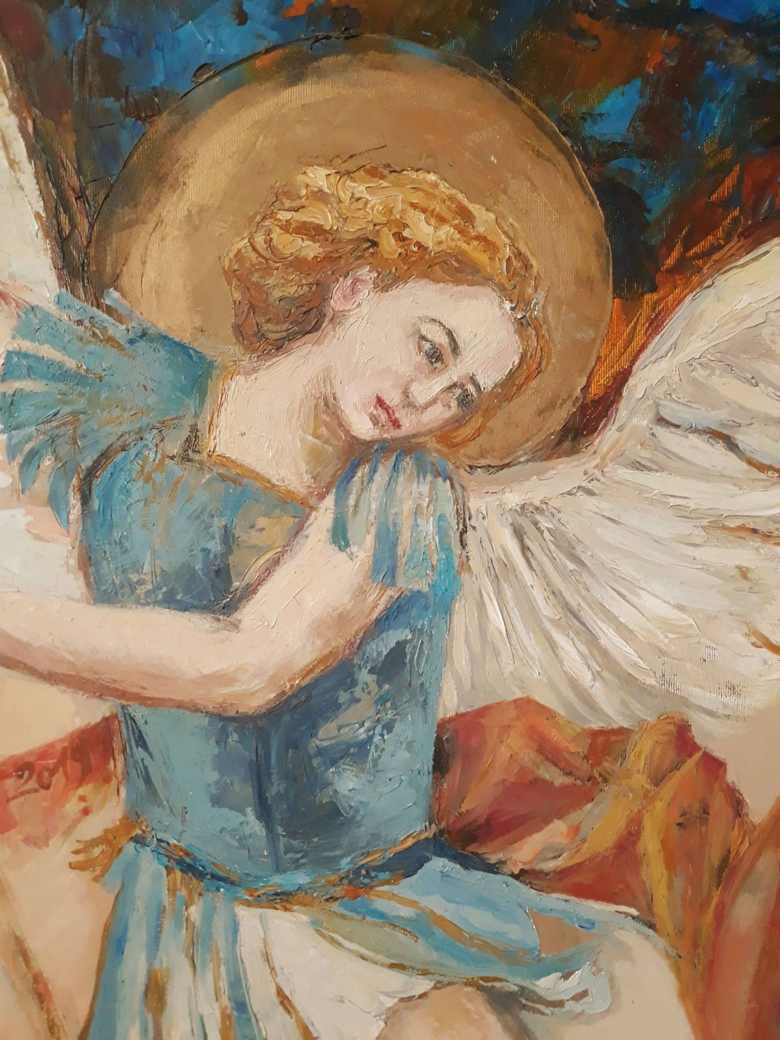 Obraz przedstawia postać anioła, otoczoną aurą mistyczności i siły. Skrzydła są gigantyczne, białe jak śnieg, rozłożone majestatycznie, jakby chciały przytulić cały świat. Anioł ubrany jest w niebieską tunikę, która kontrastuje z ciepłymi, złotymi tonami tła. W dłoni dzierży włócznię, która nadaje mu wygląd wojownika. Jasne loki otacza aureola przywodząca na myśl spokój i ochronę. Światło na obrazie jest delikatne, sączy się miękko przez malarskie pociągnięcia pędzla, tworząc atmosferę pełną napięcia, ale i nadziei. Technika malarska zdaje się być impresjonistyczna, z wyraźnymi śladami pędzla, które oddają ruch i emocje. Patrząc na ten obraz, trudno nie poczuć dreszczu na plecach. To jak spotkanie z dawnymi legendami, gdy dobro triumfuje nad złem. Dziecko powiedziałoby: "aniołek walczy z potworem". Ten obraz jest jak opowieść o walce i zwycięstwie. Moje serce bije szybciej, gdy go oglądam. To prawdziwy "power", który niesie przesłanie wiary i odwagi. Idealny na chwilę zadumy nad tajemnicą ludzkiej duszy i niebios.
