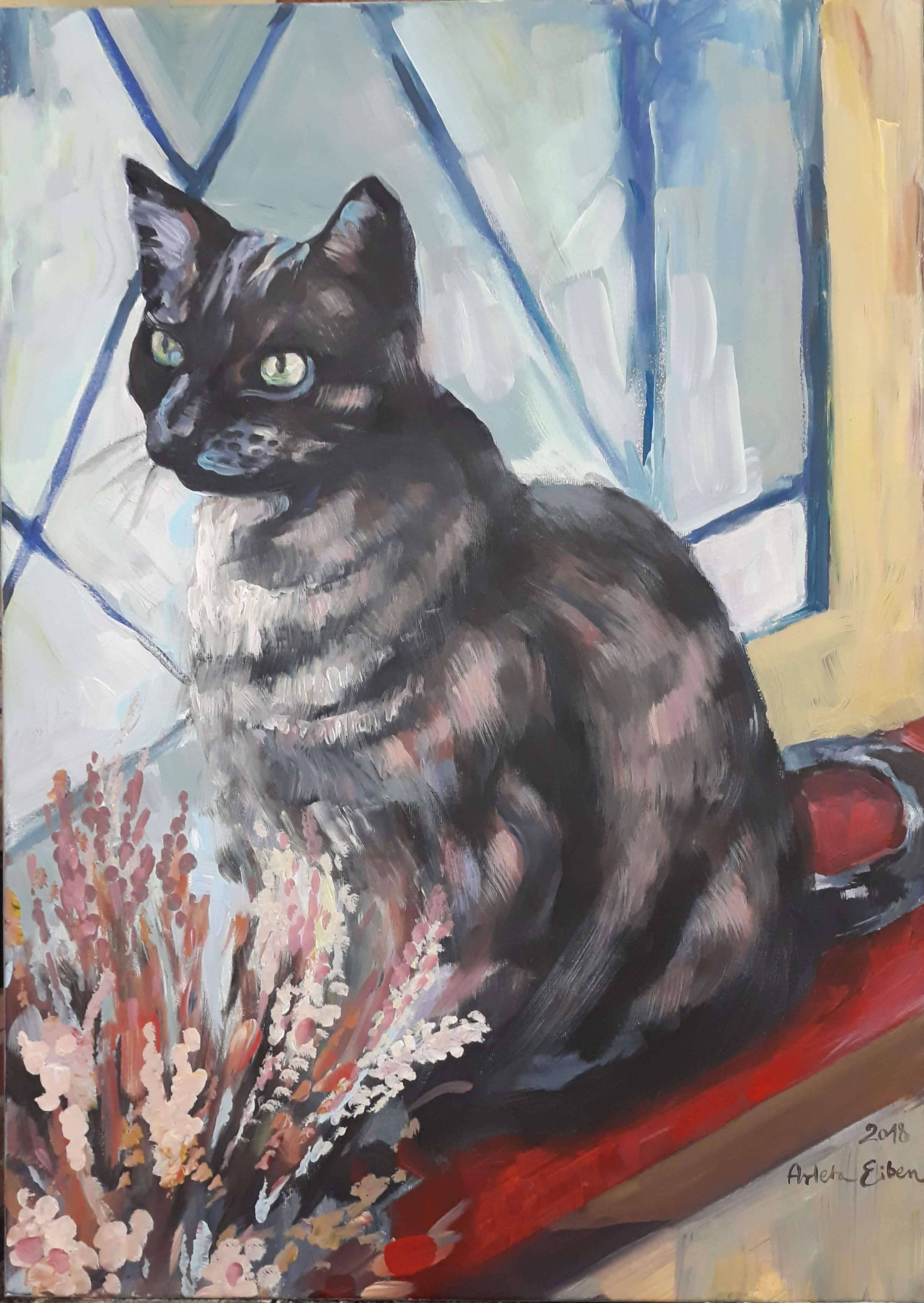 Na obrazie widzimy kota o głębokim, tajemniczym spojrzeniu, siedzącego na parapecie. Jego sierść jest pełna kontrastów, miesza się w niej głęboka czerń z subtelnymi odcieniami szarości. W tle artysta zastosował pastelowe barwy nieba i ścian, co kontrastuje z wyrazistymi konturami kota. Całość utrzymana jest w nieco impresjonistycznym stylu, gdzie pociągnięcia pędzla są wyraźne i dynamiczne. Patrząc na tę scenę, można niemal poczuć ciszę i spokój popołudnia. Kot patrzy przed siebie, jakby rozważał tajemnice świata. Kolory kwiatów na parapecie dodają lekkiej, wesołej nuty. Obraz emanuje magiczną atmosferą i zachęca do zadumy. Artysta z wprawą operuje światłem, tworząc subtelne cienie, które dodają realizmu. Jest coś niezwykle intymnego w sposobie, w jaki ukazany jest ten koci duma. Dla mnie to takie miejsce, gdzie zatrzymuje się czas. "Cute cat!" powiedziałoby każde dziecko. Odbicie światła w kocich oczach przyciąga wzrok, sprawiając, że trudno oderwać oczy od tego hipnotyzującego spojrzenia.