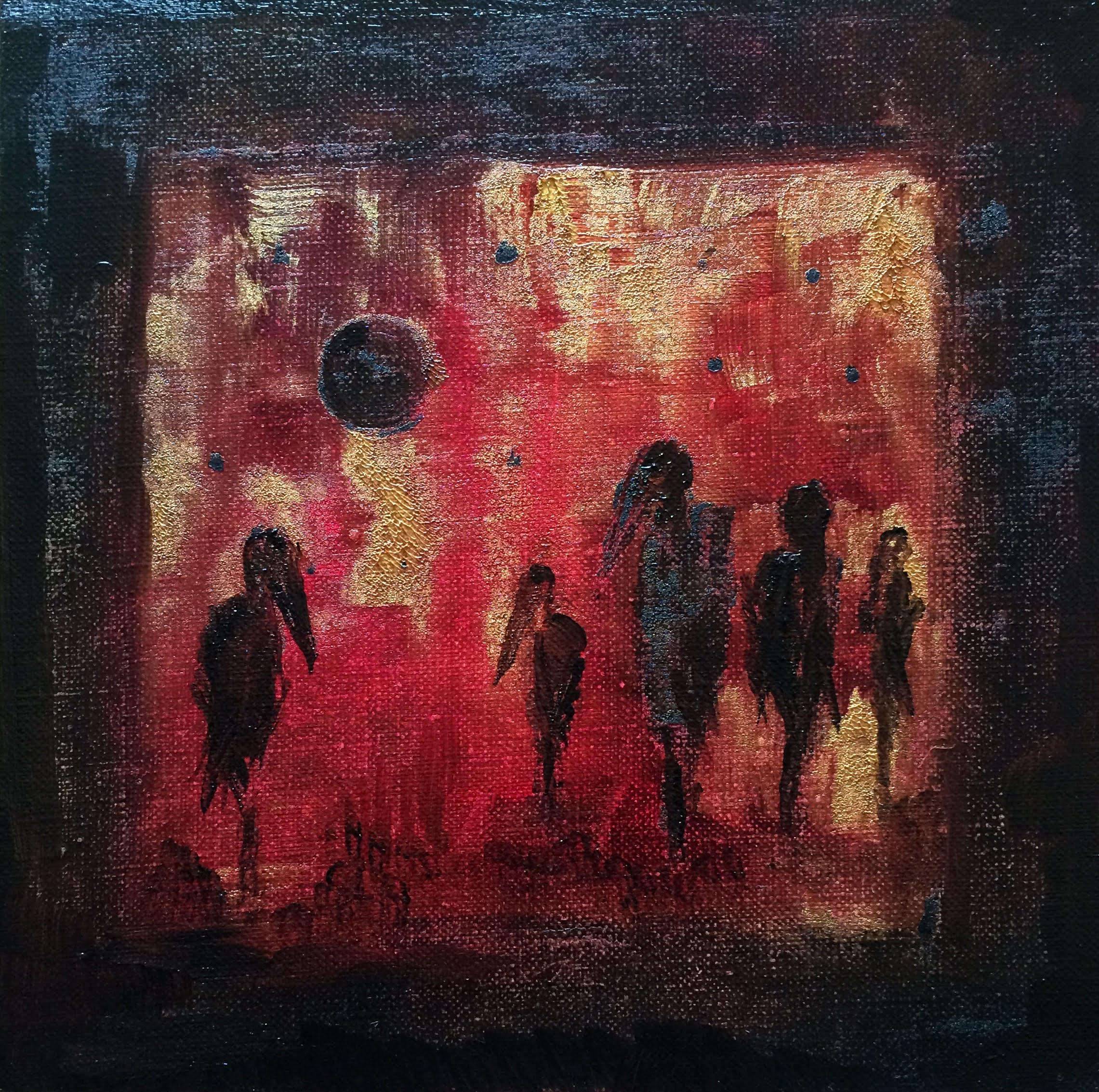 Obraz przyciąga wzrok swoją dramatyczną kompozycją. Dominują tu ciemne, intensywne kolory jak czerń i głęboka czerwień, które tworzą tajemniczą, wręcz melancholijną aurę. Postaci na pierwszym planie są niejasne i rozmazane, co nadaje im niemal eteryczny charakter i sprawia, że wydają się zawieszone między rzeczywistością a snem. Znajdujący się w tle niepokojący okrąg przypomina księżyc w pełni, dodając obrazu tajemniczości. Artysta zastosował technikę impasto, gdzie warstwy farby są grube i chropawe, co intensyfikuje wrażenie dynamiki i chaosu. Ta technika pozwala także na subtelne przejścia między kolorami, co dodaje obrazowi głębi. Czuć tu klimat, który można by określić jednym słowem – "intense". Można odczuć emocje samotności i refleksji, które mogą skłonić widza do zastanowienia się nad jego własnym miejscem we wszechświecie. Patrząc na ten obraz, przypomina mi się, jak kiedyś bawiłem się w chowanego w ciemnym lesie – ta sama mieszanka strachu i fascynacji. Czy to smutek, spokój czy zaskoczenie? „Dlaczego ci ludzie są tam?” – zapytałby pewnie każdy 7-latek. Obraz prowokuje pytania i, choć jest prosty w formie, wywołuje głębokie emocje.