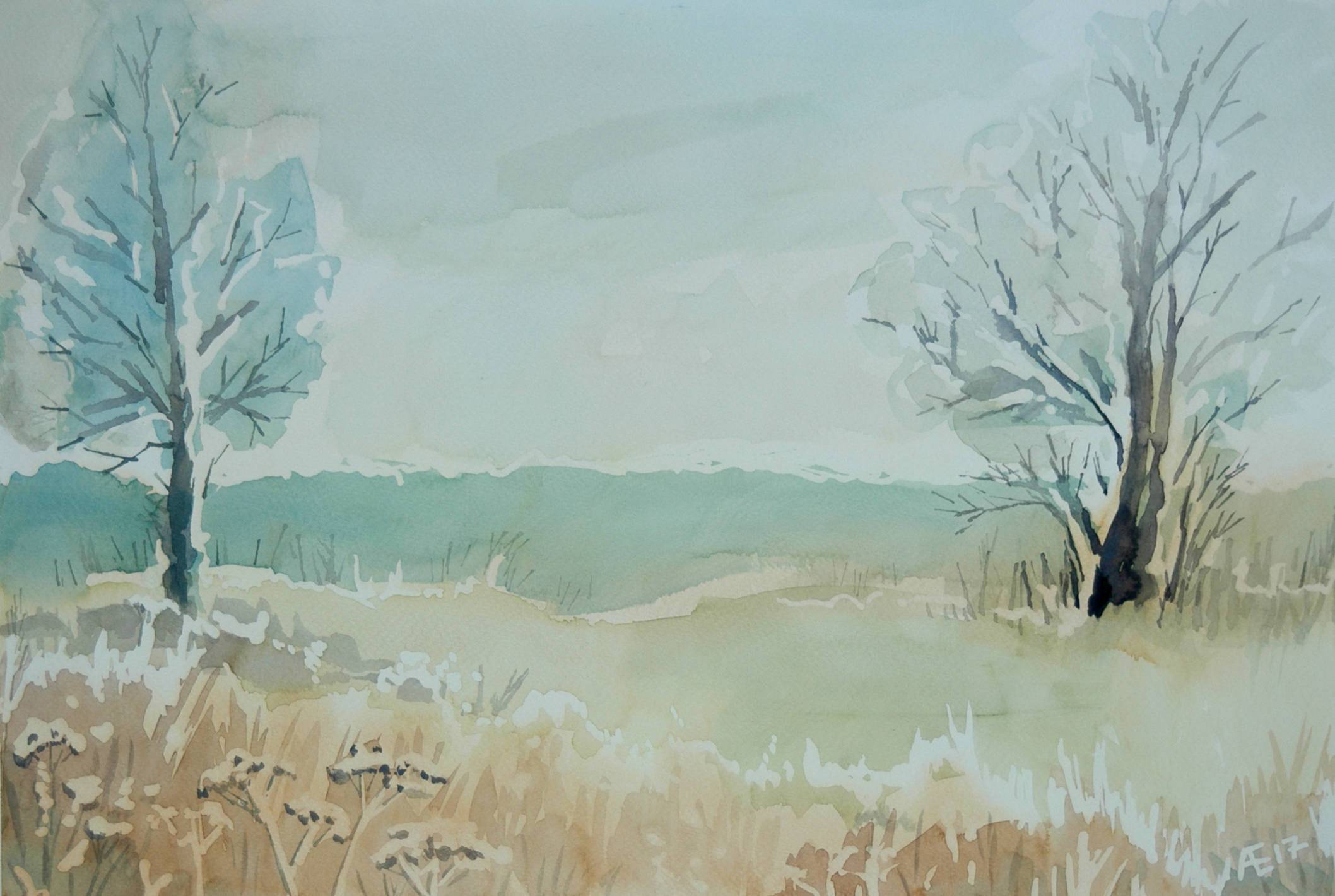 Obraz przypomina delikatną akwarelę, w której dominują chłodne, stonowane barwy – zielenie, błękity i beże. Na pierwszym planie widać dwa drzewa o cienkich, bezlistnych gałęziach, które ustawione są po przeciwnych stronach obrazu. Światło rozprzestrzenia się miękko, tworząc atmosferę spokoju i ulotności. Tło rozmywa się w subtelnych przejściach barw, dodając pejzażowi eterycznego charakteru. Artysta zastosował technikę przenikania się kolorów, co nadaje całości delikatności i dreamlike klimatu. Patrząc na obraz, można poczuć lekki chłód wiatru i pewną nostalgię za minionymi czasami. To jakby czas się zatrzymał na chwilę, dając szansę na refleksję. Dla mnie ten obraz jest jak cichy szept natury, zachęcający do zatrzymania się i wsłuchania się w jej serce. A może to tajemniczy zakątek, gdzie można schronić się przed zgiełkiem codzienności? Jak to się mówi po angielsku – serene. Kiedy patrzę na te drzewa, przypominają mi się bajki o zaczarowanych lasach. "Ja bym posadził jeszcze kwiatki" – powiedziałoby pewnie dziecko, patrząc na ten spokojny krajobraz.