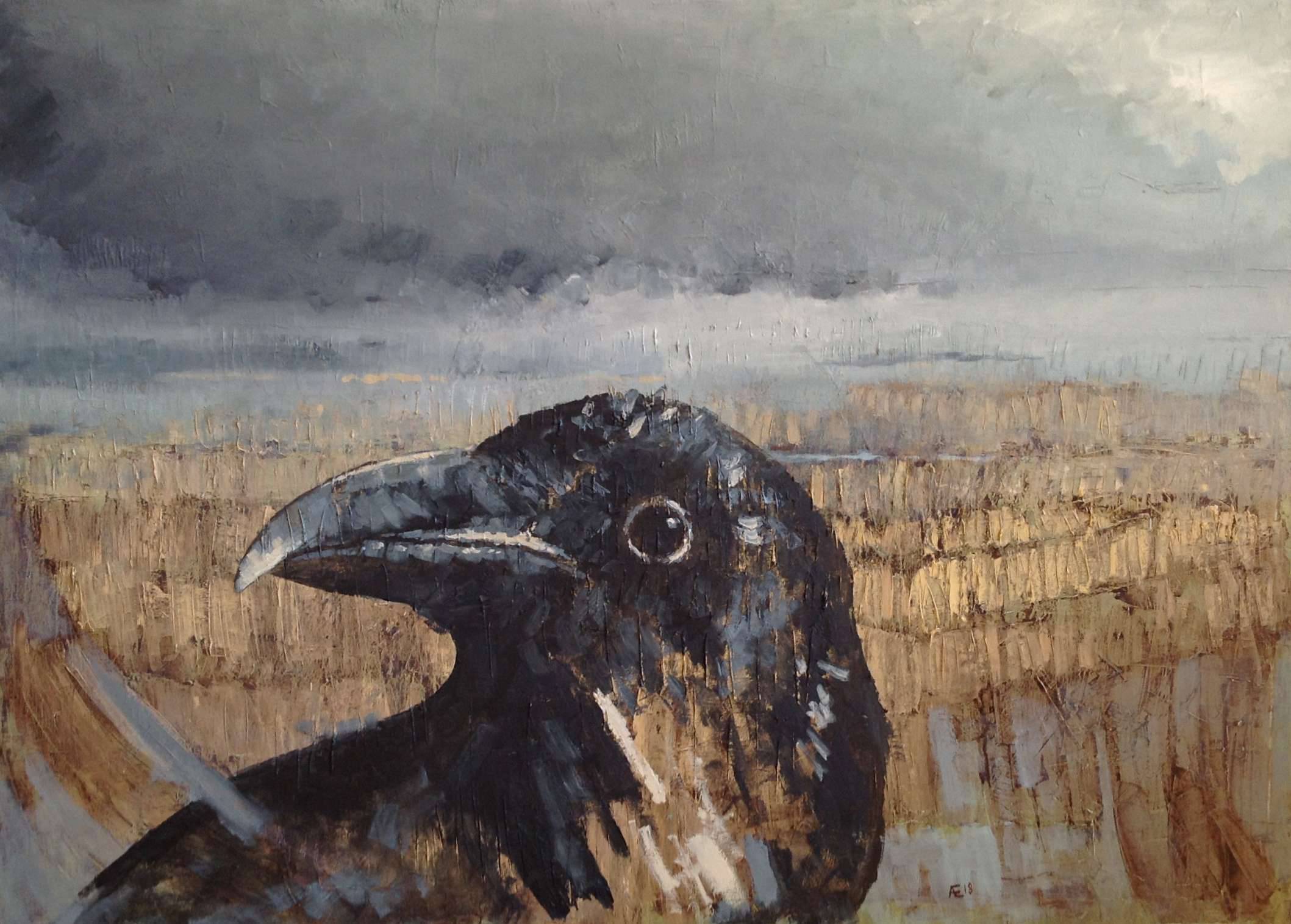 Na obrazie widzimy kruka, którego intensywne, czarne pióra odbijają delikatne odcienie szarości i błękitu. Tło jest ponure - burzowe chmury wiszą nad złotobrzmieniowymi polami, które sprawiają wrażenie, jakby wiatr przeszył je na wylot. Kompozycja skupia się na ptaku, który zdaje się patrzeć prosto na nas swym błyszczącym okiem, jakby skrywał tajemnicę. Atmosfera jest nieco melancholijna, ale intrygująca. Artysta użył techniki impastu, gdzie grube warstwy farby tworzą teksturę, przykuwając uwagę do detali. Dzieło emanuje spokojem, ale i tajemniczością. Kruk, symbol mądrości i tajemnicy, wzbudza refleksję nad nieodkrytymi aspektami natury. Patrząc na ten obraz, możemy poczuć lekki dreszcz - jakbyśmy stali na granicy znanego świata, gotowi przekroczyć jego linię. Wow, ten kruk wygląda jak prawdziwy! Wrażenie stworzone przez ciemne chmury jest naprawdę powerful, dodając dramatyzmu całej scenie. Podziwiając go, czuję dziwną mieszankę spokoju i ciekawości.