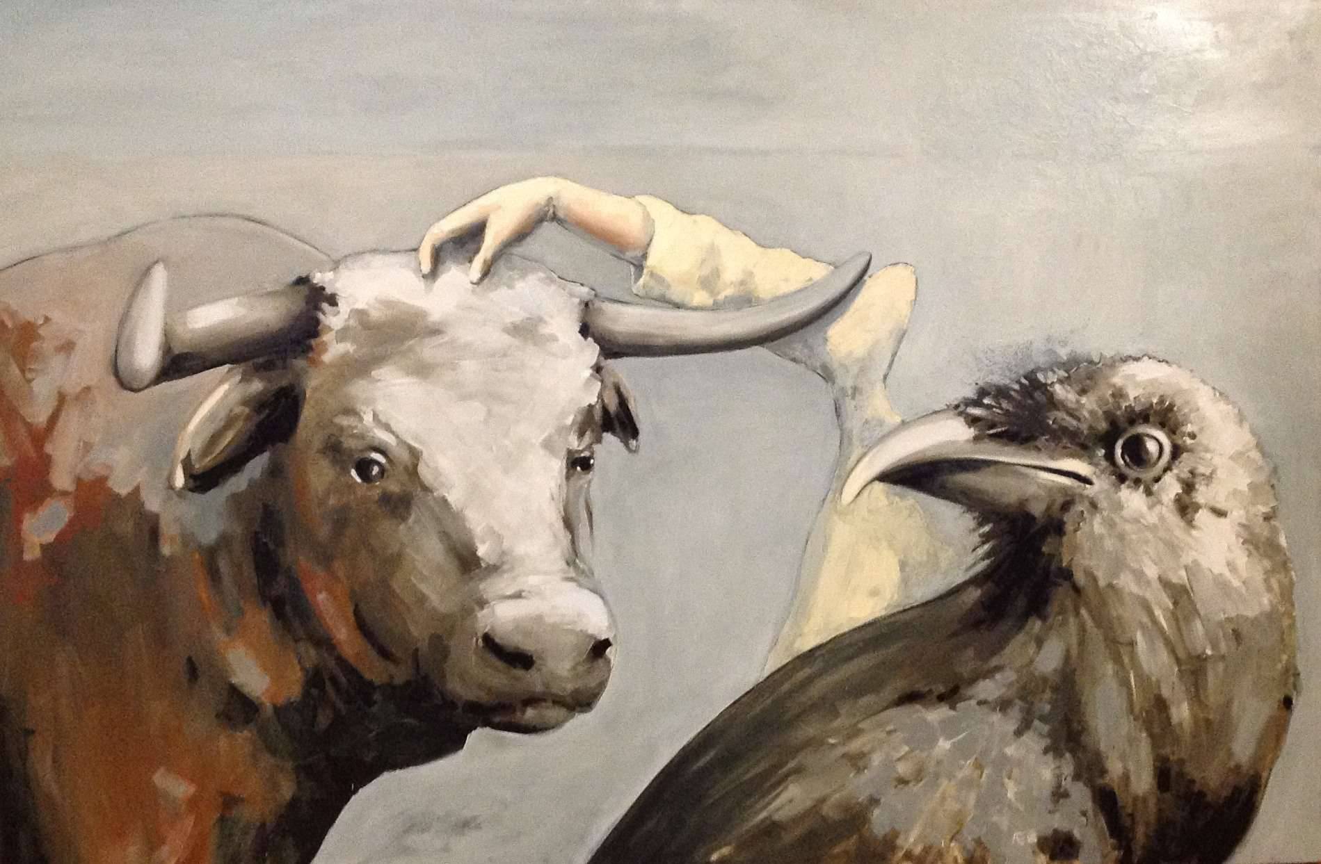 Obraz emanuje niezwykłą harmonią, łącząc barwę szarości i ciepłe brązy. W centrum widzimy byka o dostojnej postawie, a w tle ptaka z przenikliwym spojrzeniem. Dynamiczna kompozycja przyciąga uwagę - róg byka idealnie koreluje z dziobem ptaka. Jest w tym coś magnesującego, jakby czas się zatrzymał. Obraz ma reflective nastrój, pełen spokoju i głębi, ale także subtelnego napięcia. Artysta użył techniki impasto, co dodało całości faktury i wyrazistości. Patrząc na ten obraz, czujemy mieszankę spokoju i niepokoju. Może wydaje się, że to tylko zwierzęta, ale ich spojrzenia skrywają historie. Jakby patrzyły na widza, pytając: „Czego szukasz?”. Dziecko powiedziałoby: "Hehe, ten byk ma mięciutkie uszko!". Właśnie ta prostota i abstrakcja sprawiają, że dzieło jest niezwykle intrygujące. Wizualne kontrasty, jak jasne światło rozlewające się na futrze byka i cienie pod skrzydłami ptaka, podkreślają trójwymiarowość. Ostateczny efekt? Dzieło pozostawia odbiorcę z uczuciem zadumy, zmuszając do zastanowienia, co kryje się za tym nostalgicznym spotkaniem.