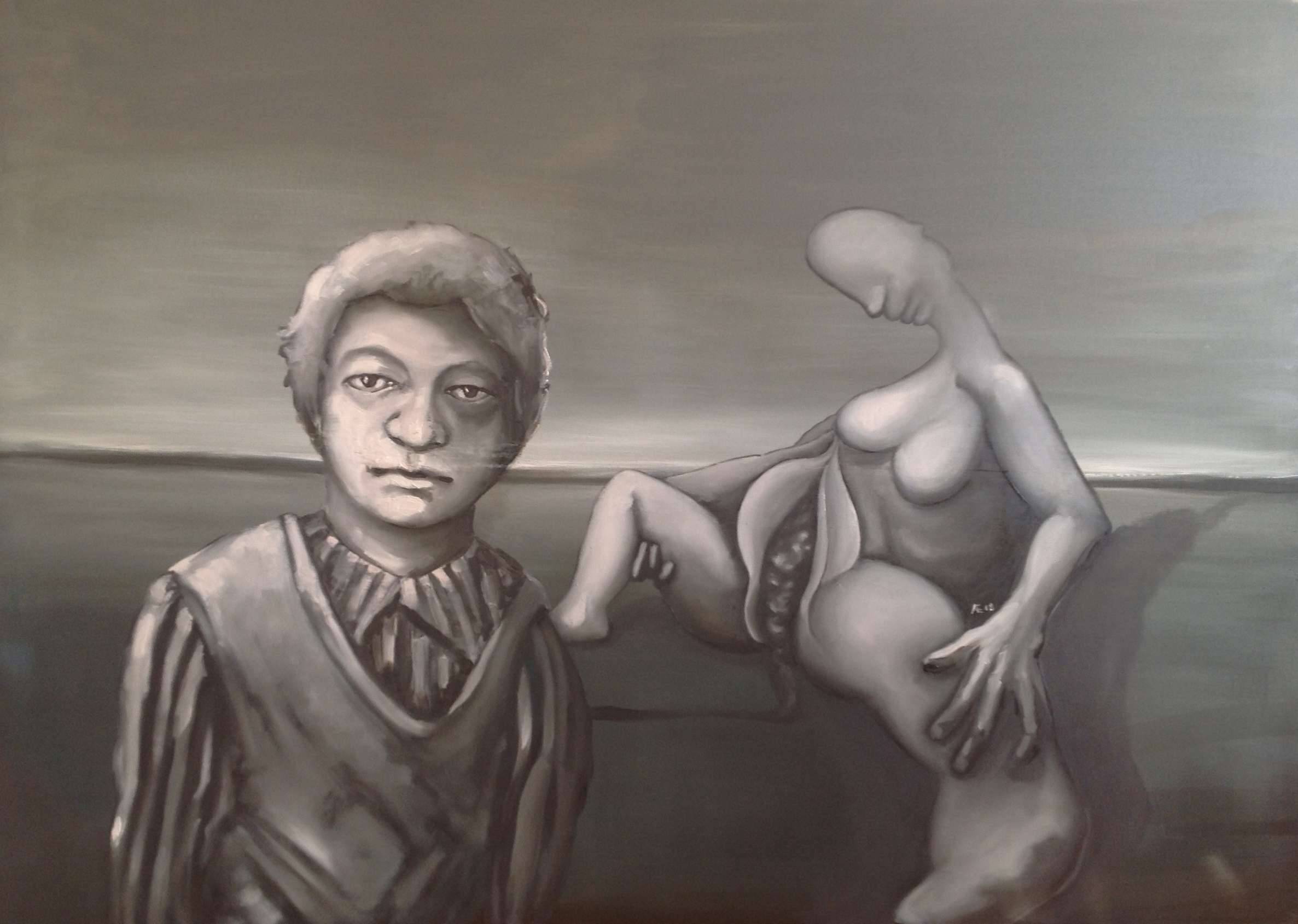 Obraz przedstawia surrealistyczną scenę w odcieniach szarości. Dominują chłodne, grafitowe tony, nadając mu nieco mroczny nastrój. Na pierwszym planie widzimy postać z twarzą o wyraźnych rysach, która emanuje spokojem, ale jednocześnie wydaje się zagubiona. W tle znajduje się abstrakcyjna, zdeformowana sylwetka, co wprowadza element niesamowitości. Kompozycja jest zagadkowa, jak gdyby każdy element miał swoją tajemnicę. Artysta zastosował technikę przypominającą malarstwo olejne, co dodaje głębi i intensywności. Atmosfera obrazu jest pełna niepokoju, jak sen, który nie daje spokoju długo po przebudzeniu. "It's mysterious," można by pomyśleć. Styl przypomina prace surrealistów, pełen symboli i ukrytych znaczeń. Obraz może budzić różnorodne emocje, od niepokoju po ciekawość, pozostawiając szerokie pole do interpretacji. A ja patrzę i myślę, co chciał wyrazić twórca? Ma się wrażenie, że to podróż do wnętrza ludzkiego umysłu, gdzie granice rzeczywistości są płynne. Ciekawe, co by powiedział 7-latek, może: "Śmieszny ludzik i dziwna pani"!
