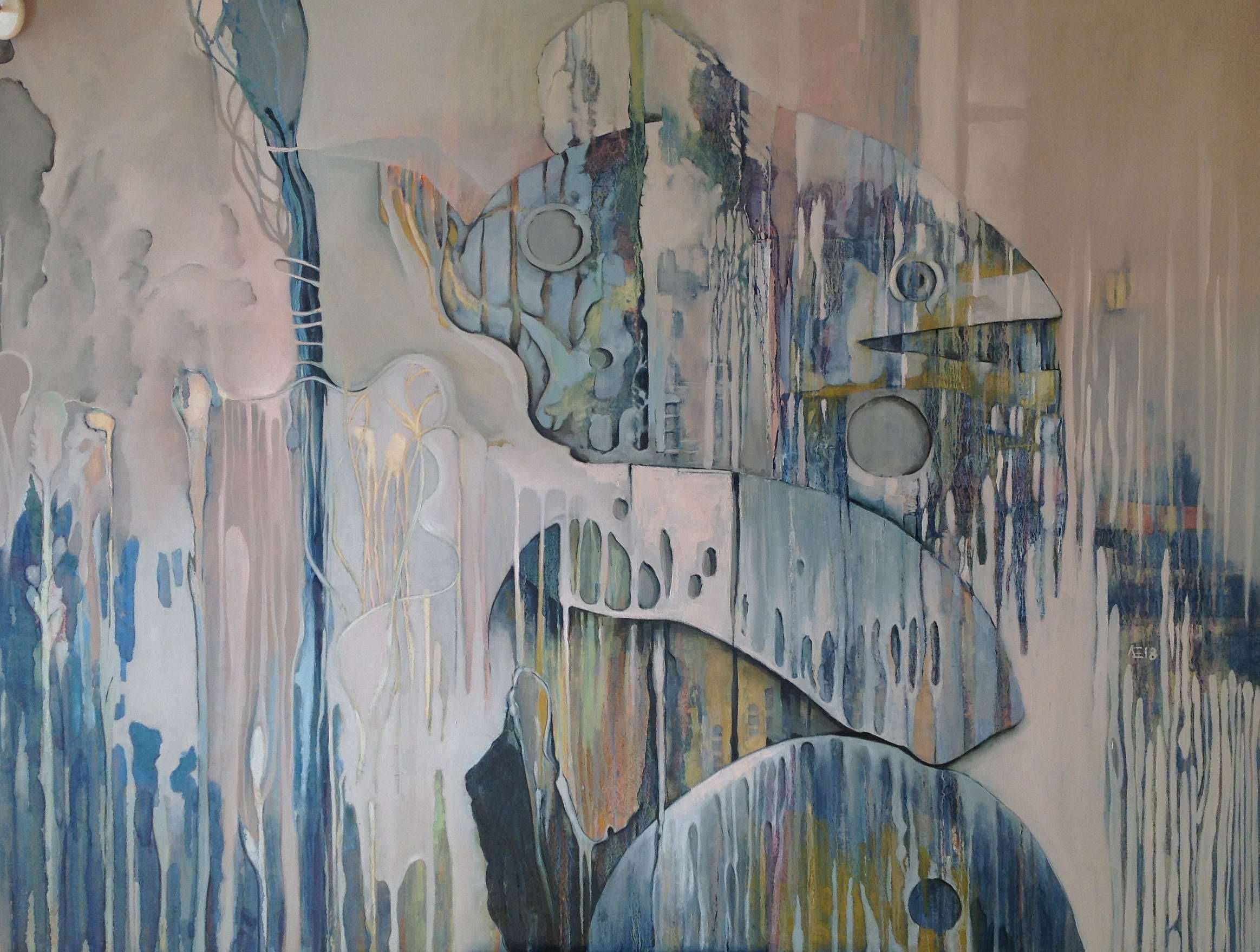 Obraz to niesamowite połączenie barw i kształtów, które przypomina nam oniryczną podróż do świata wyobraźni. Dominują tu chłodne kolory: błękity, szarości i stonowane odcienie beżów, które przeplatają się z subtelnymi akcentami pastelowymi. Kształty na płótnie płynnie przechodzą jedne w drugie, tworząc coś na wzór abstrakcyjnego krajobrazu pełnego tajemnicy. Artysta zastosował technikę drippingu, co dodaje całemu dziełu dynamicznego, niemalże kinetycznego charakteru. Tańczące linie malarskich zacieków przyciągają wzrok, budując niepowtarzalny nastrój. Atmosfera obrazu jest nieco melancholijna, ale też fascynująco zagadkowa. Można poczuć się jak dziecko na początku magicznej przygody. Kicia ociera się o grafikę, a może to ostateczna forma sztuki nowoczesnej? Who knows! Styl obrazu przypomina abstrakcyjne ekspresjonizmy, lecz z delikatnym wpływem sztuki dekonstruktystycznej, co może budzić ciekawość i skłaniać do osobistych interpretacji. Odbiorca może poczuć spokój, a jednocześnie lekkie zaniepokojenie, jakby w tej tajemnicy kryła się głębsza historia. Myśli krążą wokół nieodkrytych treści, a emocje rosną. Intrygujące jest, jak prosty zestaw barw i linie mogą wywołać tak żywe uczucia. Ten obraz to prawdziwa uczta wizualna i refleksja nad pięknem ukrytym w chaosie. A kiedy patrzysz na te plamy, to serio można by pomyśleć, że to deszcz ryb!