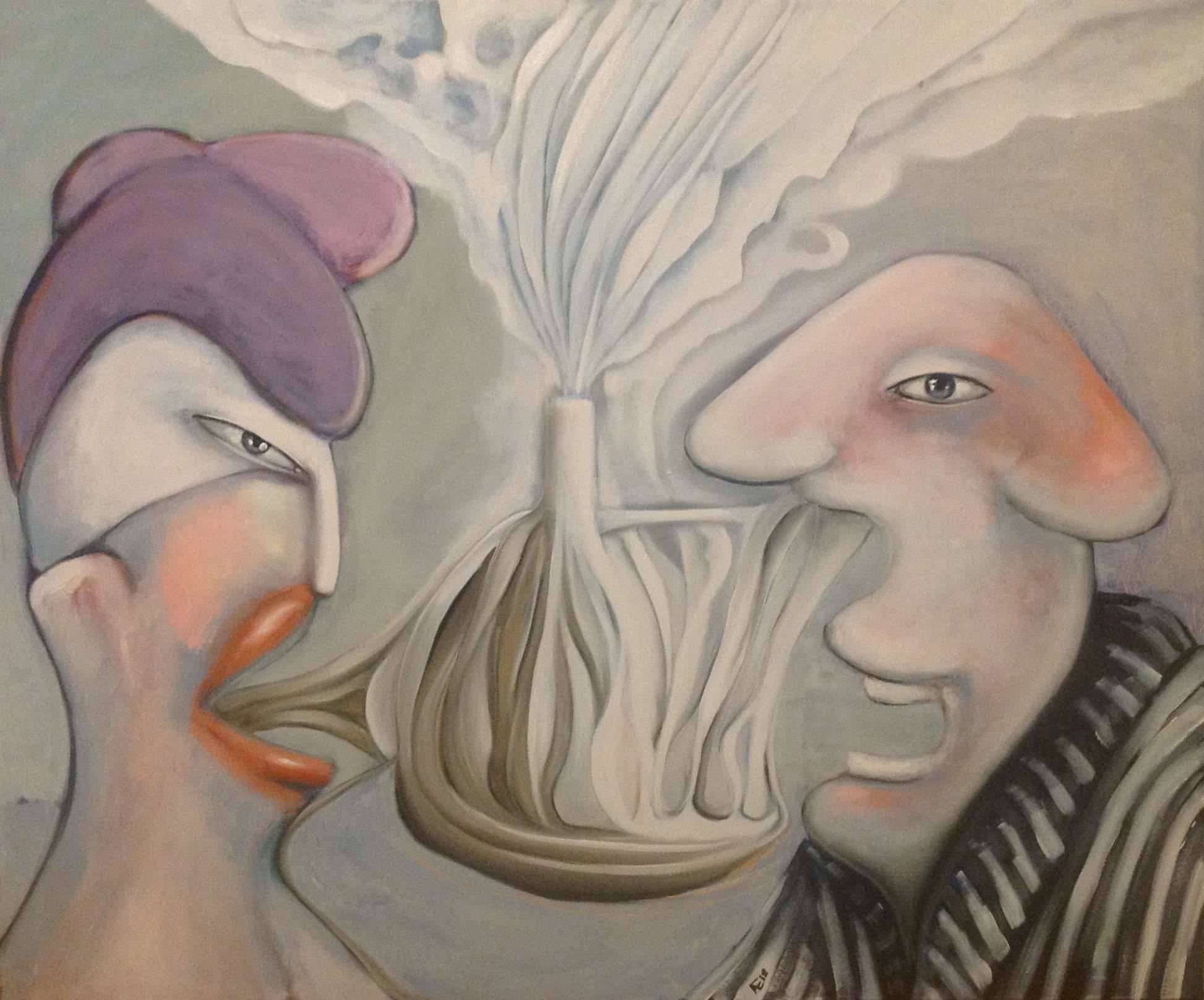 Obraz przyciąga uwagę swoimi dziwacznymi, surrealistycznymi kształtami. Kolory są stonowane, dominują szarości, beże z akcentami fioletu i różu. Postacie mają wydłużone, zdeformowane twarze, przypominające nieco marionetki. Centralny element to para, która jakby wydycha dym czy mgłę. Kompozycja jest nieco chaotyczna, ale w tym tkwi jej urok. Atmosfera obrazu jest nieco tajemnicza, może nawet odrobinę niepokojąca. Styl przypomina surrealiści, z pewną dozą humoru. Artysta z pewnością nie bał się eksperymentować z kształtami i liniami, zobaczcie tylko te twarze! To trochę jak taka zabawa w "co by było, gdyby". Można się zastanowić, co myślą te postacie. Może rozmawiają bez słów? W końcu dym wydaje się być medium ich komunikacji. Obraz może wywoływać różne emocje. Hmm, takie trochę typu "co ja właśnie widzę?" Ale fajne. Jakby to napisało dziecko: „Ludki plują chmurą!” Gdy patrzę na to dzieło, czuję pewną nostalgię za światem, w którym nic nie jest oczywiste. Jest intrygujący, trochę jak "out of this world".