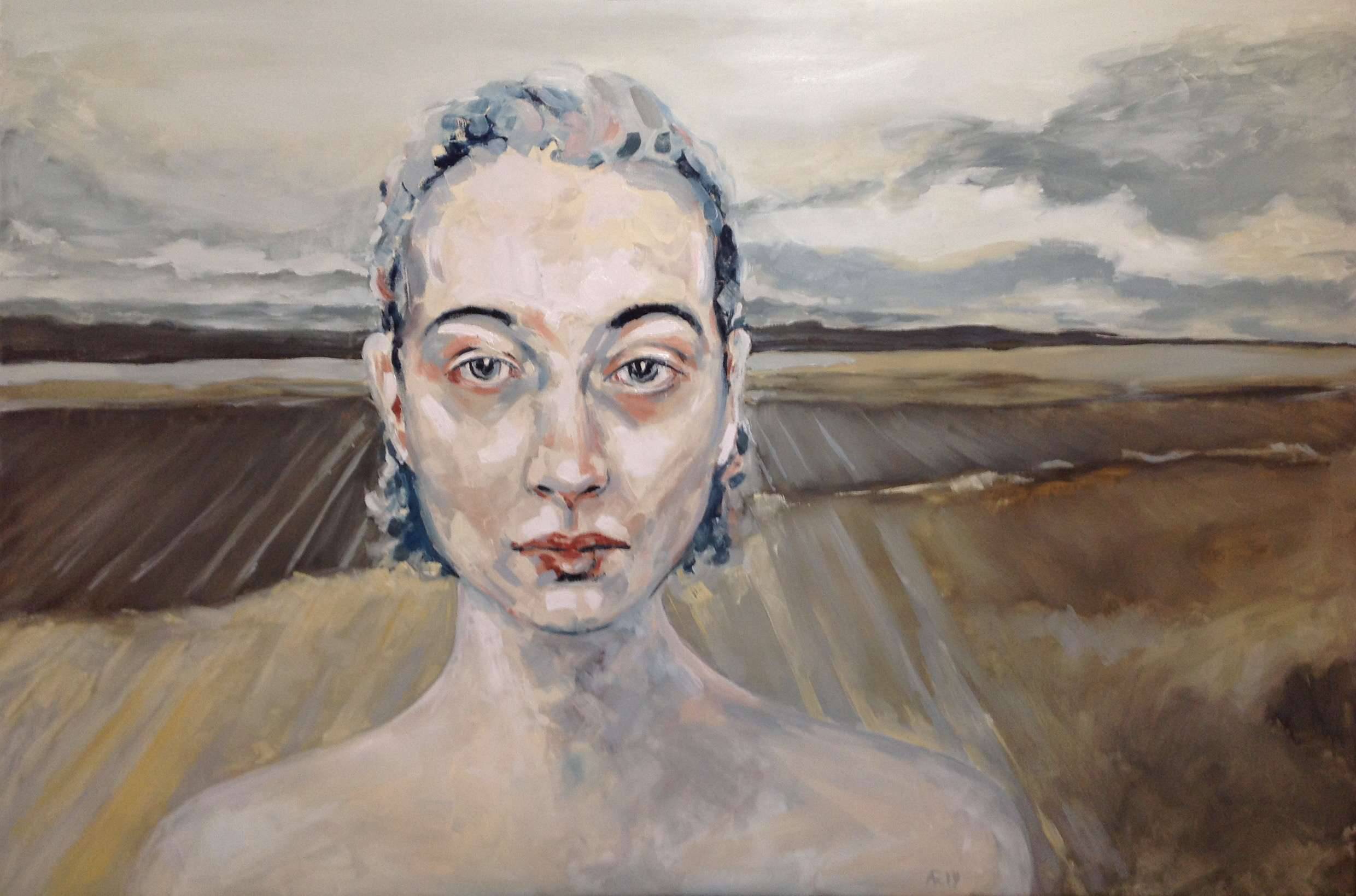 Obraz przedstawia intrygującą postać na tle rozległego, pustego krajobrazu. Kolory są stonowane, dominują odcienie szarości, brązów i beży, które nadają całości nieco melancholijny nastrój. Centralny punkt obrazu to twarz, której blada skóra kontrastuje z ciemniejszym, nieco rozmytym horyzontem. Widać tu precyzyjne pociągnięcia pędzla, które tworzą teksturę i subtelny, niemal hipnotyzujący wyraz oczu. Twórca stosuje technikę impastową, która podkreśla detale i nadaje dziełu głębi. Istnieje pewna surowość w tym stylu, która czyni obraz fascynująco niepokojącym. Może przypominać to uczucie, gdy oglądamy stary film noir. Wyczuwalna jest atmosfera introspekcji, a twarz zdaje się patrzeć w głąb nas, zadając ciche pytania o tajemnice kryjące się za oczami. To dzieło prowokuje do myślenia na temat samotności i poszukiwania siebie. Czyż to nie jest piękne, jak sztuka może przypomnieć nam o własnych doświadczeniach? Zastanawiam się, kto jest tą osobą. Dach ma kolor taki jak niebo. Czuć tu chłód, ale i pewną ciepłę spokoju. Obraz jest jak otwarta księga pełna nieopowiedzianych historii. Ciekawość, delikatna nostalgia i nutka niepewności – oto uczucia, które budzi to fascynujące dzieło.