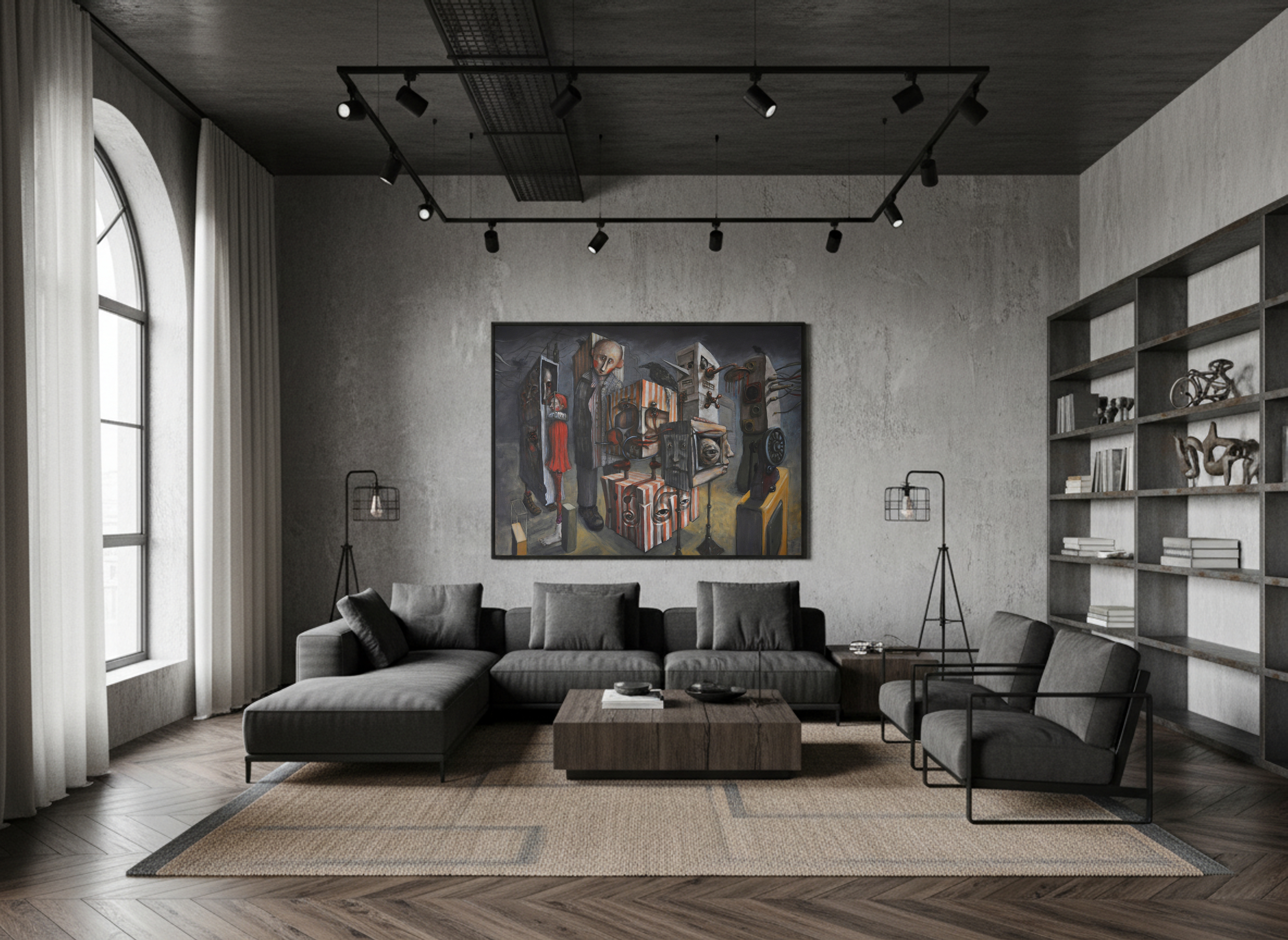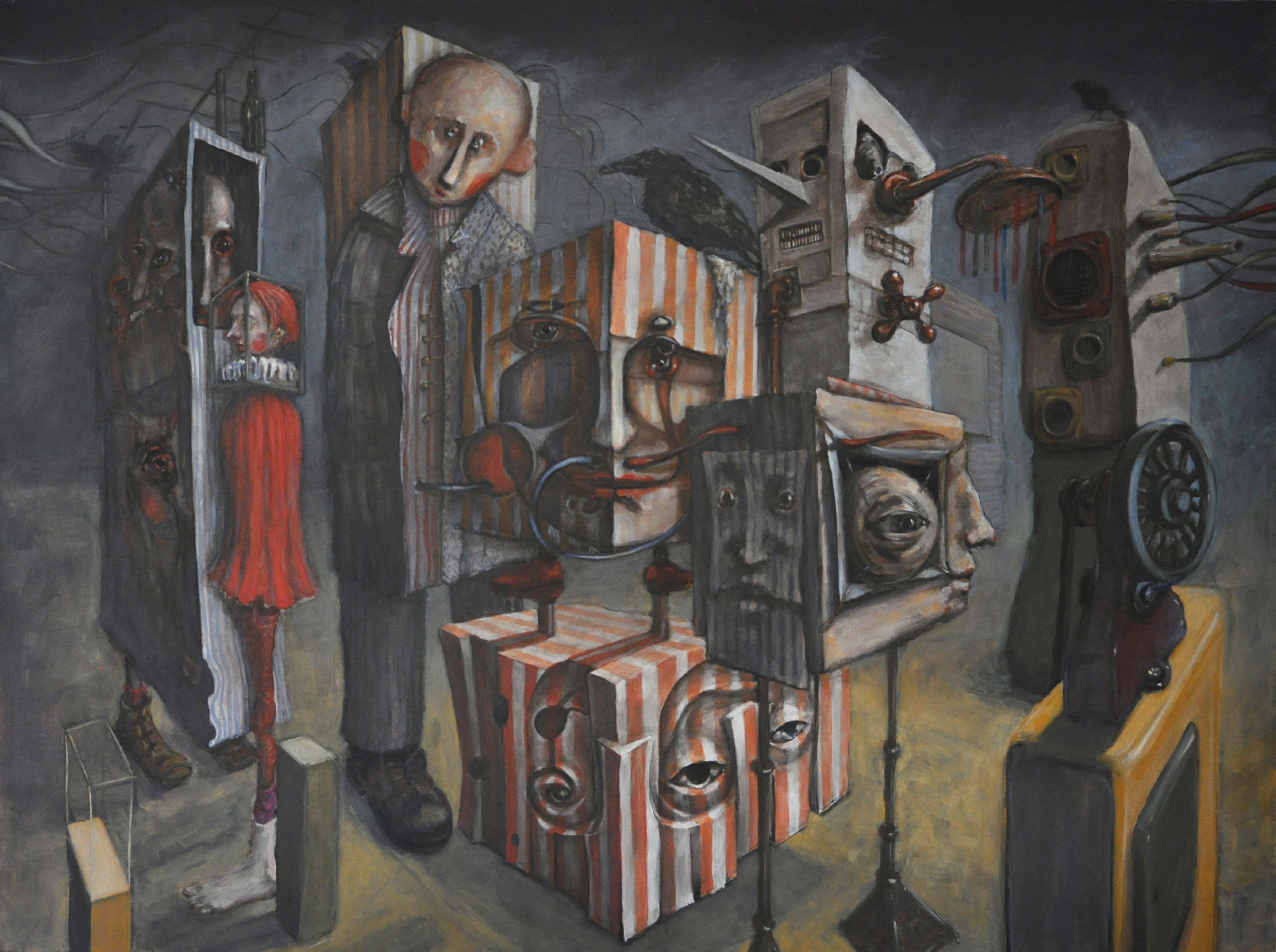 Obraz przedstawia surrealistyczną scenę pełną dziwacznych form i przedziwnych twarzy. Dominują tu zimne odcienie szarości, przerywane przez intensywną czerwień i pomarańcz. Kształty są nieproporcjonalne i zapadające w pamięć, tworząc kompozycję, która wygląda jak sen na jawie. Atmosfera obrazu jest nieco mroczna i tajemnicza, budzi jednocześnie zachwyt i niepokój. Artysta użył mieszanki technik – wygląda to jak połączenie malarstwa olejnego z elementami kolażu. To, co mnie uderza, to jak abstrakcyjne formy przypominają figury ludzkie. Obraz sprawia, że czuję się jakbym patrzył na coś, co nie do końca chce być odkryte. Może sugerować konfrontację z podświadomością, tajemniczym zakątkiem umysłu. A w środku tego wszystkiego, kruk siedzi obserwując, dodając scenie elementu "memento mori". Wyobraźnia siedmiolatka powiedziałaby: "Co tam robi te dziwne oko?". Bo w tym całym chaosie spojrzenie tych abstrakcyjnych twarzy jest naprawdę "creepy". Obraz fascynuje i przeraża zarazem. To jak zaglądanie w dziwną krainę, z której trudno się wyrwać, ale nie sposób od niej oderwać oczu.