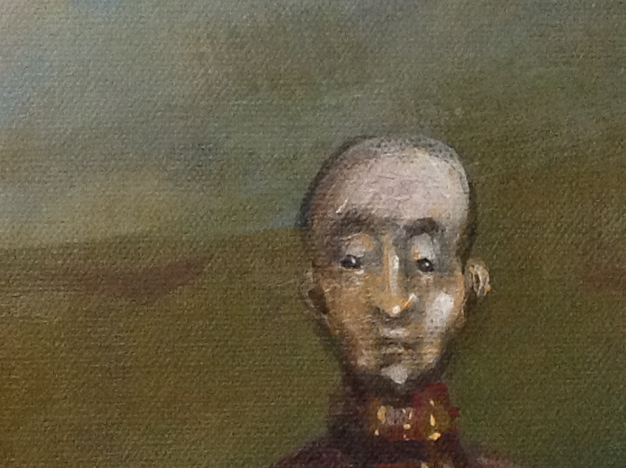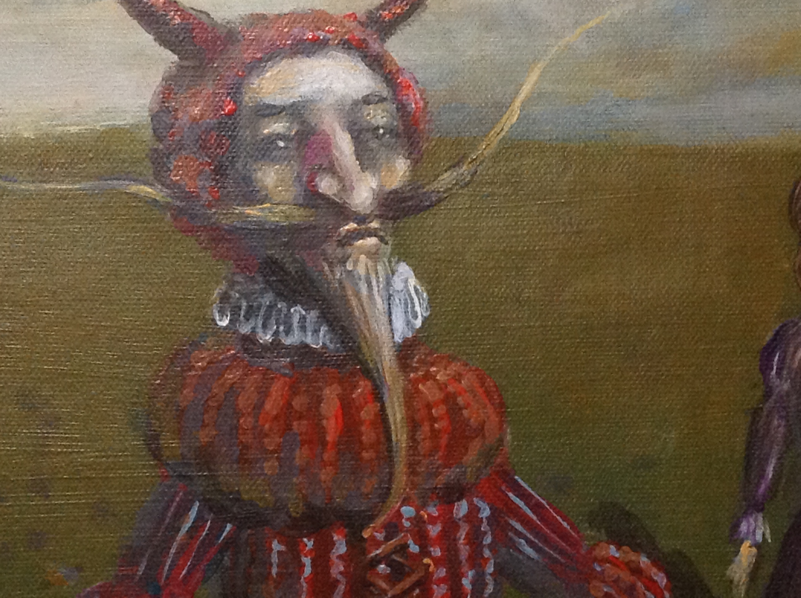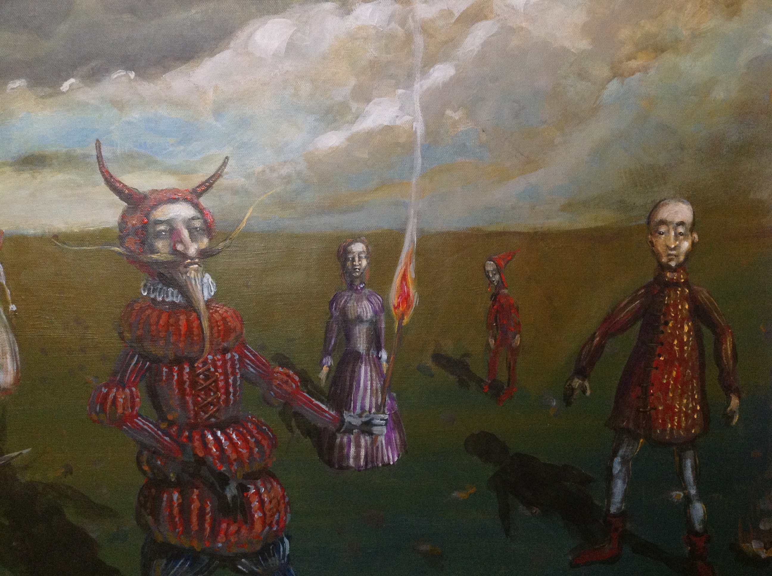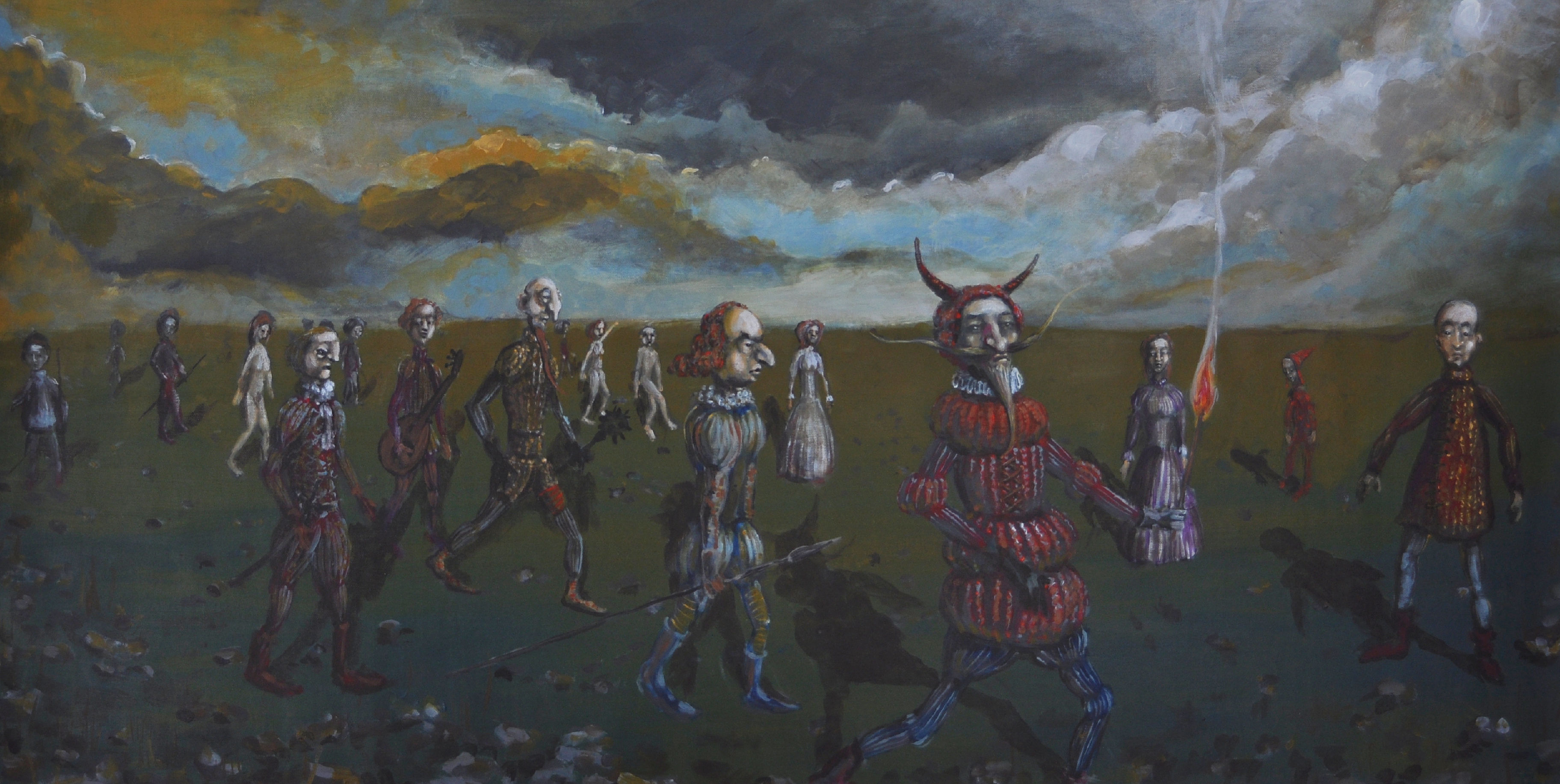 Na horyzoncie wibruje zielono brunatna równina, a nad nią ciężkie chmury w szarościach i żółtych smugach. Przez środek sunie korowód dziwaków, wydłużone ciała, pajęcze nogi, kubraczki w czerwieniach i fioletach. Na ziemi porozsiewane kamyki i ciemne plamy cieni, jakby noc szła za nimi. Jeden w rogatym hełmie niesie płomień, inni mruczą jakby dawno zgubili dom. Pociągła kompozycja prowadzi oko z lewej na prawą, rytm kroków robi za metronom. Idą dziwni ludzie i trochę się boję. Pędzel pracuje warstwowo, miejscami impasto, gdzie indziej mgła laserunku, groteska w stylu lekko surreal. Nastrój chłodny i troche klaustro, ale fascynuje. Czuję dreszcz, kurcze, to takie uncanny. Może to pochód wspomnień, może teatr po końcu dnia, i jakos mi naprawde żal tych postaci.