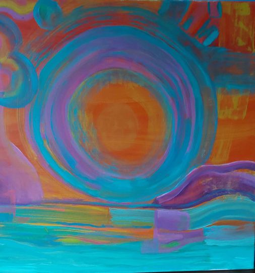 Obraz emanuje żywymi kolorami, mieni się w odcieniach pomarańczy, turkusu i fioletu, tworząc niesamowity festiwal barw na płótnie. W centrum znajduje się wielkie koło, jakby wibrujące energią, okrążone przez koncentryczne kręgi, które dodają dynamiki. Mieszanka prostokątnych i falujących kształtów na bokach sprawia, że obraz wydaje się niemal trójwymiarowy. Taki widok wprawia w dobry nastrój, przenosi nas do świata pełnego optymizmu. Technika, jaką zastosował artysta, to prawdopodobnie akryl, co pozwala uzyskać tą intensywność i głębię barw. Odbiorca może poczuć się zaskoczony, może wręcz zachwycony tym energetycznym chaosem. Wydaje się, że każdy element tego obrazu tańczy w rytmie własnej muzyki. Styl można określić jako abstrakcyjny, z nutą ekspresjonizmu. Patrząc na ten dynamiczny obraz, czuję przypływ radości i inspiracji, trochę jak dzieciak, który widzi fajerwerki podczas festynu. To makes me happy, że ktoś potrafi tak bawić się kolorem i formą. Czasem takie dzieła przypominają, że sztuka to nie tylko technika, lecz także uczucia, które przekazuje.
