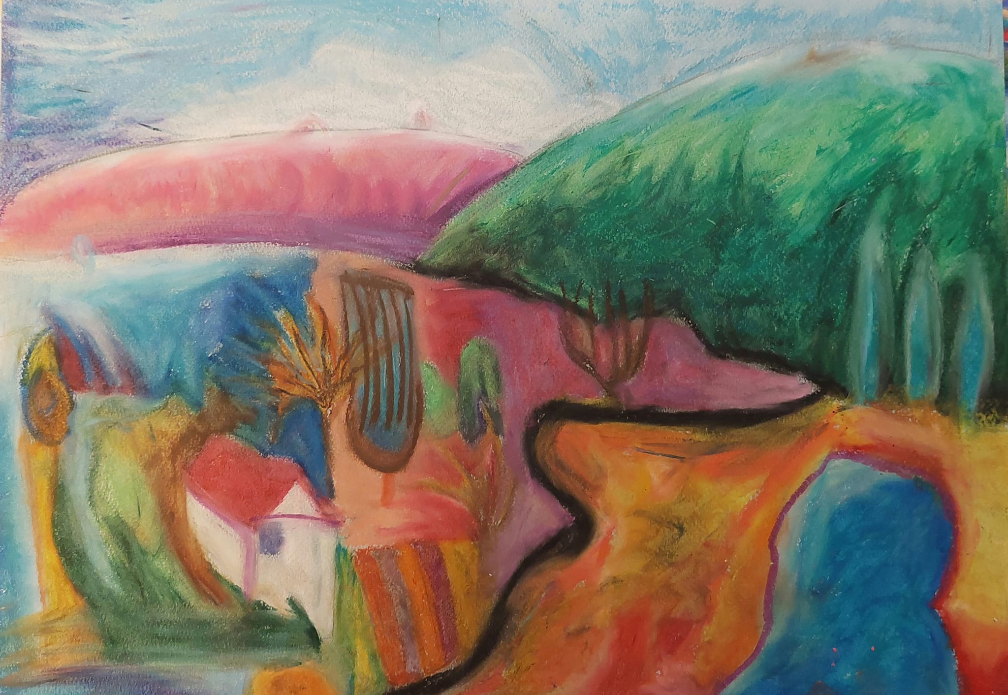 Obraz emanuje bogactwem kolorów, które płynnie przechodzą od jednego do drugiego. Dominują tu zielenie, błękity i ciepłe odcienie różu oraz pomarańczy, tworząc dynamiczną i żywą kompozycję. Kształty są zaokrąglone, miękkie, prawie jak fale na wodzie. Można poczuć, jak artysta bawi się formą i barwą, tworząc balans między chaosem a harmonią. Atmosfera dzieła jest marzycielska, niemal surrealistyczna. Może to być pejzaż z snów, gdzie wszystko wydaje się płynne i niepewne. Klimat obrazu przywołuje wrażenie spokoju i radości, choć jest w nim coś tajemniczego, coś co sprawia, że chciałoby się wejść głębiej w świat przedstawiony przez artystę. Styl artystyczny można określić jako abstrakcyjny, z nutą impresjonistycznego podejścia. Artysta używa techniki malowania maźnięciami, które tworzą iluzję ruchu i głębi. Dzięki temu obrazy wydają się być pełne życia i energii. Jak się na to patrzy, to aż chce się śmiać, bo wszystko jest takie kolorowe i fajowe. W sercu widza obraz może wzbudzić tęsknotę za beztroskimi chwilami dzieciństwa lub po prostu radosny zachwyt nad pięknem otaczającego świata. It’s like a visual symphony, grająca na emocjach oglądających. Ten obraz jest jak czuły uścisk pełen ciepła i kolorów.