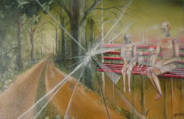 Obraz przedstawia surrealistyczną scenę, gdzie powtarzają się kontrasty między naturą a technologią. Główne elementy to mroczny las i drewniane kukły, które siedzą na czerwonej ławce. W centrum widzimy pęknięcie na obrazie przypominające rozbitą szybę, które dodaje całości dramatyzmu. Kolory są stonowane, dominują różne odcienie zieleni i brązu, co wprowadza tajemniczy nastrój. Czerwony ławka kontrastuje z naturą, symbolizując może konflikt lub harmonię między człowiekiem a naturą. Ten obraz emanuje pewną melancholią i dziwnością. Styl artystyczny sugeruje elementy surrealistyczne, artysta skupia się na detalach i nierealistycznych połączeniach. Technika jest precyzyjna, a jednocześnie swobodna, co pozwala widzowi na różnorodne interpretacje. Można poczuć się obserwowanym przez kukły, które być może zastanawiają się nad własnym istnieniem. Obraz może wywoływać u odbiorcy refleksje nad kondycją współczesnego świata. A może to tylko ja tak myślę. Dziecko mogłoby powiedzieć: "Te lalki są trochę straszne". Wzbudza to pytanie: co kryje się poza tą 'broken' taflą. Porusza emocje, prowokuje do myślenia. U mnie pojawia się lekkie poczucie niepokoju i zaciekawienia, gdy patrzę na to dzieło.
