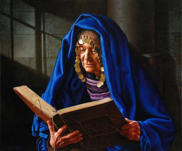 Na obrazie widzimy starszą kobietę owiniętą w intensywnie niebieski płaszcz, który dodaje jej postaci tajemniczości. Kontrastuje z ciemnym tłem, przyciągając wzrok. Twarz kobiety oświetlona jest miękkim światłem, podkreślając jej zmarszczki i wyraz skupienia. Na głowie ma ozdobę z monetami, które delikatnie połyskują. W dłoniach trzyma starą księgę z napisem "Biblia", co dodaje całości sakralnego nastroju. Atmosfera obrazu jest kontemplacyjna i spokojna. Wręcz słychać ciszę, która otacza kobietę pogrążoną w lekturze. Artysta mistrzowsko operuje światłem i cieniem, co nadaje dziełu głębi i realizmu. Techniki te, wraz z bogatymi kolorami, tworzą niemal trójwymiarowy efekt. Obraz emanuje poczuciem zadumy, może prowokować do przemyśleń nad życiem i duchowością. Trudno się nie zachwycić, jak artysta uchwycił delikatne emocje na twarzy kobiety. Dziecko mogłoby powiedzieć: "Babcia się zamyśliła nad książką". To jest właśnie magiczne. Elementy obrazu prowokują do osobistej refleksji. Zastanawiam się nad historiami zapisanymi na kartach tej księgi. Takie "grand" momenty zatrzymania na chwilę pozwalają nam zajrzeć głębiej w siebie.