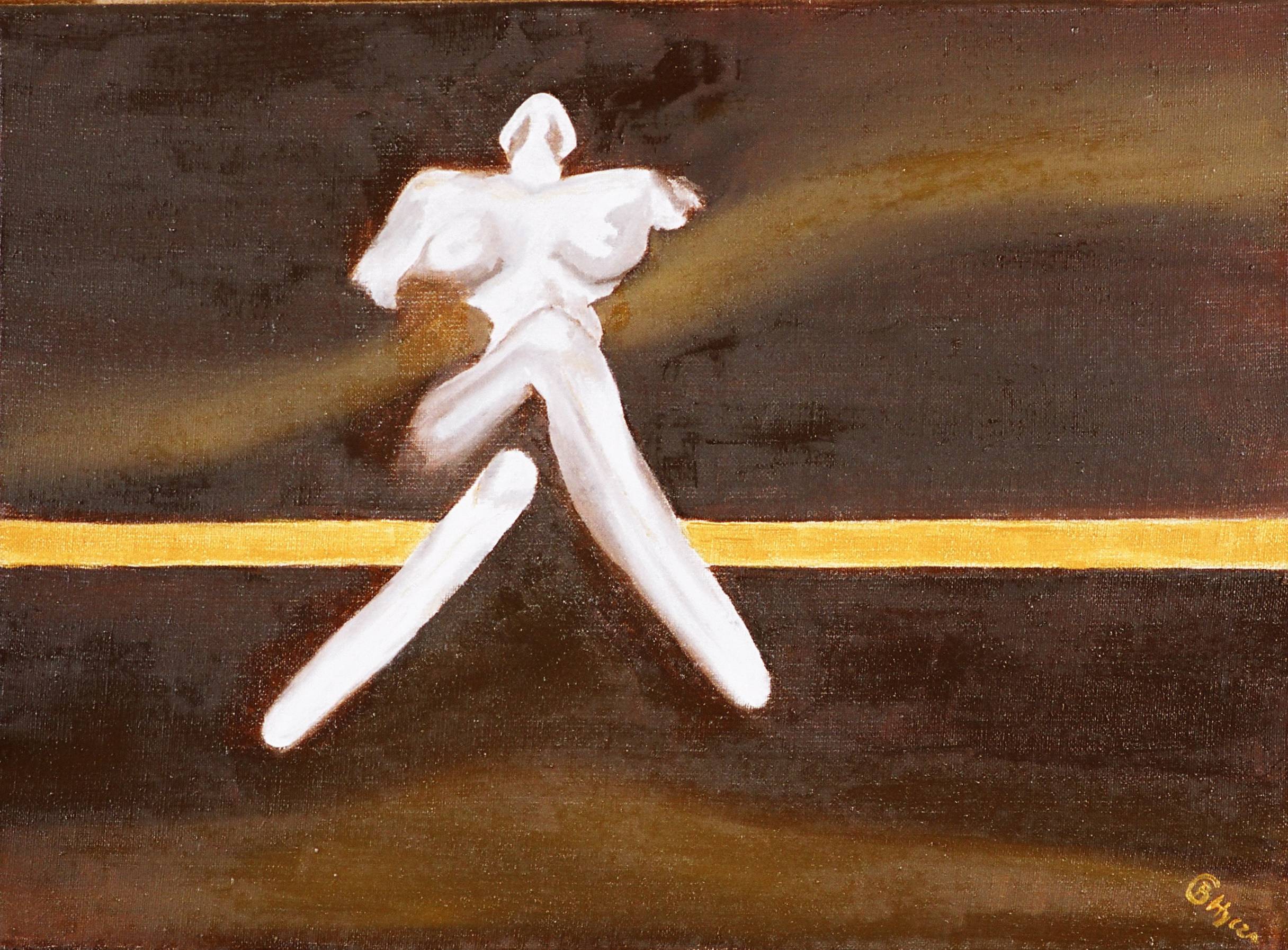 Obraz ukazuje dynamiczną formę na ciemnym tle. Dominuje tutaj kontrast między ciepłym brązem a błyszczącym białym, który przyciąga wzrok. W centrum widać postać o wyraźnych, szerokich pociągnięciach pędzla, która zdaje się przemieszczać, jakby balansując na cienkiej, złotej linii. To właśnie ta linia dodaje dramatycznego napięcia i dzieli przestrzeń na górę i dół, niczym horyzont. Wrażenie ruchu i napięcia sprawia, że obraz wydaje się niemalże "living". Artysta z wprawą stosuje technikę impastu, dzięki której tekstura staje się wyczuwalna niemal na dotyk. Atmosfera jest nieco mistyczna, emanuje tajemnicą i zachęca do zastanowienia się. Jakby mówiła: "Coś się tu dzieje, choć jeszcze nie wiesz co". Z jednej strony jest tu cisza, z drugiej dynamika. Dla mnie to taki obraz, który można analizować godzinami, szukając nowych interpretacji. Moja młodsza siostra powiedziałaby pewnie: "To wygląda jak anioł na skakance!". I w tym jest coś. Obraz wciąga do środka i nie chce puścić – it's mesmerizing. Każdy detal ma osobną historię, a całość zmusza do ponownego oglądania. Coś w nim jest, coś, co sprawia, że czujesz ciepło i delikatną bryzę emocji.