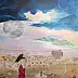 Obraz jest intrygujący, pełen surrealistycznych elementów, które przyciągają wzrok. Dominuje tu zróżnicowana paleta kolorów, od głębokiego błękitu chmur po cieplejsze odcienie beżu i brązu na ziemi. Centralnym punktem jest postać kobiety ubranej w intensywnie czerwoną szatę, siedząca na pustynnej równinie. Nad nią rozciągają się dramatyczne, ciemne chmury, kontrastujące z blado-różowym niebem. Wrażenie chaosu doskonale oddają porozrzucane przedmioty wokół, tworząc atmosferę tajemnicy i niespiesznej refleksji. Styl artysty nawiązuje do surrealizmu, wskazując na wpływy Dalego i Magritte'a, co.ukazuje namalowane elementy w sposób nieoczywisty, wręcz magiczny. Patrząc na obraz, czujemy się trochę jak w innej rzeczywistości. Co tu się dzieje? Może to sen lub nawet jakiś koszmar. Małe dziecko powiedziałoby: "Pani siedzi na piasku i patrzy na butelki.” To takie proste, a jednak głęboko uderzające. Obraz może wywoływać uczucie nostalgii czy zadumy, pozostawiając odbiorcę z pytaniami o sens i ukrytą symbolikę. Magiczny blask księżyca zdaje się obiecywać nieodkryte tajemnice.