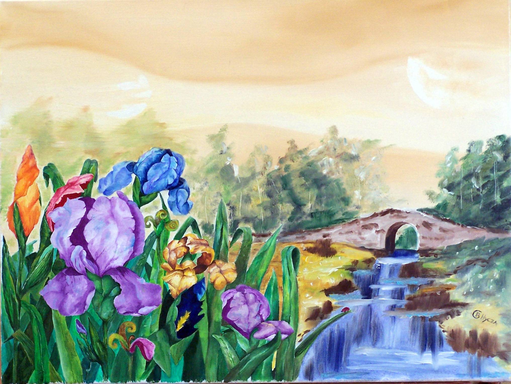 Na obrazie widzimy wspaniałe irysy w różnych odcieniach fioletu, niebieskiego i pomarańczu. Ich duże, falujące płatki kontrastują z zielonym tłem liści. Kompozycja jest urzekająca, bo kwiaty zdają się niemalże wychodzić z obrazu. Horyzont tworzy delikatny mostek nad spokojnym strumieniem. W oddali drzewa malowane są rozmytą techniką, co nadaje im lekkość i ulotność. Tło w odcieniach beżu i zieleni sprawia, że scena wydaje się ciepła i spokojna. Obraz emanuje spokojem i harmonią. Wyczuwalna jest atmosfera leniwej letniej niedzieli. Artysta używa techniki impasto, co widać w teksturach płatków kwiatów. Taki styl tworzy feeling głębi i namacalności. Kolory są żywe, a jednocześnie subtelne, co podkreśla ich naturalne piękno. Dzieło może wywoływać u odbiorcy uczucie nostalgii i tęsknoty za prostotą natury. "Wow, jaka piękna woda" powiedziałoby dziecko patrząc na obraz. Zastanawiam się, jakby to było usiąść na brzegu strumienia i po prostu być. Artysta wykreował przestrzeń, która zachęca do zatrzymania się i kontemplacji natury. Patrząc na te kolory, czuję się, jakbym znów była na wakacjach, gdzieś daleko. Obraz zostawia nas z zapachem kwiatów i szumem wody w głowie. Idealne miejsce na niedzielne popołudnie.