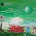 Obraz emanuje tajemniczością i spokojem, prezentując surrealistyczny krajobraz. Dominują zieleń i pastelowe barwy, nadając dziełu eteryczności. W centrum widoczna jest wielka zielona planeta, a w jej tle rozciąga się krajobraz, w którym mieszają się soczyste zielenie i czerwień kwiatów. Latarnia po lewej stronie wydaje się nie na miejscu, jakby wyjęta z innego świata. Kompozycja jest intrygująca, prowadzi wzrok od lampy, przez pole kwiatów, po siedzącą postać. Owa postać, trochę jakby z bajki, wpatrzona jest w niebo. Obok niej błękitne skrzydło. Hmm, czyżby była wróżką? Nastrój jest senny, jakbyśmy przenieśli się do innego wymiaru. Artysta użył technik mieszanych, co dodaje tekstury, zwłaszcza w okolicach planety, sprawiając, że powierzchnia wydaje się niemal trójwymiarowa. Możliwe, że inspiracją był sen lub magiczna historia. Dzieło przywołuje emocje spokoju i refleksji, a także ciekawości co do tajemniczego świata przedstawionego. It's like stepping into a dream. Może to sprawić, że poczujemy się jak dziecko, które odkrywa nowy świat. Zastanawiają się jakby się tam żyło, gdzie świeci ta złota latarnia i czy da się polecieć na tym skrzydle. Fantastyczny obraz.