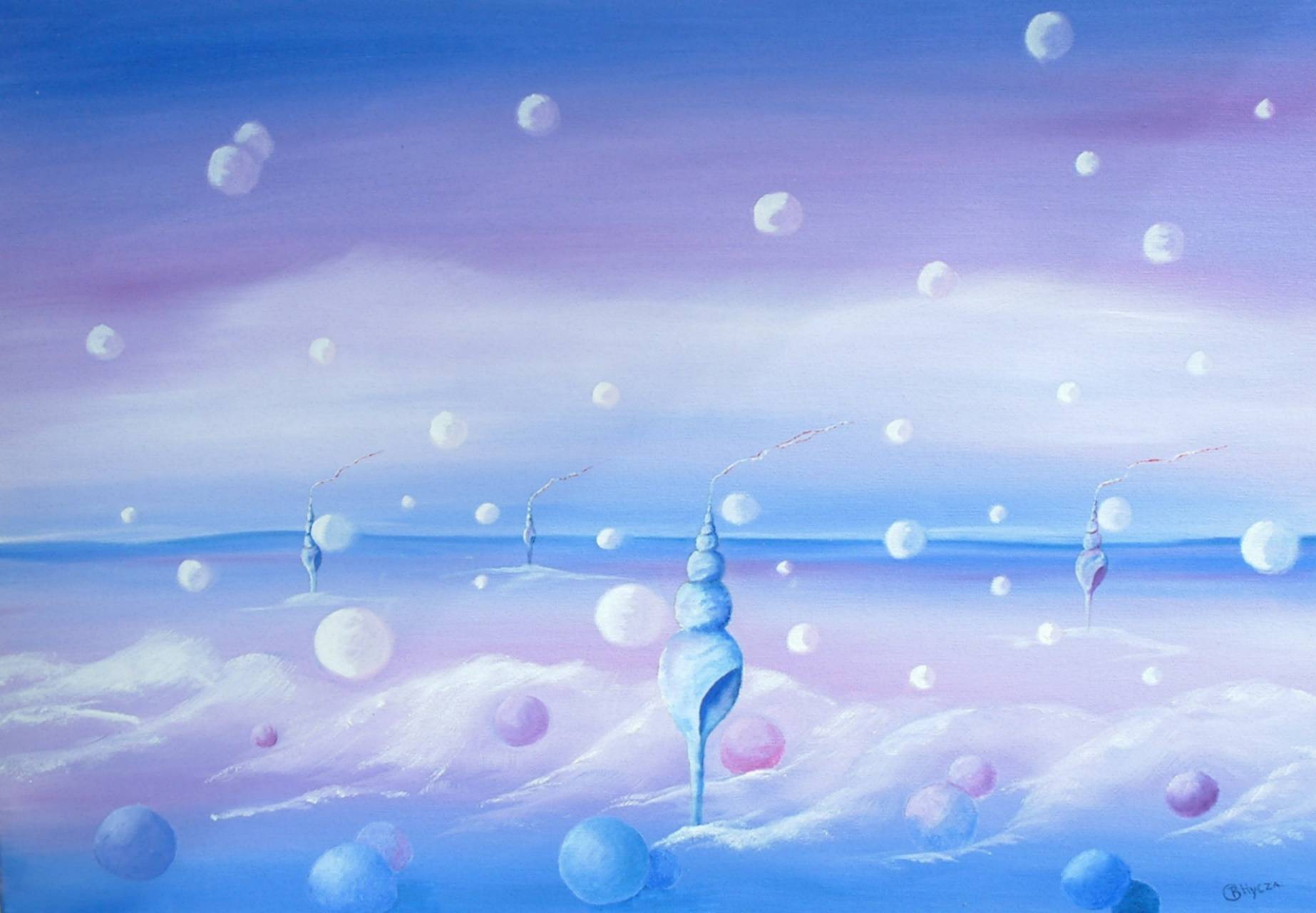 Obraz emanuje subtelną harmonią, a jego kolorystyka to delikatne odcienie błękitów i różów, które przechodzą w siebie niczym marzenie. Przestrzeń jest pełna okrągłych form, które unoszą się w surrealistycznym krajobrazie, niczym unoszące się bańki mydlane. Jest tu coś magicznego, jakby świat przedstawiony był na granicy rzeczywistości i snu. Wygląda jak lodowe królestwo. Kompozycja jest spokojna, a jednocześnie dynamiczna dzięki tym unoszącym się kulom, które sprawiają, że wzrok porusza się po płótnie. Atmosfera obrazu jest medytacyjna i tajemnicza. Wydaje się, że czas tutaj przestał istnieć. Artysta posługuje się lekkością pędzla, tworząc miękkie przejścia kolorystyczne. Technika impresjonistyczna wyłania się z delikatnych smug farby. Patrzę na ten obraz i czuję spokój, jak w ciche zimowe popołudnie. „Wygląda jak zaspa pełna baloników!” - powiedziałoby dziecko. Coś w tym jest. Ten obraz to "dreamscape", który przyciąga i nie puszcza. Może wywołać w odbiorcy melancholię, ale i fascynację nieznanym. Wciąga nas do świata, gdzie można odpocząć od zgiełku codzienności i zanurzyć się w ciszy.