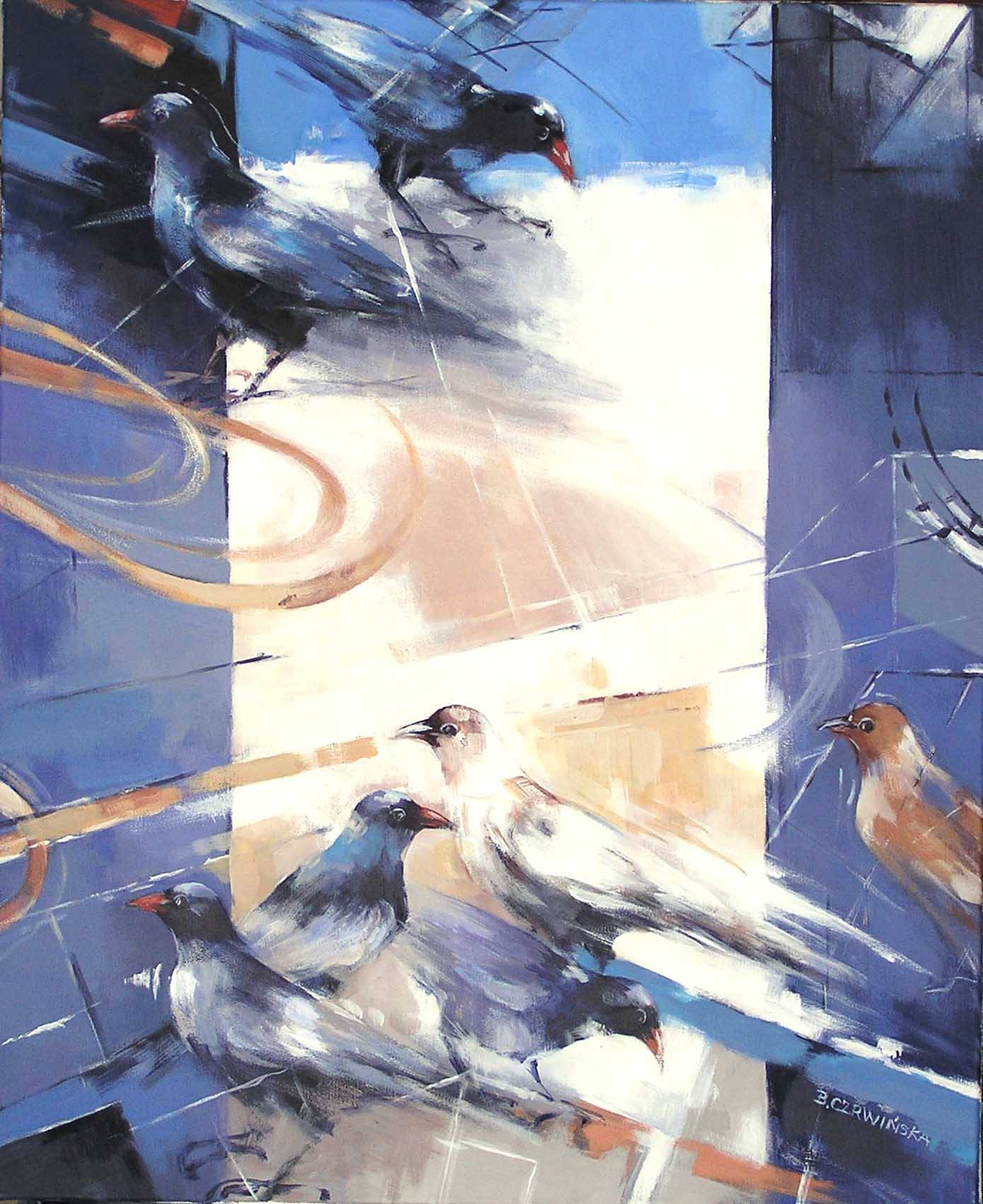 Na obrazie dominują przyjemne odcienie niebieskiego i bieli, które tworzą zharmonizowaną, dynamiczną kompozycję. Ptaki, śmigające po płótnie, wydają się być w ruchu – ich sylwetki są lekko rozmazane, jakby uchwycone w locie. Malarska technika zastosowana przez artystę wprowadza poczucie delikatnego chaosu, a jednocześnie harmonii. Nastrój? Powiedzmy, że to raczej spokój przed burzą, z nutką tajemniczości. Efekt jest "eye-catching", czyli przyciągający wzrok. Te ptaki, z czerwonymi dziobami, wyglądają jak posłańcy sekretów przyrody. Styl artysty łączy realizm z impresjonistycznym pociągnięciem pędzla – widać, że każda linia ma tu swoje miejsce. Pomieszanie kolorów i ruchu wywołuje uczucie wolności i ucieczki w nieznane. Jakby ktoś właśnie uchwycił moment tuż przed końcem spokojnego poranka. Dla mnie ten obraz mówi o potrzebie oderwania się od monotonii codzienności. Zastanawiam się, czy te ptaki próbują mi coś opowiedzieć, chociaż same milczą. Mamo, ptaszek lata! To dzieło łączy w sobie ciepło spontaniczności z chłodnym profesjonalizmem, a efekt końcowy jest niczym taniec barw na płótnie. Fascynujące!
