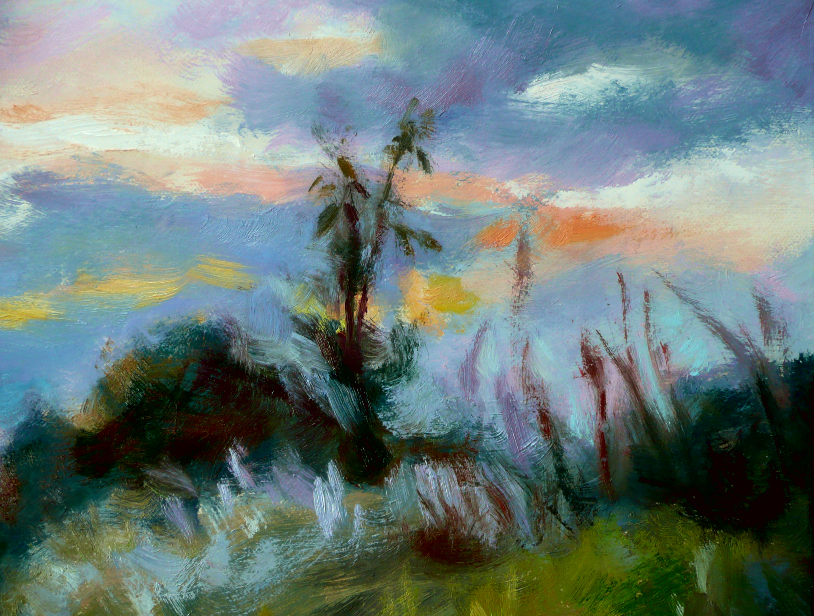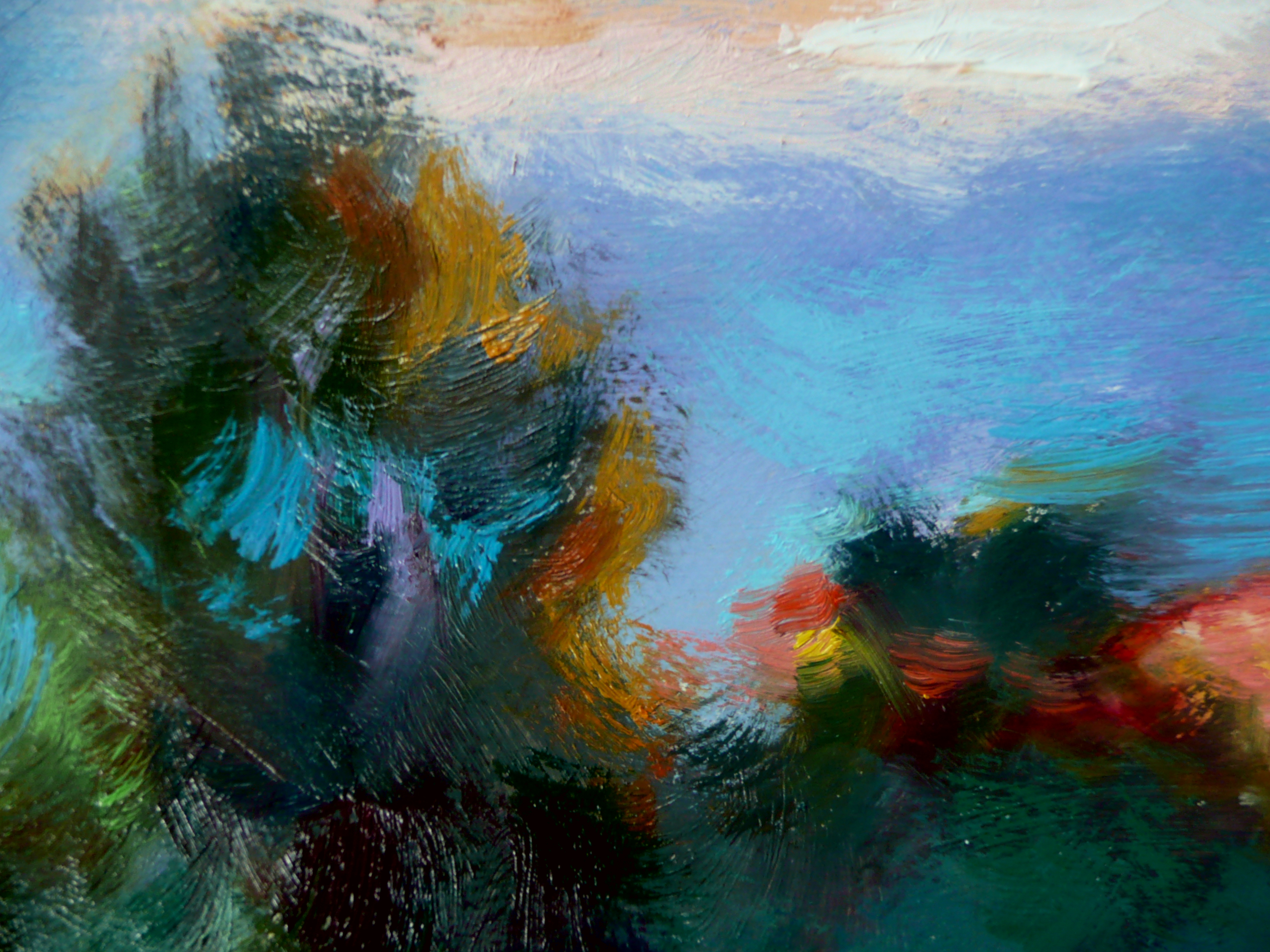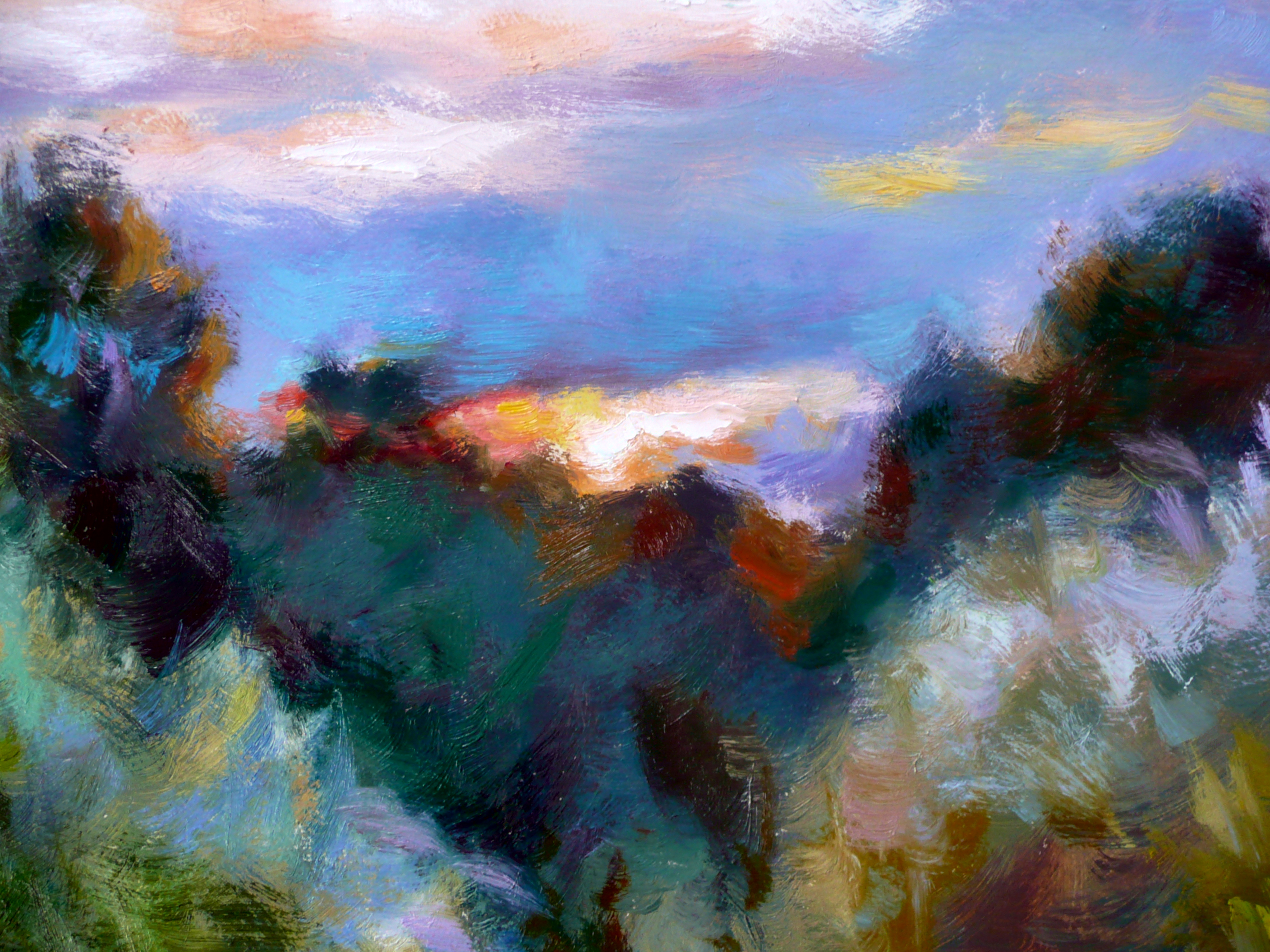 Obraz prezentuje malowniczy krajobraz, gdzie dominują głównie odcienie błękitu, zieleni i delikatnego różu. Chmury na niebie malują rozświetlone pasma, a zielenie traw kołyszą się w tańcu z wiatrem. Kompozycja jest dynamiczna, tworząc poczucie ruchu i lekkości. Mamy wrażenie, że natura na obrazie oddycha i porusza się swym własnym rytmem. Artysta zastosował tu impast, z grubą, pełną emocji fakturą. Styl przywołuje impresjonizm, skupiając się na uchwyceniu ulotnego momentu. Można poczuć pełną wolność w sposobie, w jaki pociągnięcia pędzla oddają światło i cień. Obraz wywołuje emocje spokoju i zadumy, jakby podziwiało się potęgę natury. To idealne miejsce na zatopienie się w pełni przyrody. Zachodzące słońce, popis mocy i orzeźwienia kiedy człowiek stoi w zapachu rosy w powietrzu i w palecie otulających barw. Kolory tętnią życiem, a całość jest wyrazem miłości do natury. Czuję, że ten obraz mówi: "Zatrzymaj się, spójrz, poczuj".