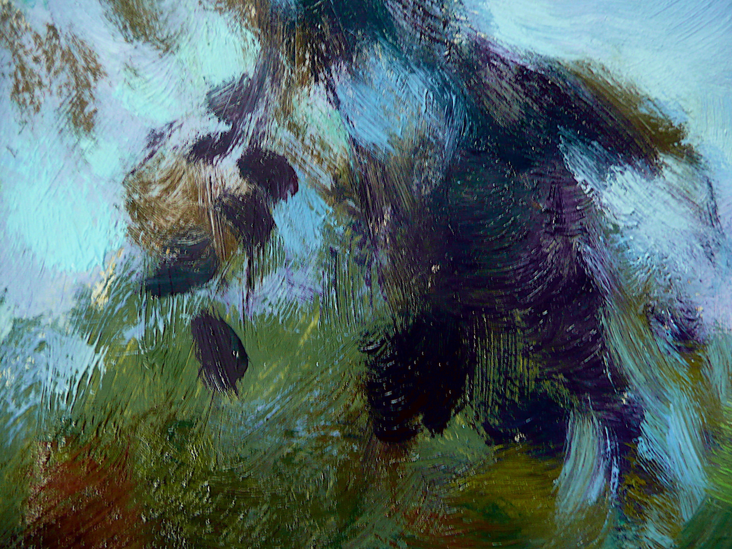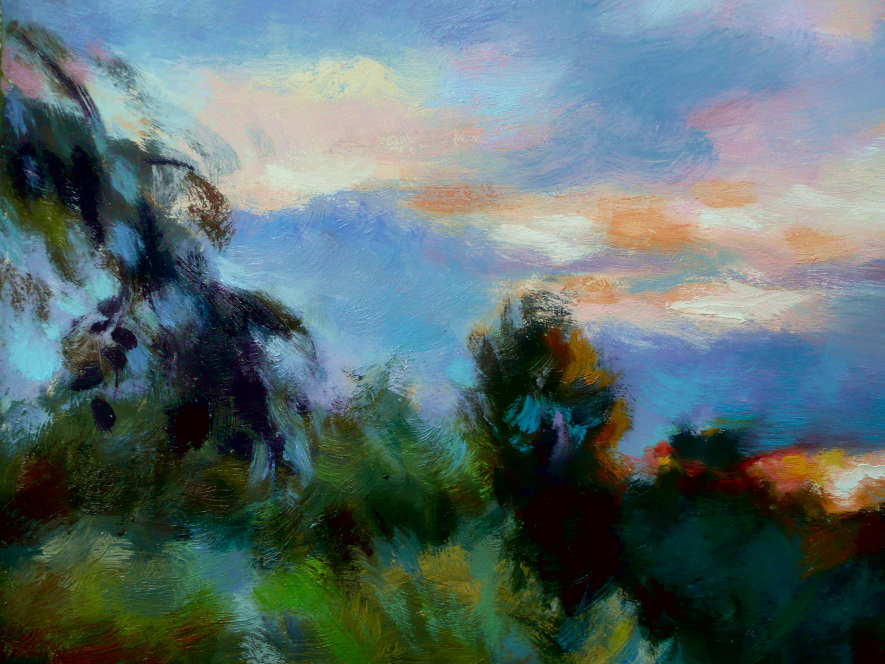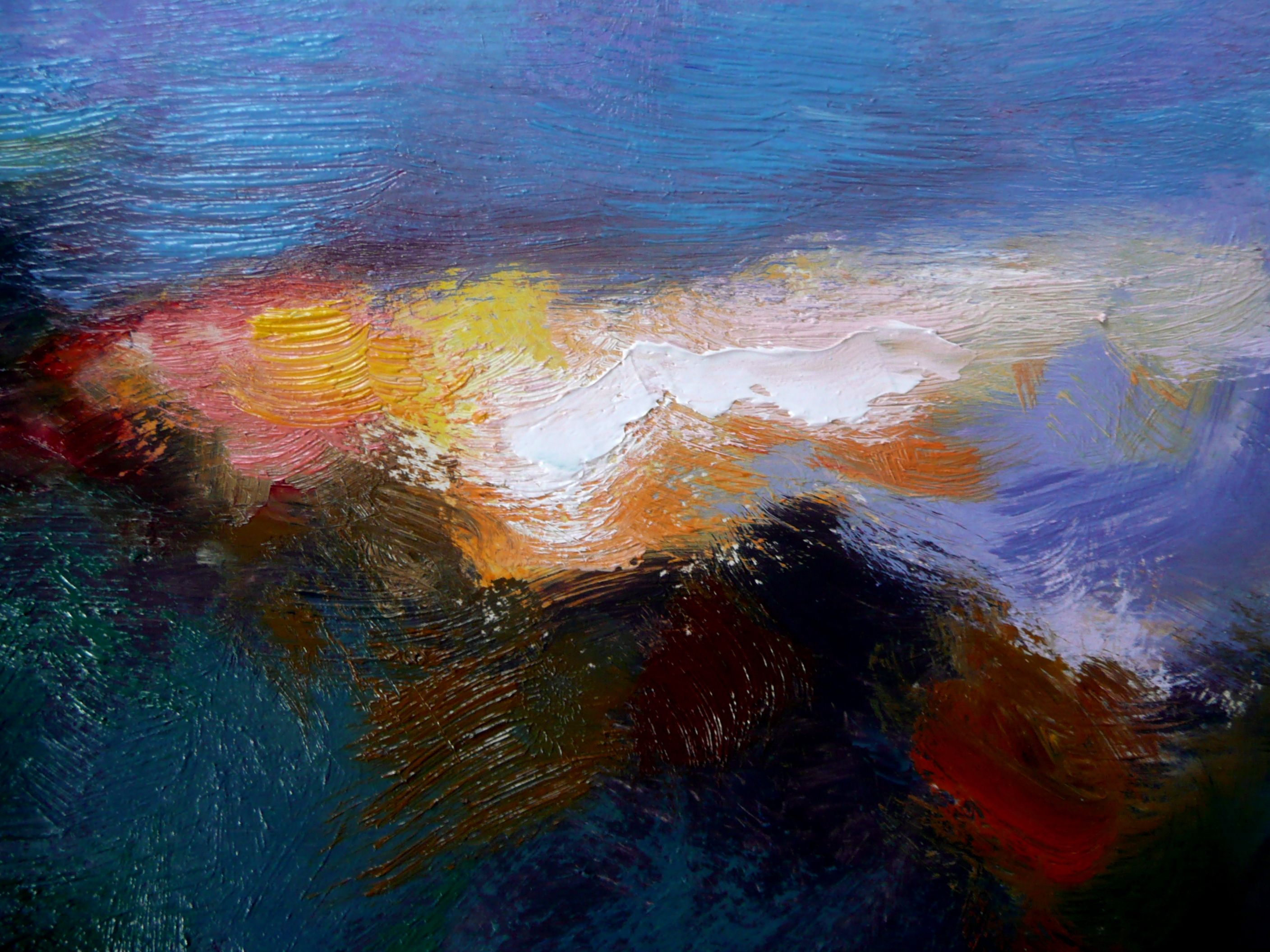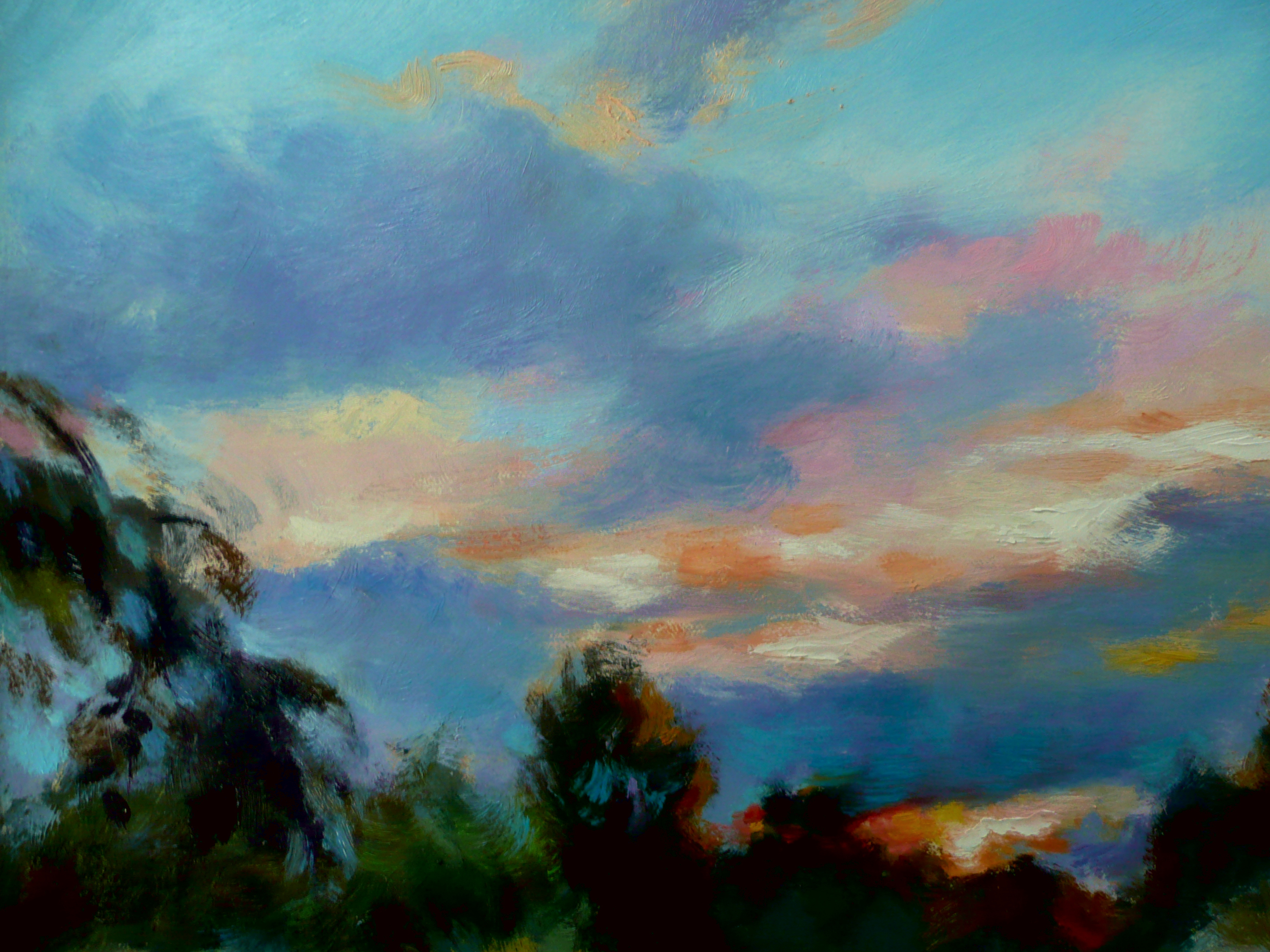 Obraz prezentuje malowniczy krajobraz, gdzie dominują głównie odcienie błękitu, zieleni i delikatnego różu. Chmury na niebie malują rozświetlone pasma, a zielenie traw kołyszą się w tańcu z wiatrem. Kompozycja jest dynamiczna, tworząc poczucie ruchu i lekkości. Mamy wrażenie, że natura na obrazie oddycha i porusza się swym własnym rytmem. Artysta zastosował tu impast, z grubą, pełną emocji fakturą. Styl przywołuje impresjonizm, skupiając się na uchwyceniu ulotnego momentu. Można poczuć pełną wolność w sposobie, w jaki pociągnięcia pędzla oddają światło i cień. Obraz wywołuje emocje spokoju i zadumy, jakby podziwiało się potęgę natury. To idealne miejsce na zatopienie się w pełni przyrody. Zachodzące słońce, popis mocy i orzeźwienia kiedy człowiek stoi w zapachu rosy w powietrzu i w palecie otulających barw. Kolory tętnią życiem, a całość jest wyrazem miłości do natury. Czuję, że ten obraz mówi: "Zatrzymaj się, spójrz, poczuj".