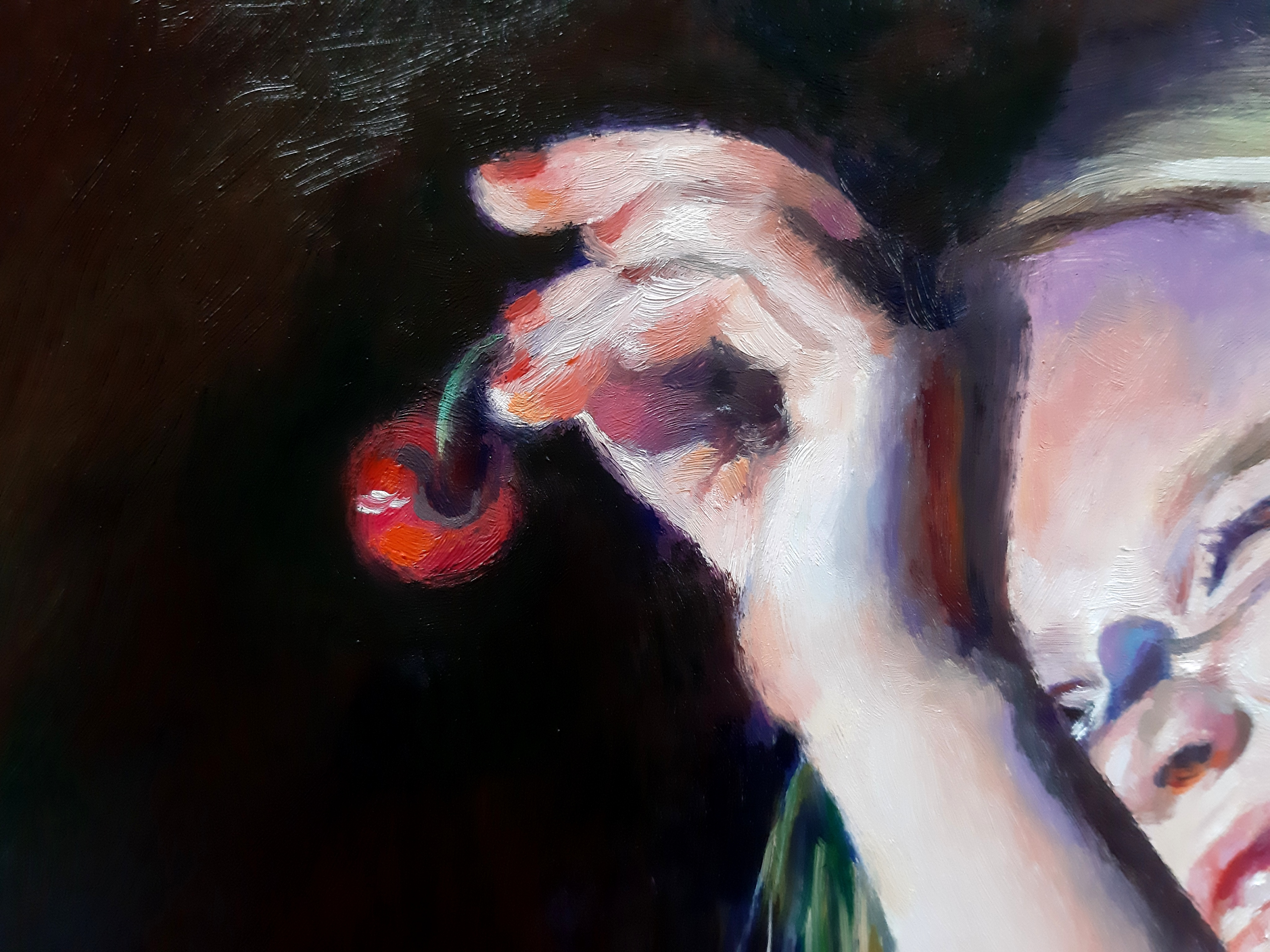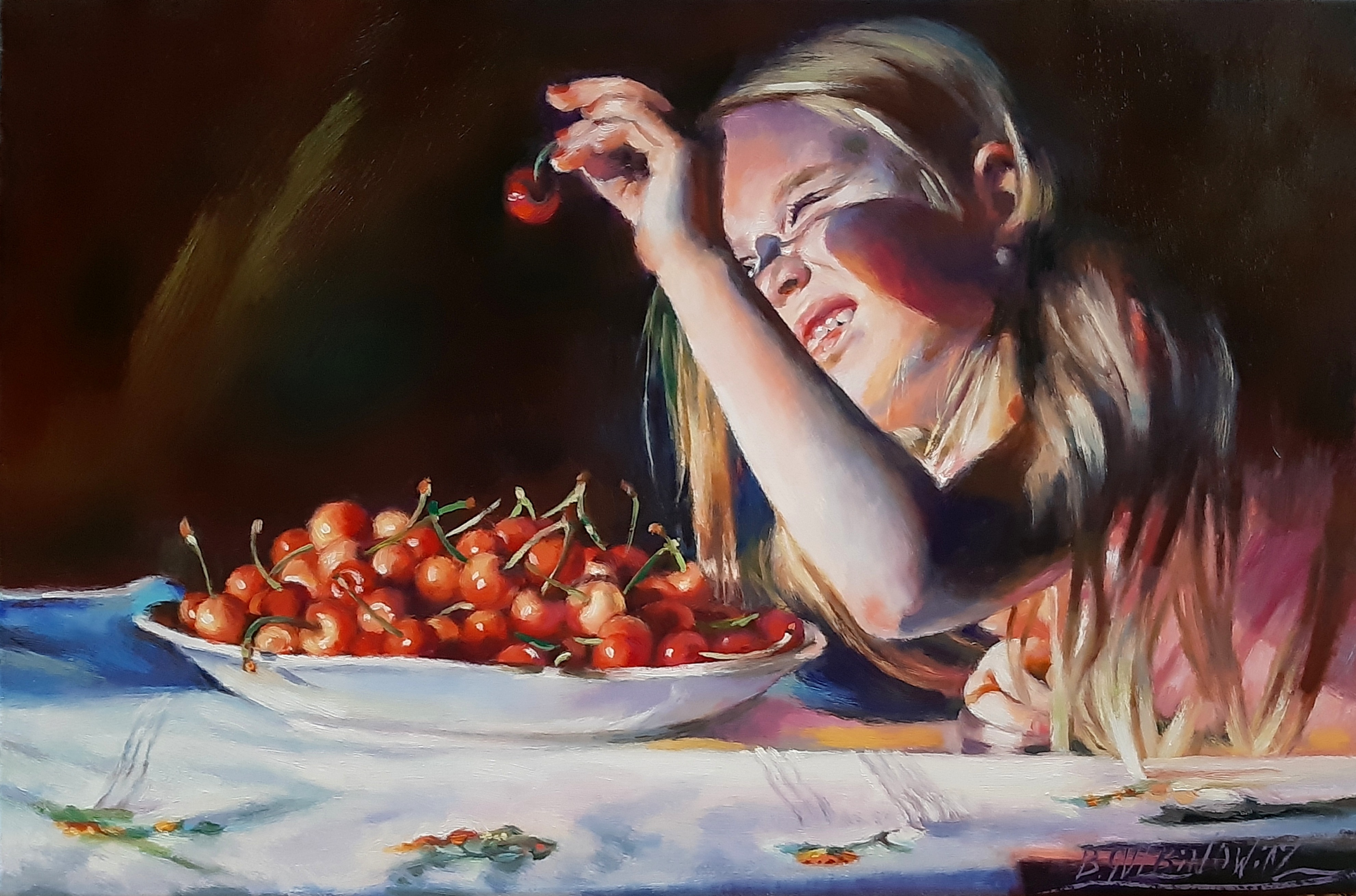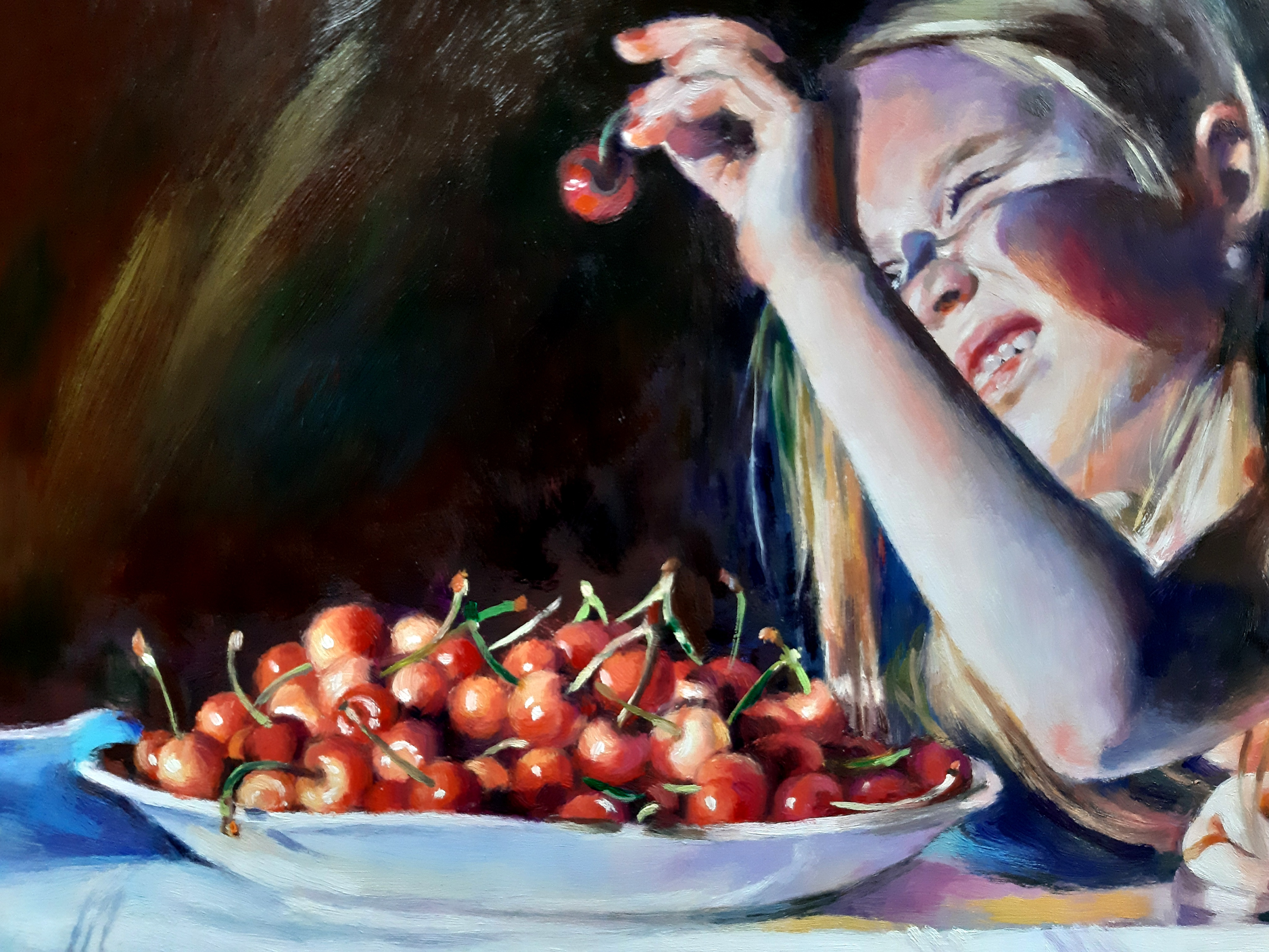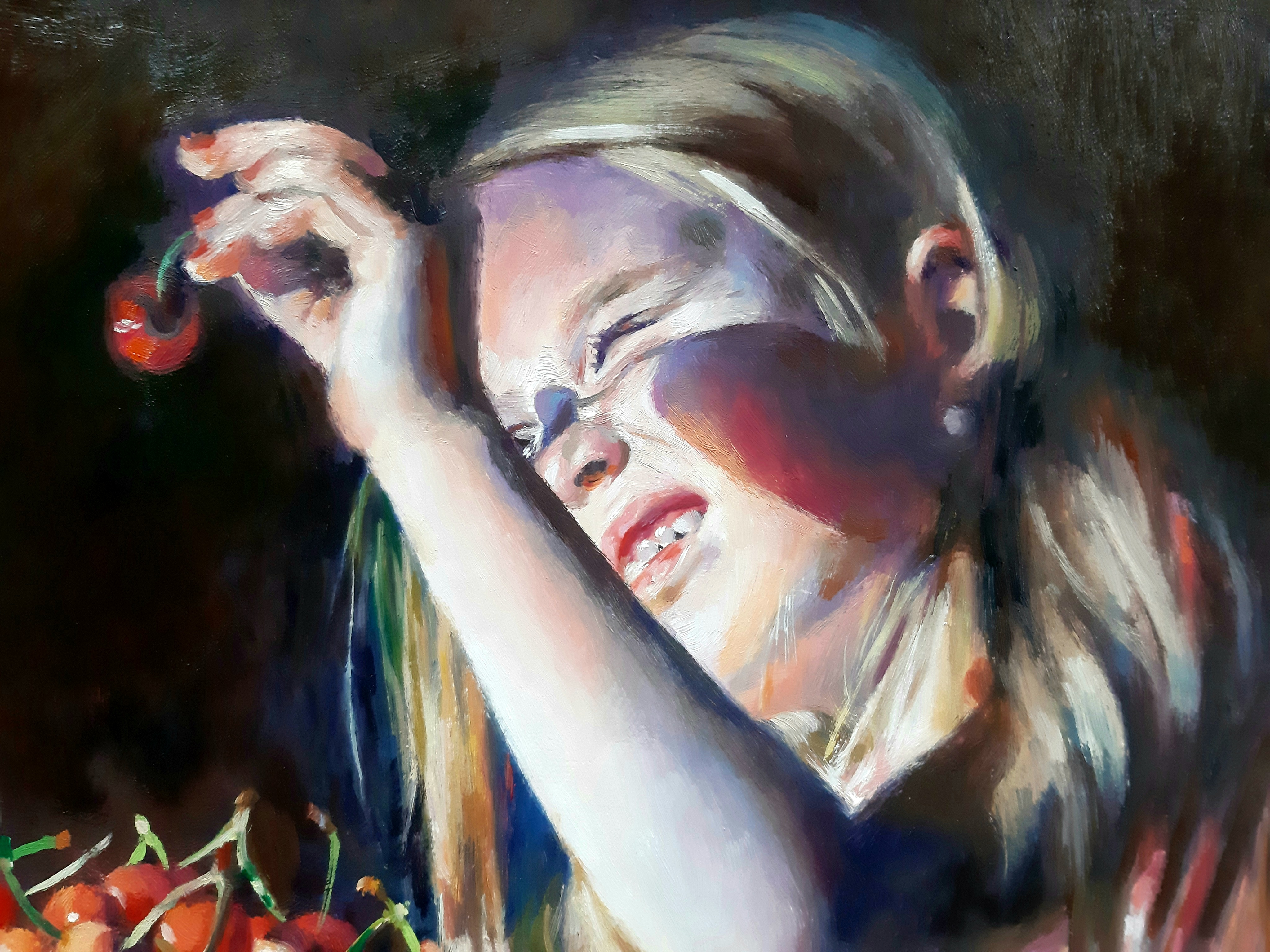 Obraz przedstawia dziewczynkę rozkoszującą się widokiem i smakiem soczystych czereśni. Jej włosy mienią się w słońcu, tworząc kontrast z ciemnym tłem, które podkreśla jasne elementy sceny. Pełen ciepłych barw, od czerwieni do pomarańczy, emanuje lekkością. Kompozycja skoncentrowana na dynamice postaci i połyskujących owocach daje wrażenie ruchu i beztroski. Światło jest tu kluczowe – pada ukośnie, wydobywając głębię. Patrząc na ten obraz, można poczuć smak słońca na skórze i delikatny, owocowy zapach lata. Twarz dziewczynki, spontaniczny grymas wyraża swobodę. Uchwycono autentyczną radość dziecięcych lat. Obraz malowany sercem, które kocha proste chwile pełne magii. Sama kwintesencja lata: przyjemności, które sprawiają, że czujemy się żywi. Ten widok zostawia nas w poczuciu szczęścia.