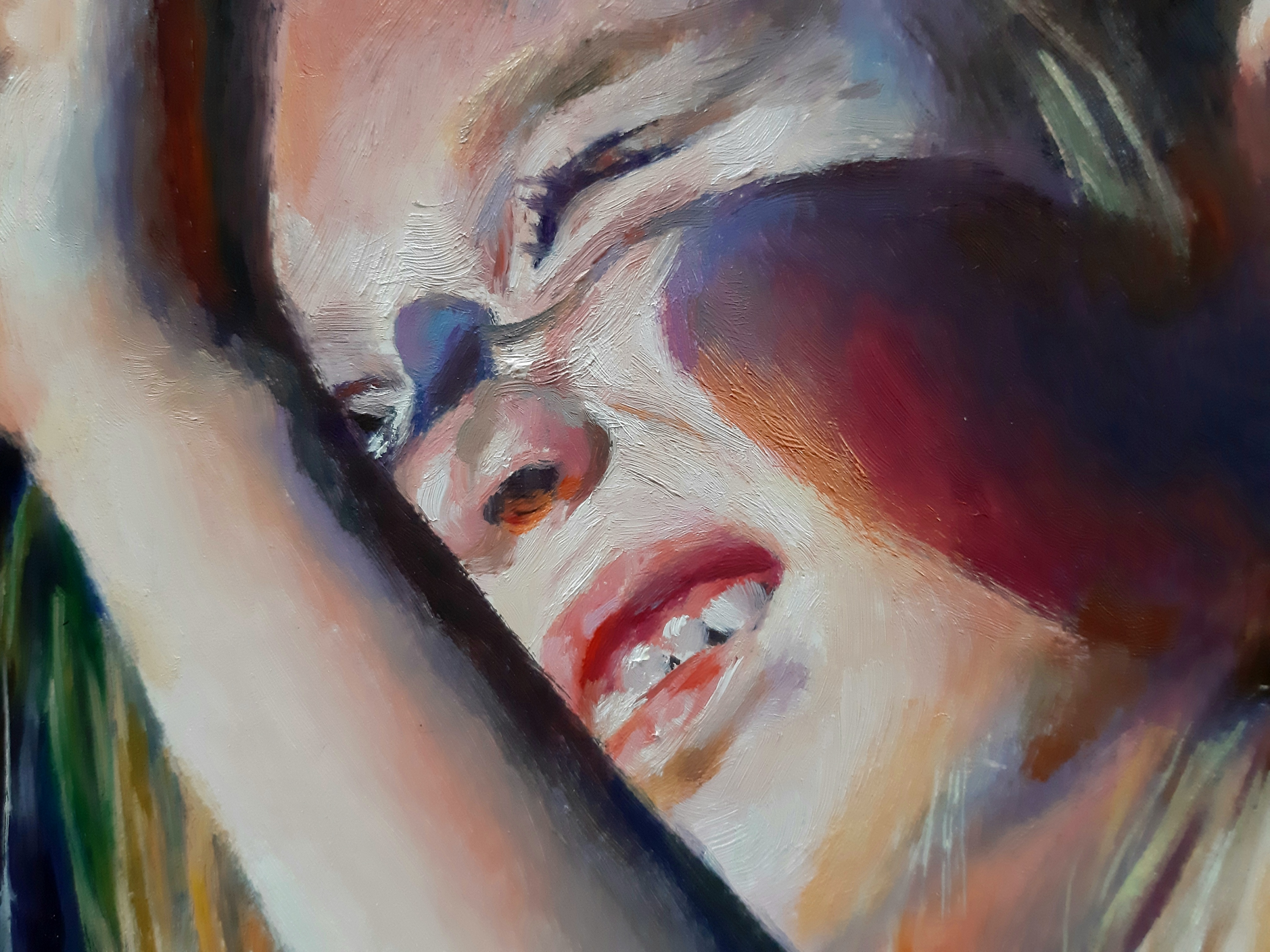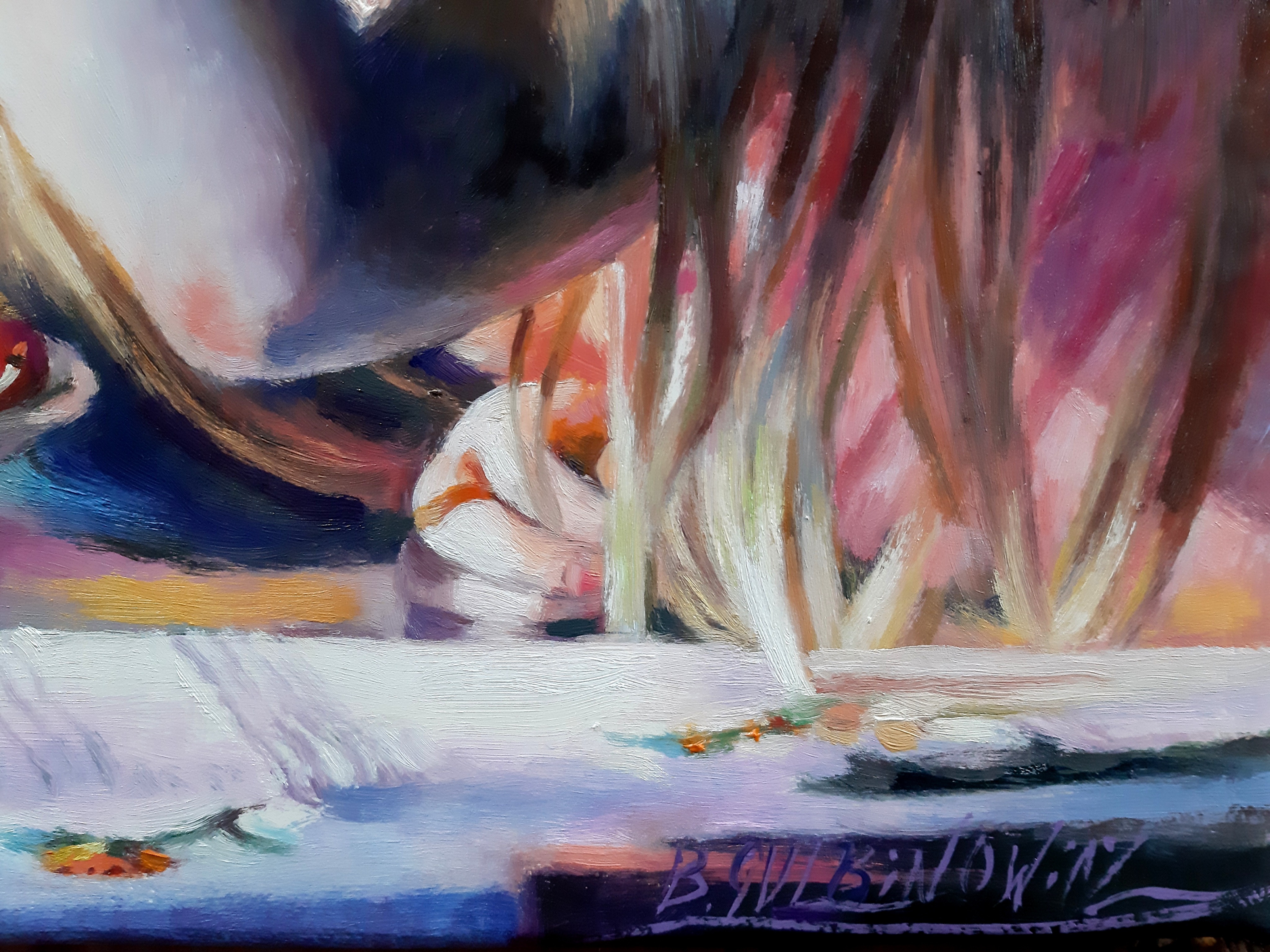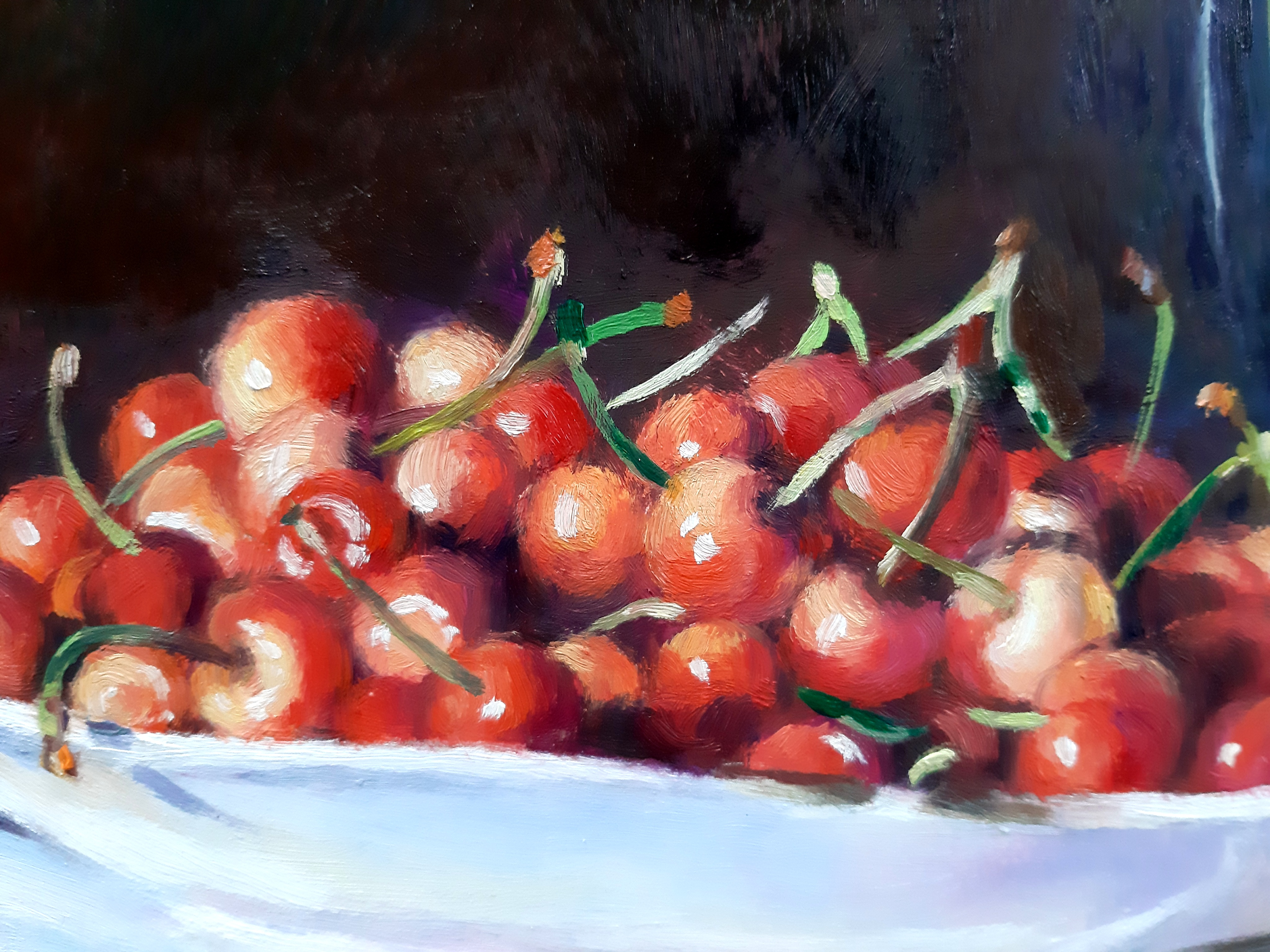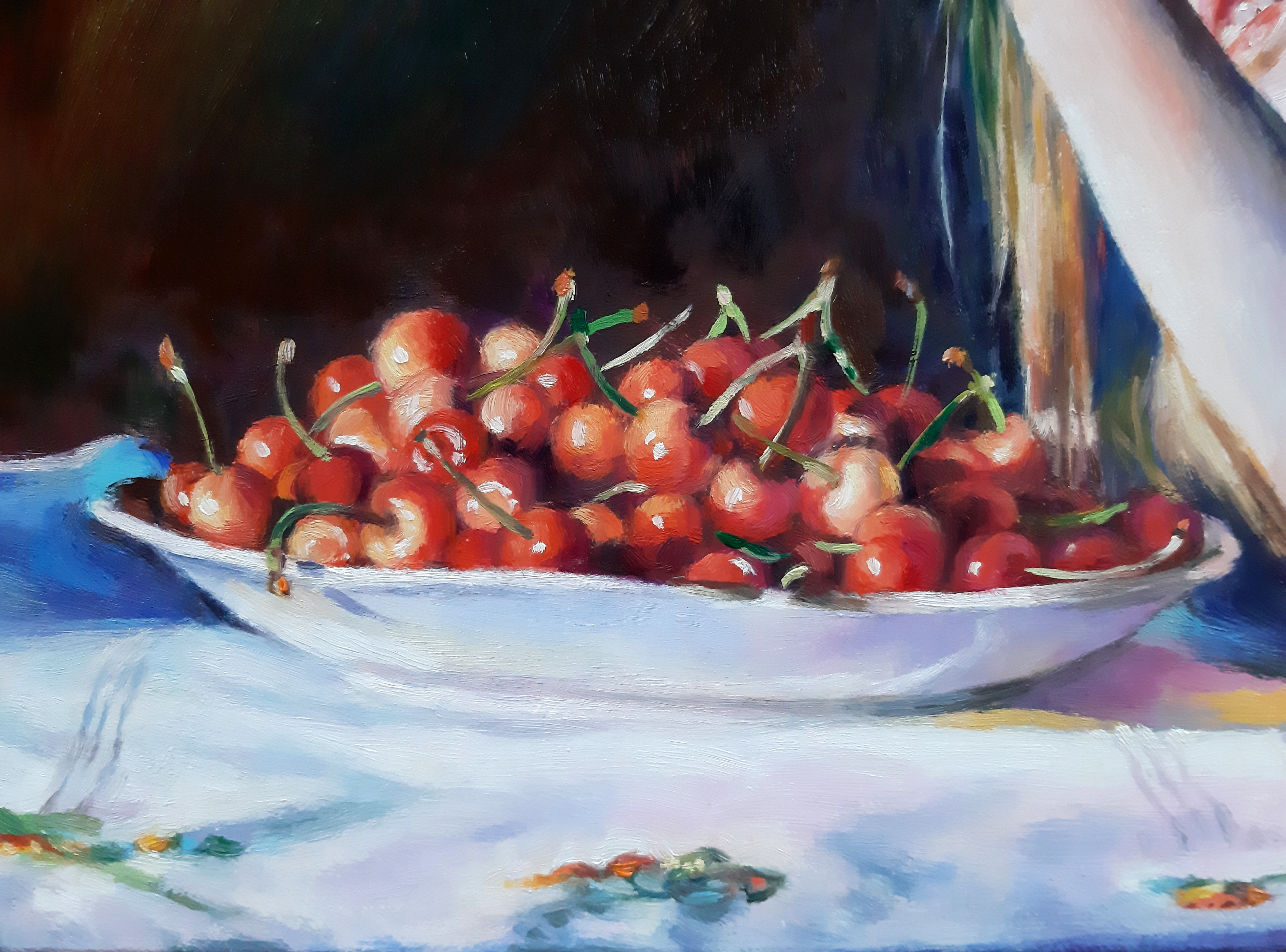 Obraz przedstawia dziewczynkę rozkoszującą się widokiem i smakiem soczystych czereśni. Jej włosy mienią się w słońcu, tworząc kontrast z ciemnym tłem, które podkreśla jasne elementy sceny. Pełen ciepłych barw, od czerwieni do pomarańczy, emanuje lekkością. Kompozycja skoncentrowana na dynamice postaci i połyskujących owocach daje wrażenie ruchu i beztroski. Światło jest tu kluczowe – pada ukośnie, wydobywając głębię. Patrząc na ten obraz, można poczuć smak słońca na skórze i delikatny, owocowy zapach lata. Twarz dziewczynki, spontaniczny grymas wyraża swobodę. Uchwycono autentyczną radość dziecięcych lat. Obraz malowany sercem, które kocha proste chwile pełne magii. Sama kwintesencja lata: przyjemności, które sprawiają, że czujemy się żywi. Ten widok zostawia nas w poczuciu szczęścia.