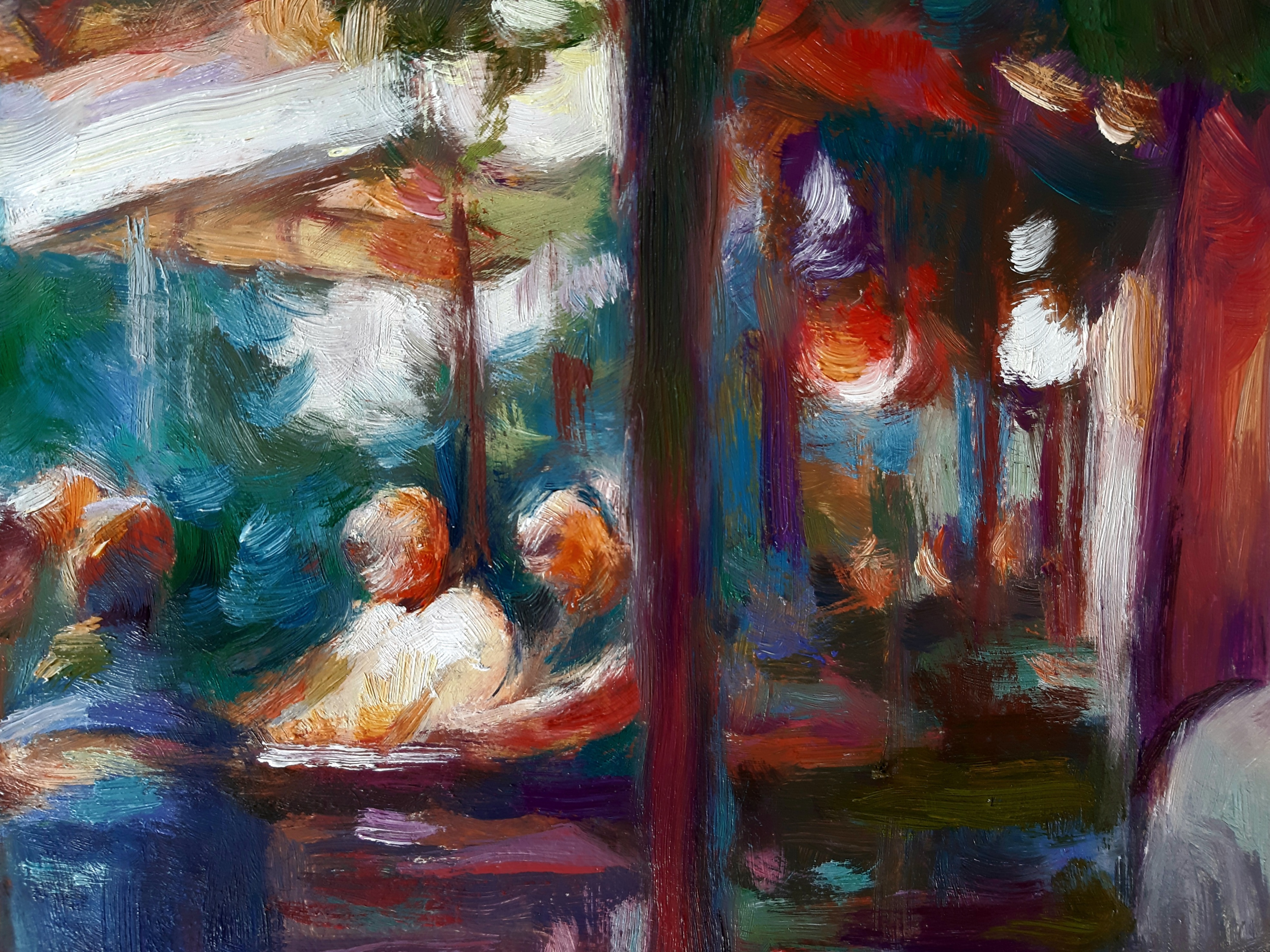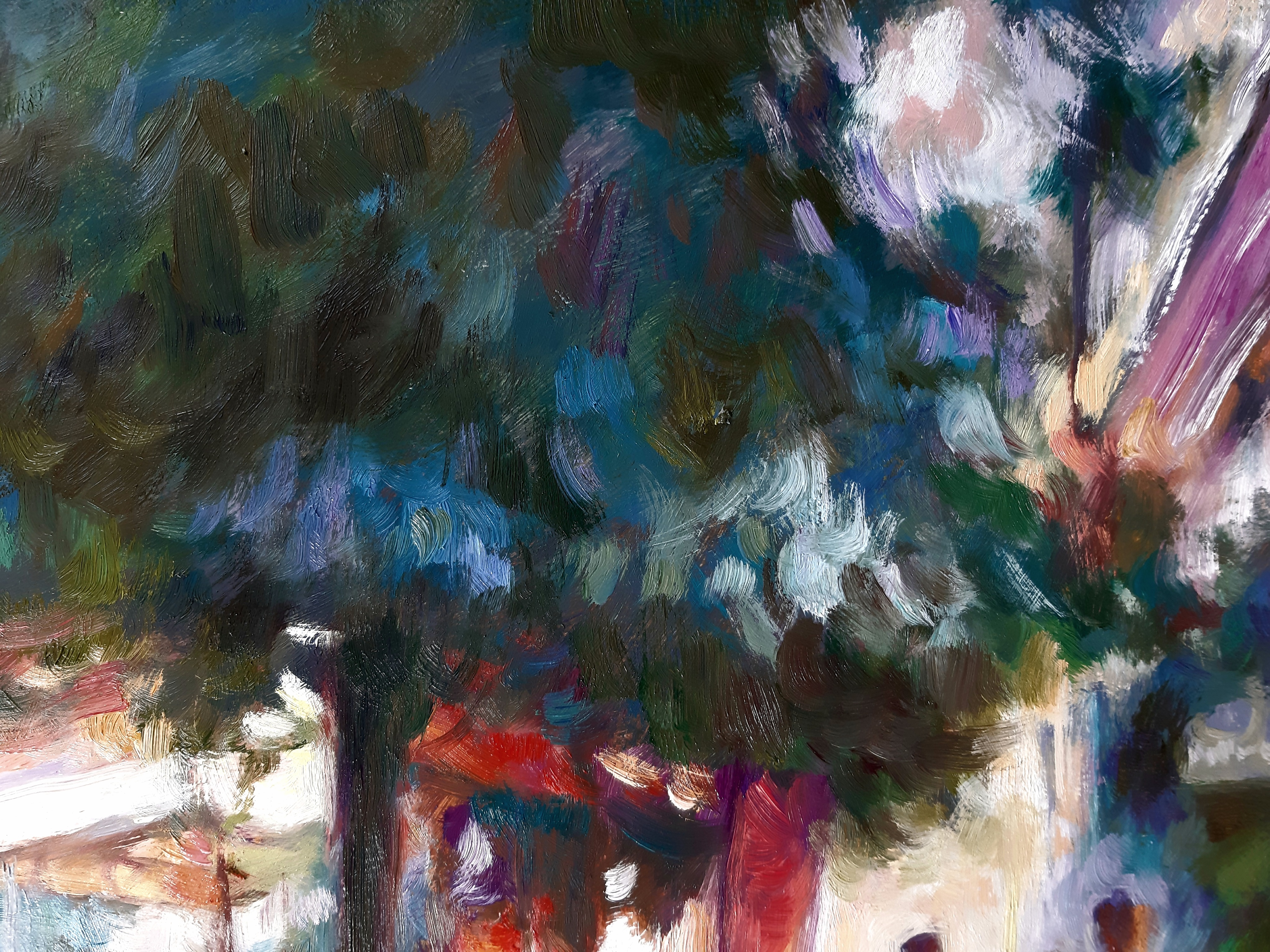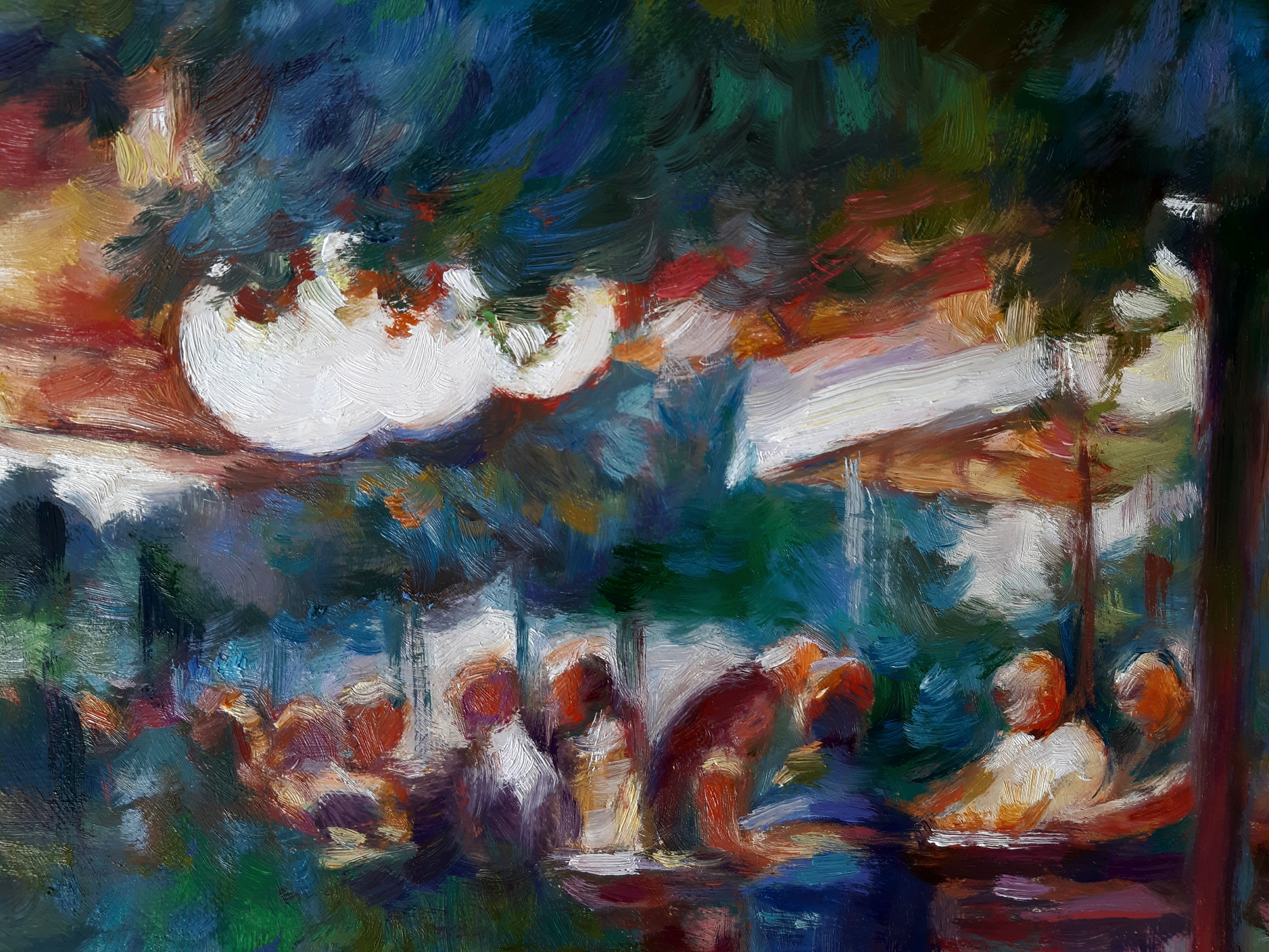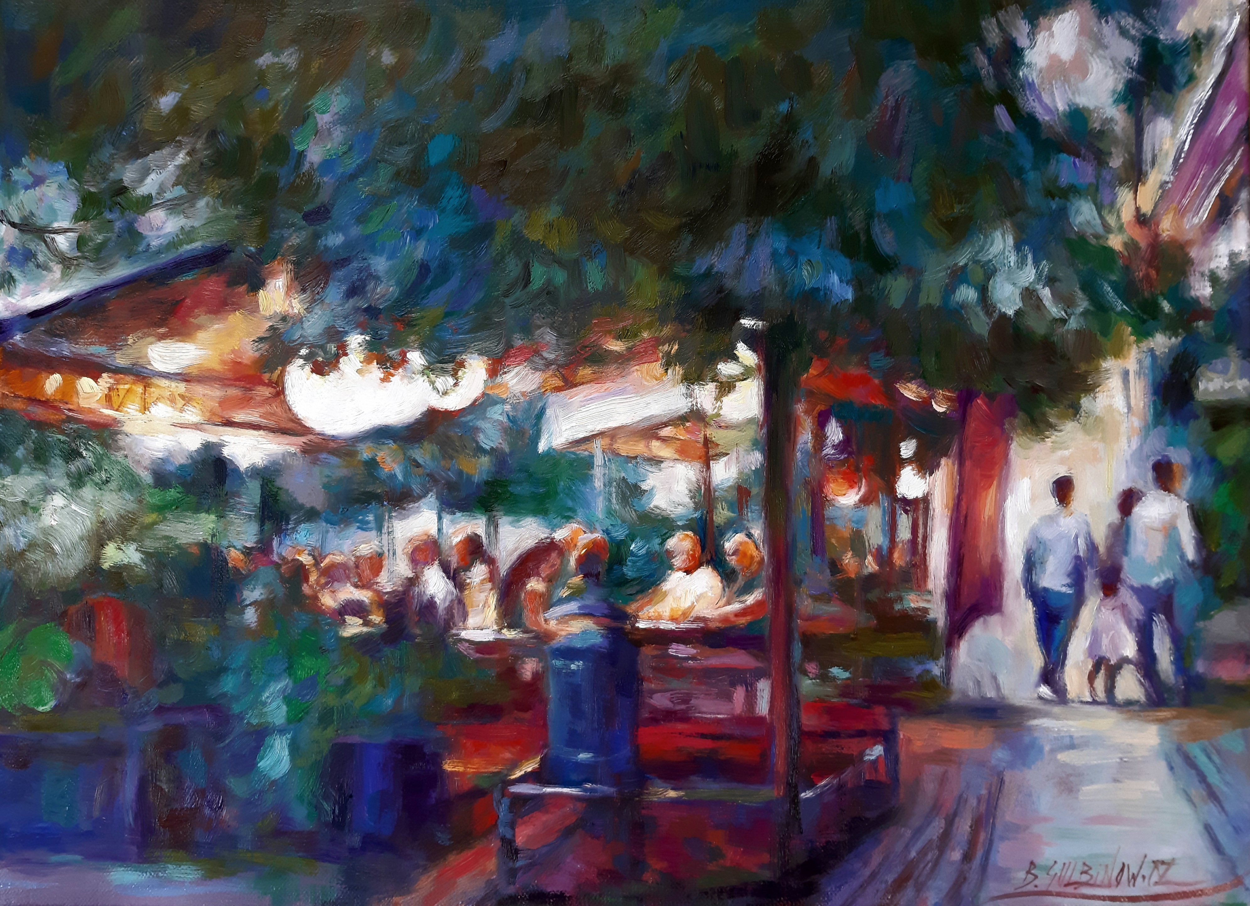 "Wieczór w letniej kawiarence", olej na płótnie, 40x55 cm. Nastrojowy obraz w odcieniach nasyconych błękitów, mocne kontrasty stanowią akcenty świetlne - obszary, gdzie toczy się ożywione życie towarzyskie. Wspomnienie letniego, wakacyjnego wieczoru. Obraz malowany swobodnymi pociągnięciami pędzla, z wyraźną fakturą,