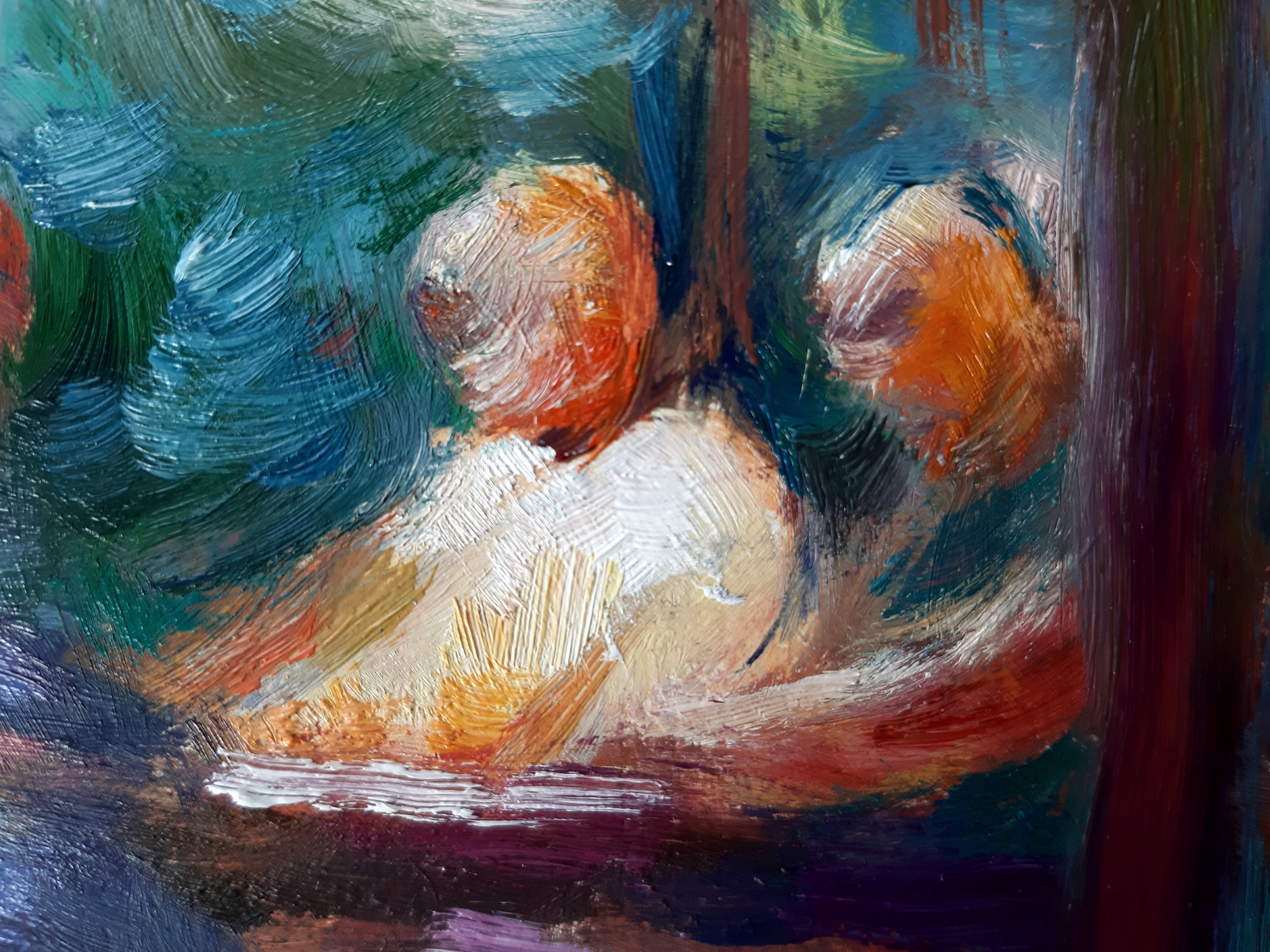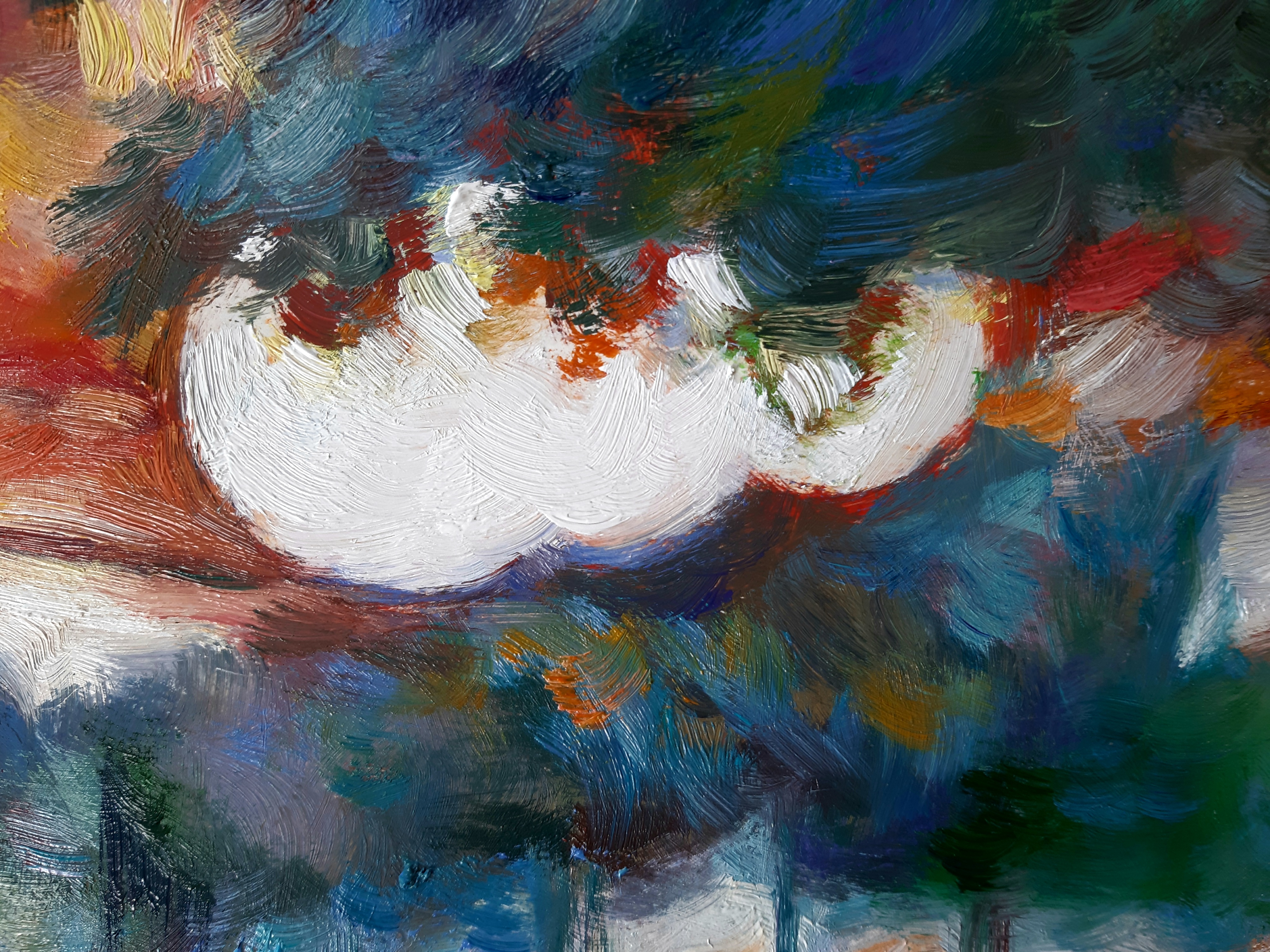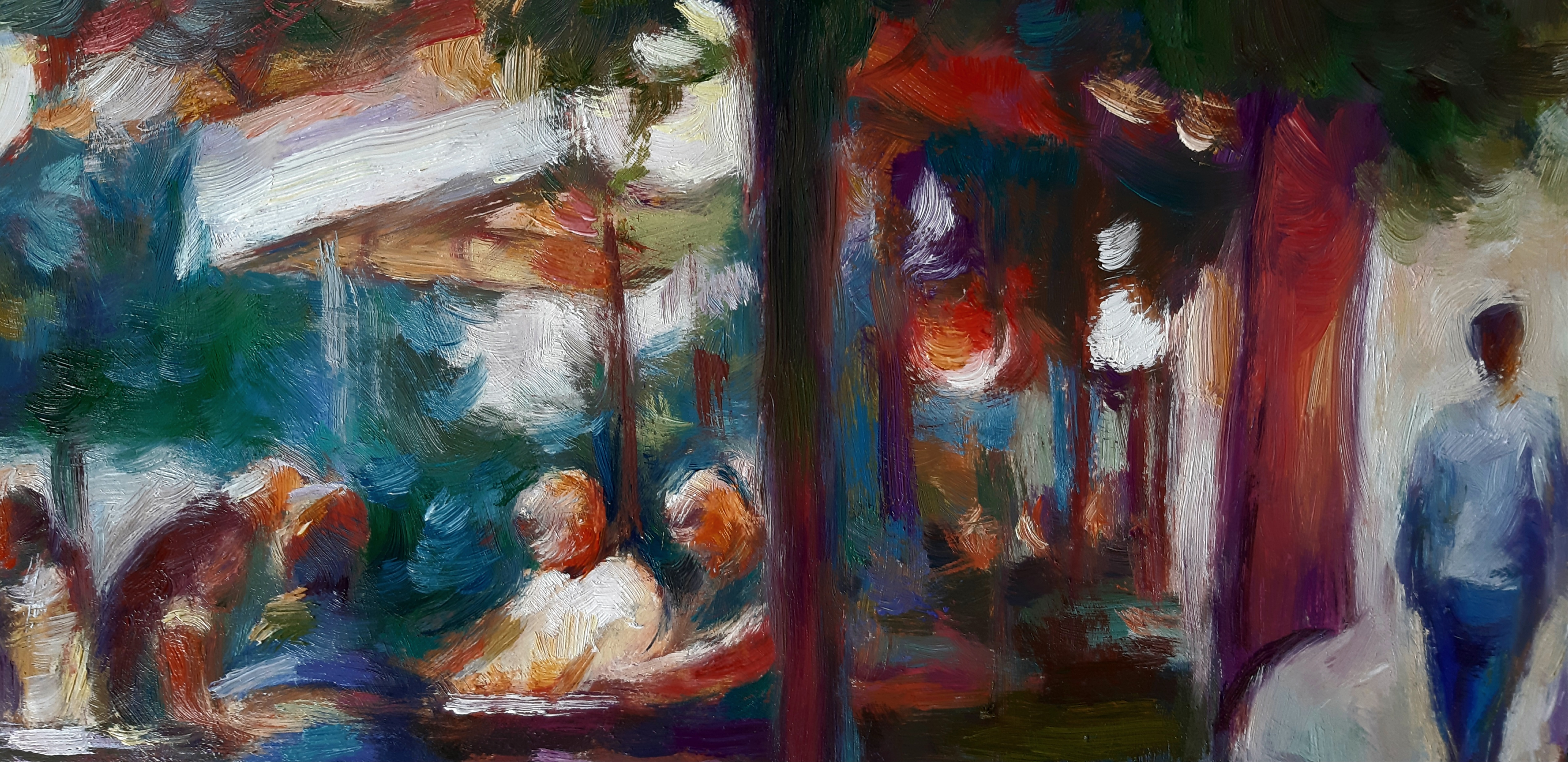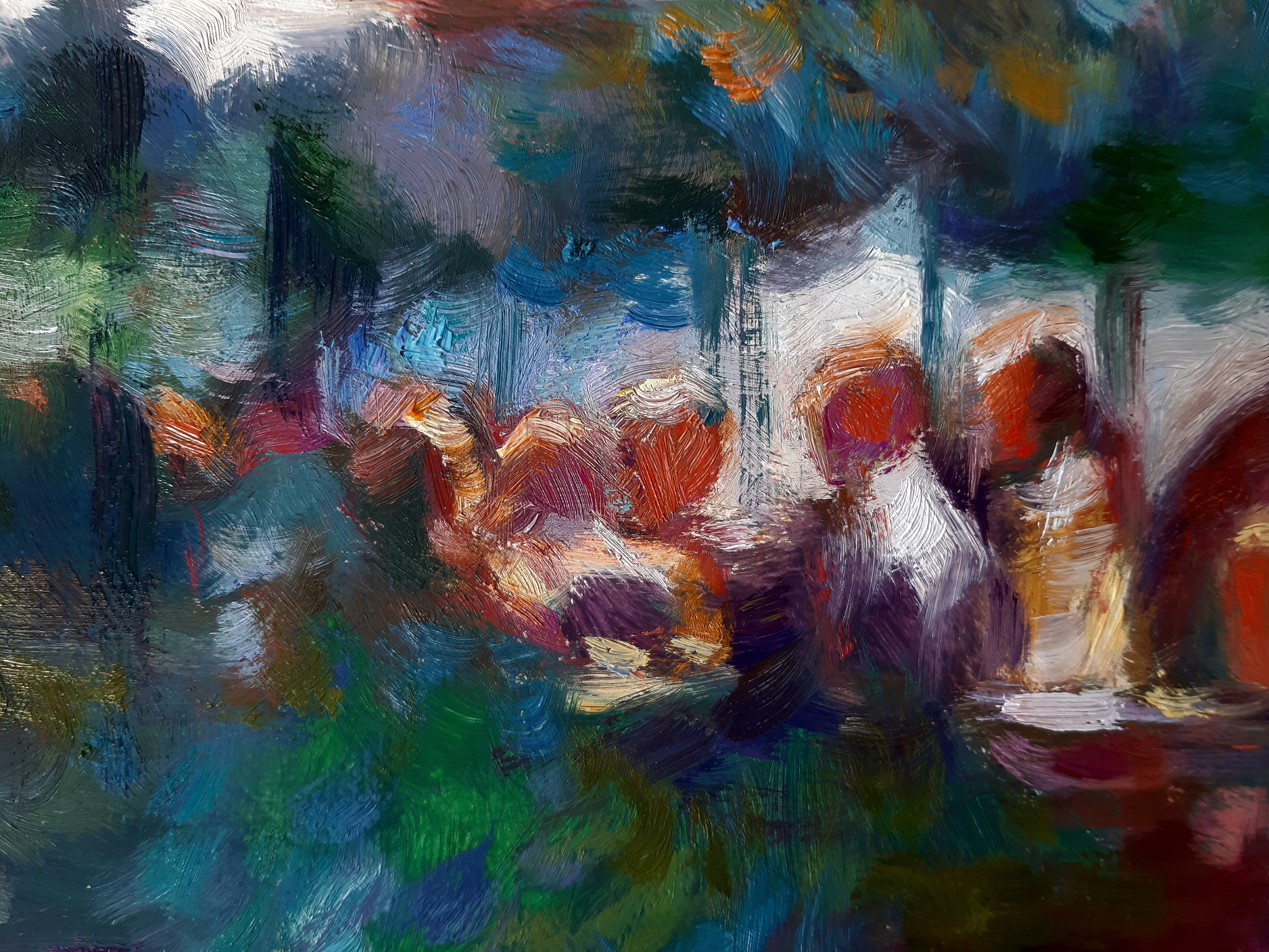 "Wieczór w letniej kawiarence", olej na płótnie, 40x55 cm. Nastrojowy obraz w odcieniach nasyconych błękitów, mocne kontrasty stanowią akcenty świetlne - obszary, gdzie toczy się ożywione życie towarzyskie. Wspomnienie letniego, wakacyjnego wieczoru. Obraz malowany swobodnymi pociągnięciami pędzla, z wyraźną fakturą,