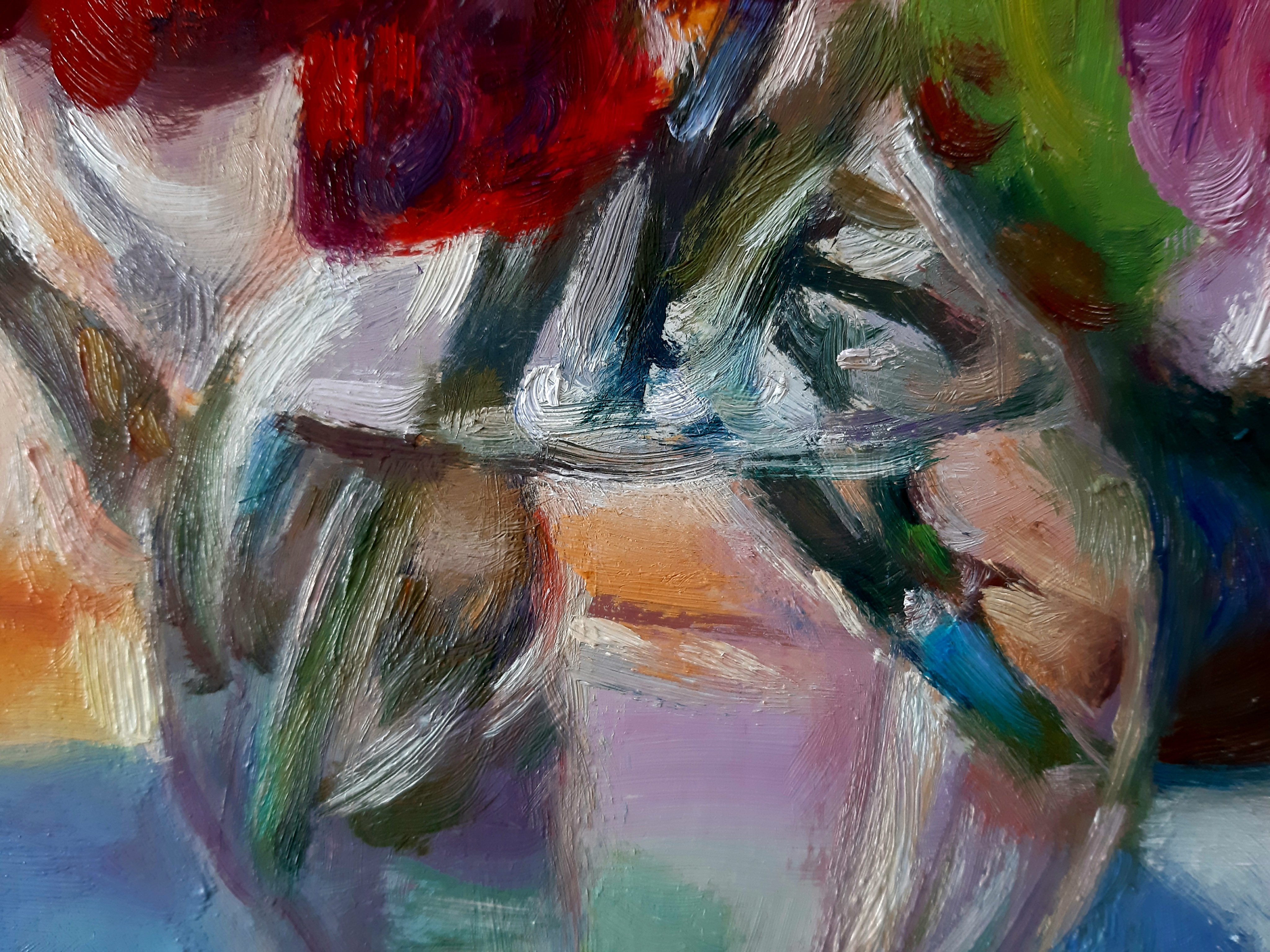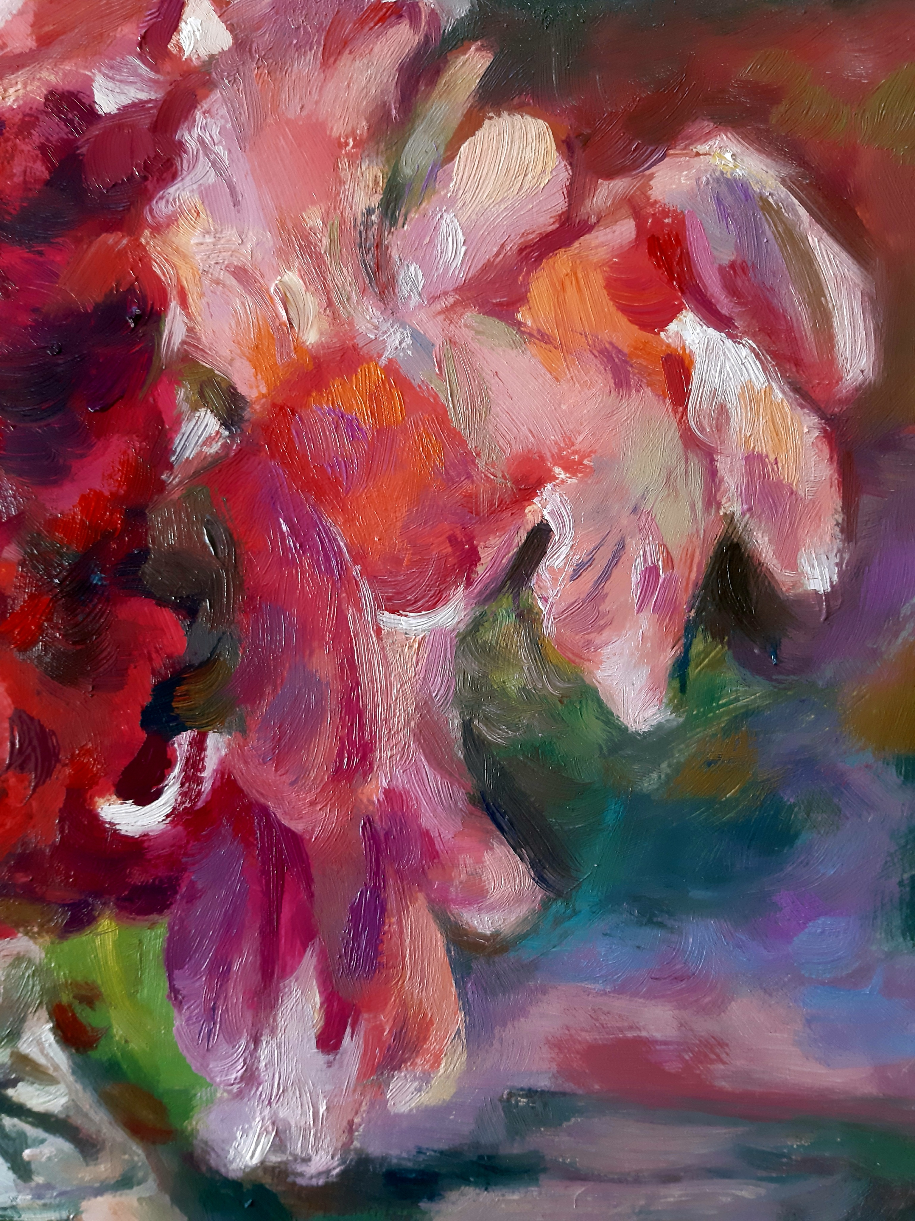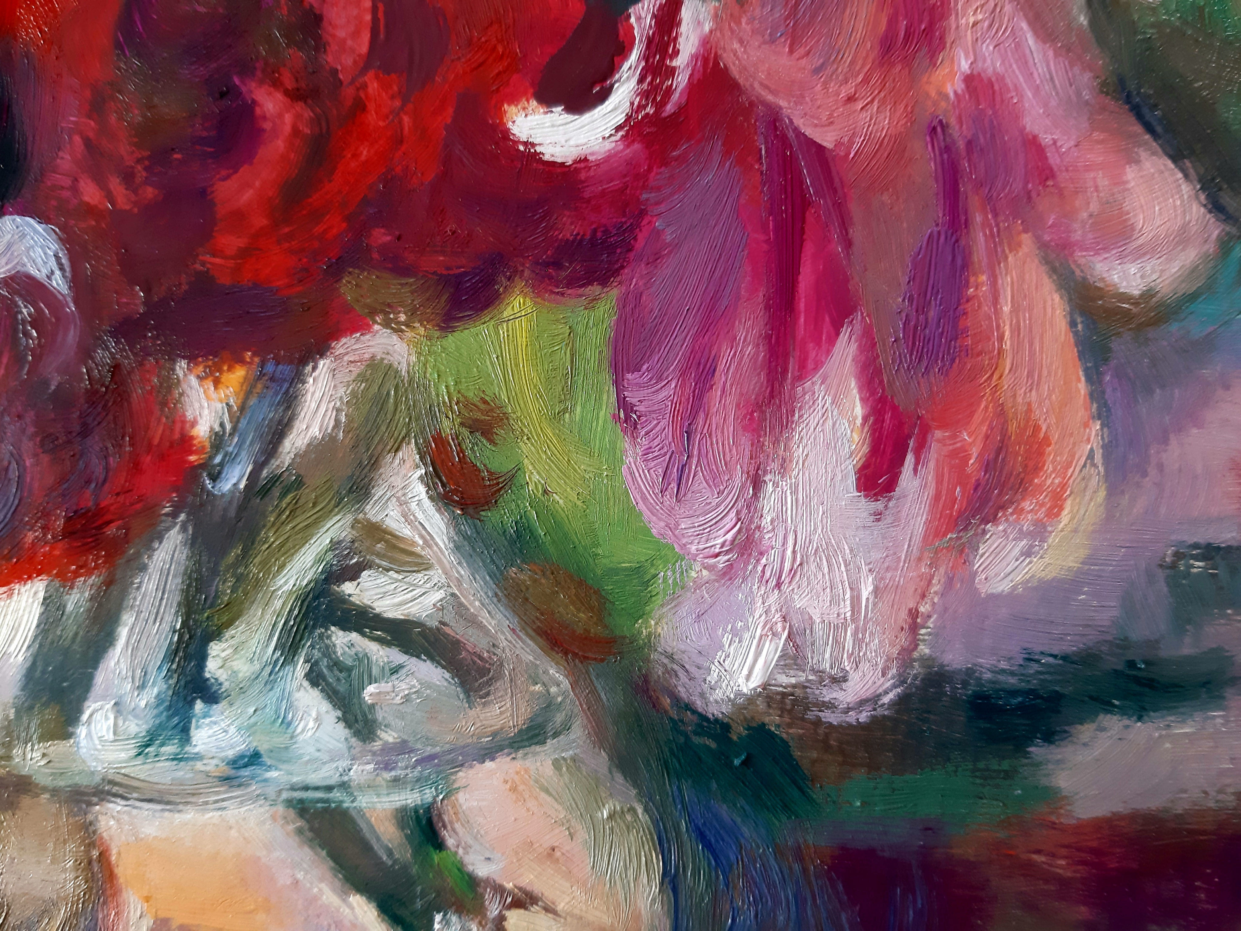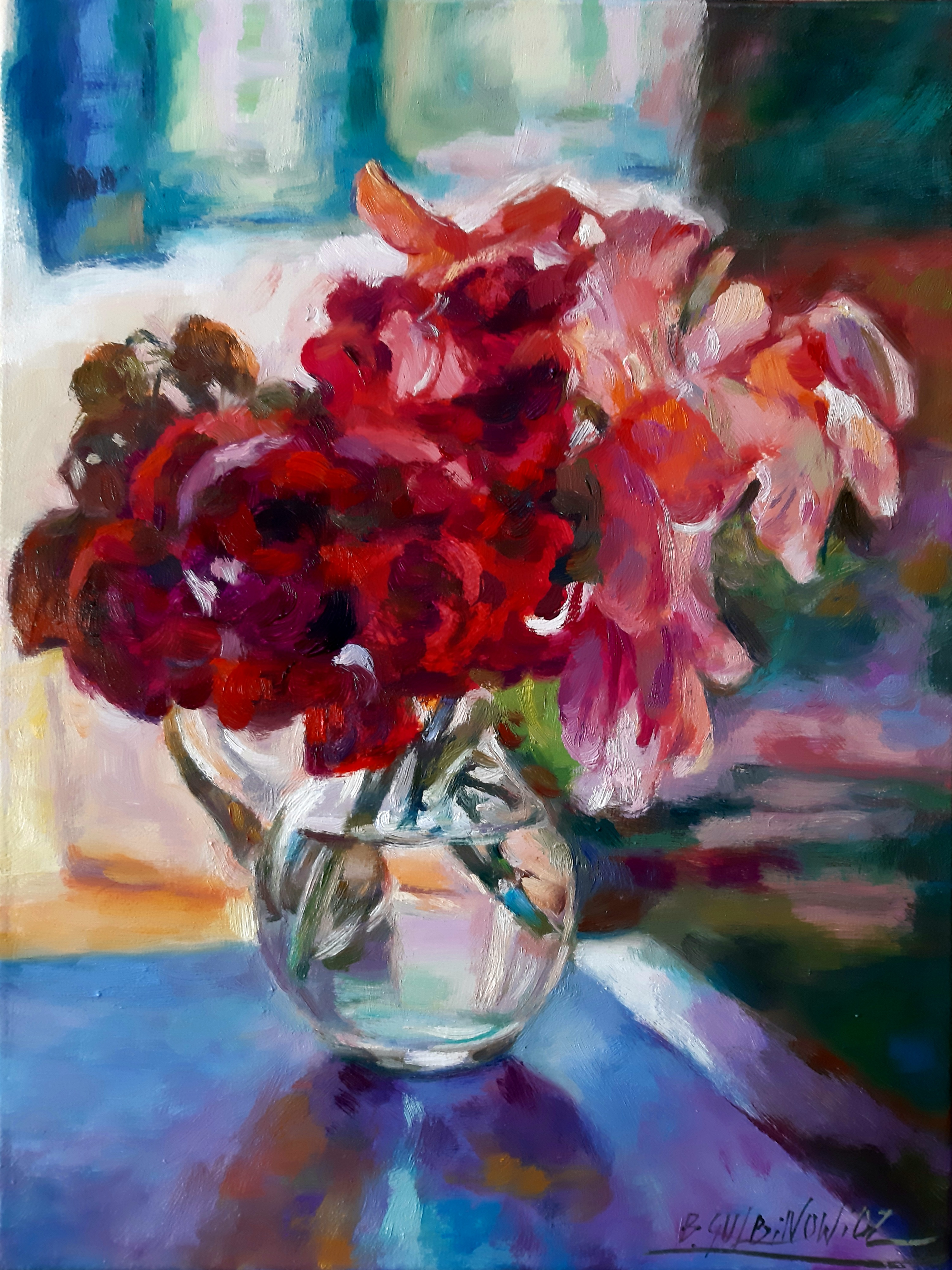 "Irysy i róże", olej na płótnie, 40x30 cm. Martwa natura z bukietem kwiatów w przejrzystym, szklanym wazonie na tle okna. Intensywne, dźwięczne, czerwienie, karminy i róże kontrastują z chłodnymi odcieniami błękitów tła. Obraz przywodzi na myśl obfitość i dojrzałość natury, pełnię jej cyklu. Zawiera w sobie dużą dozę energii. Obraz malowany swobodnymi, pewnymi pociągnięciami pędzla, które zostawiają czytelny ślad i wyraźną, bogatą fakturę.