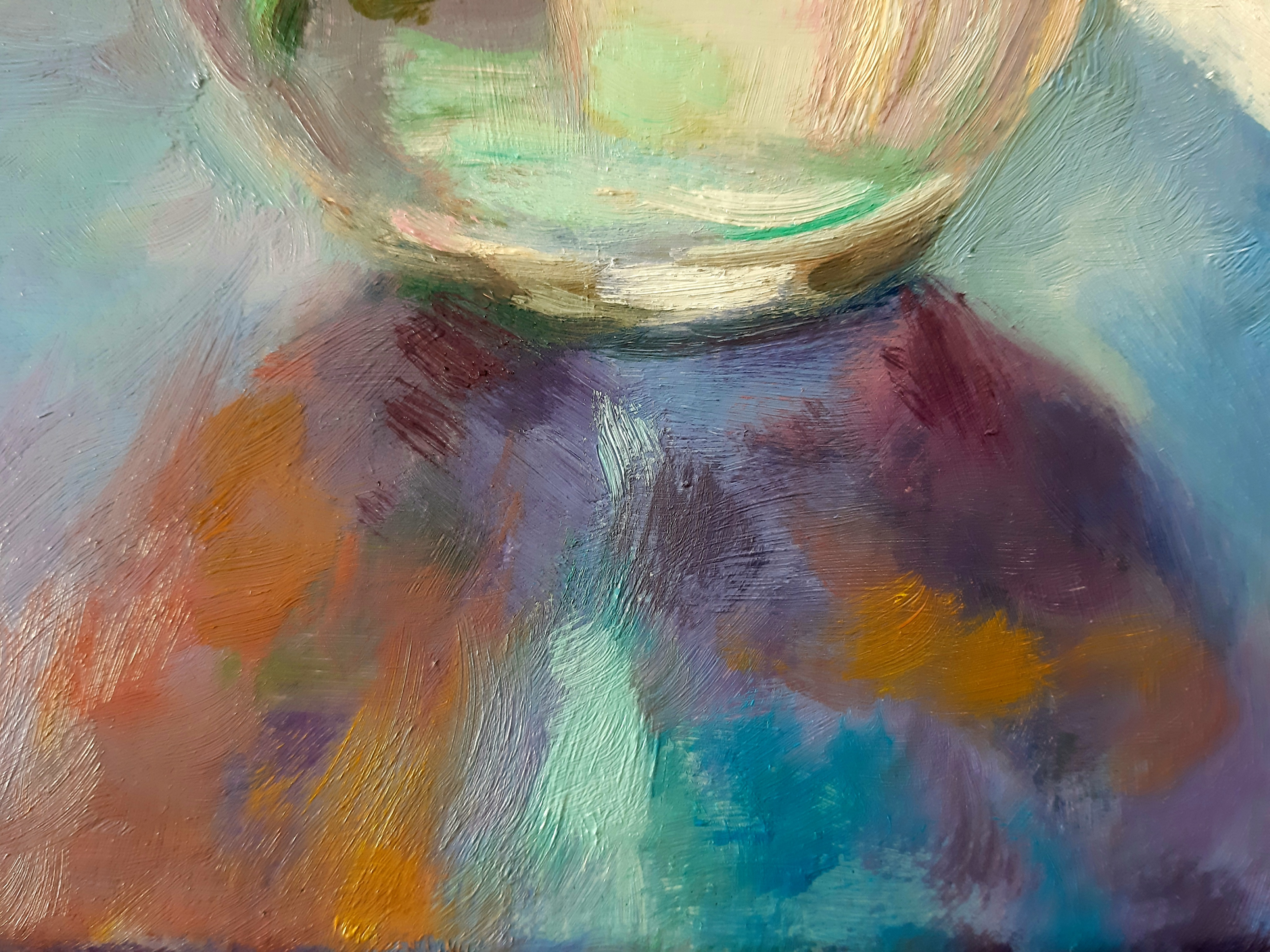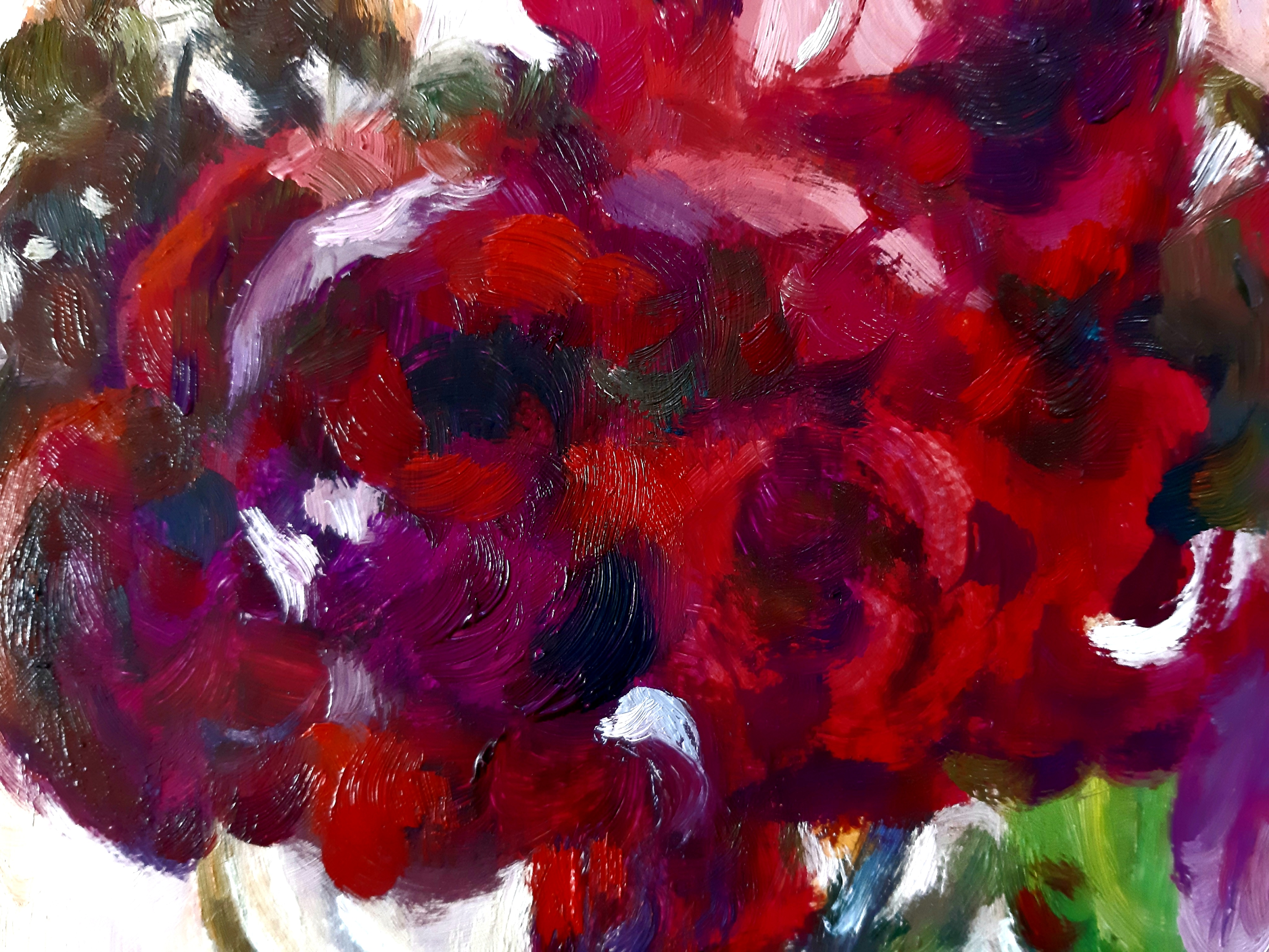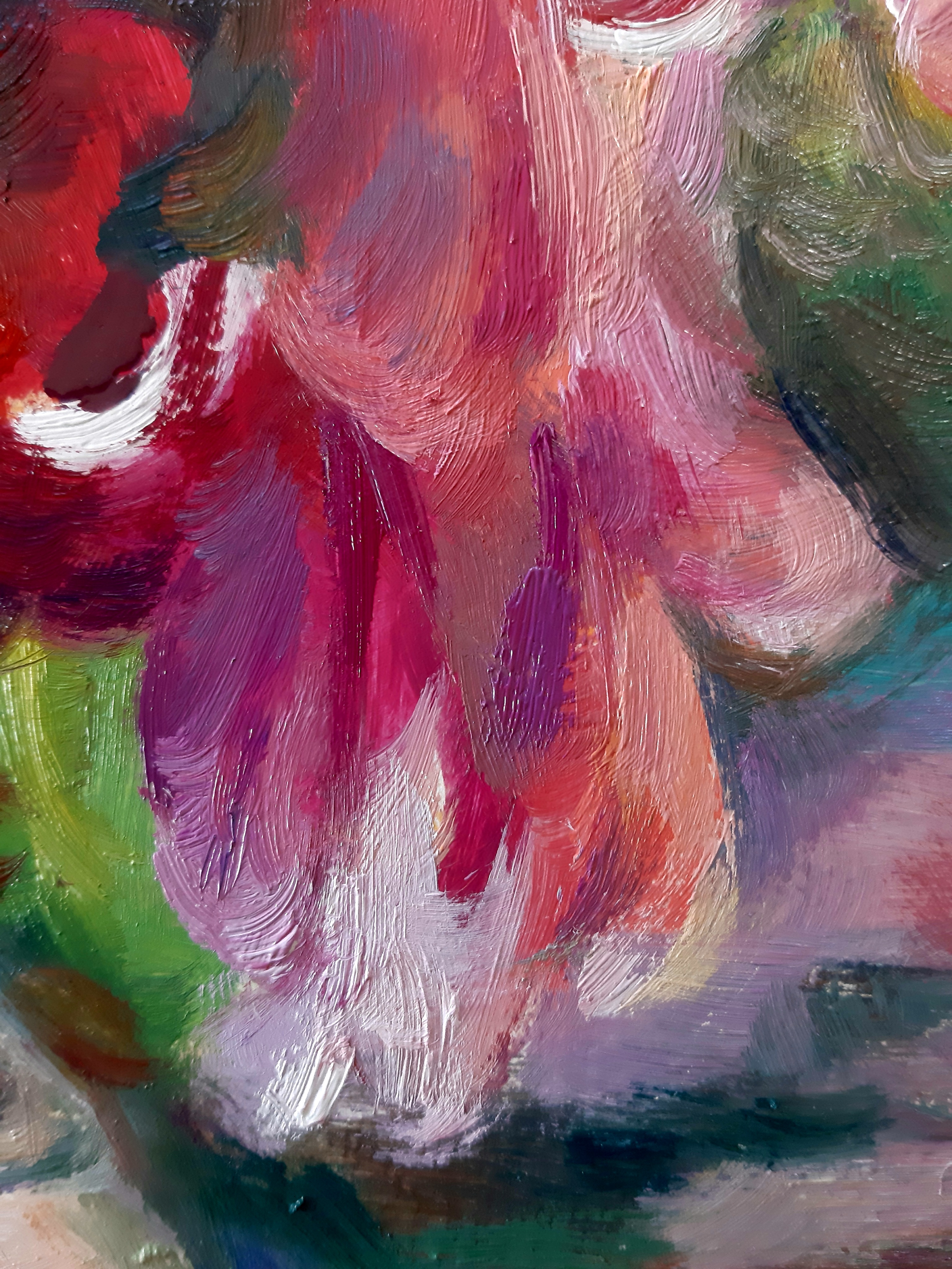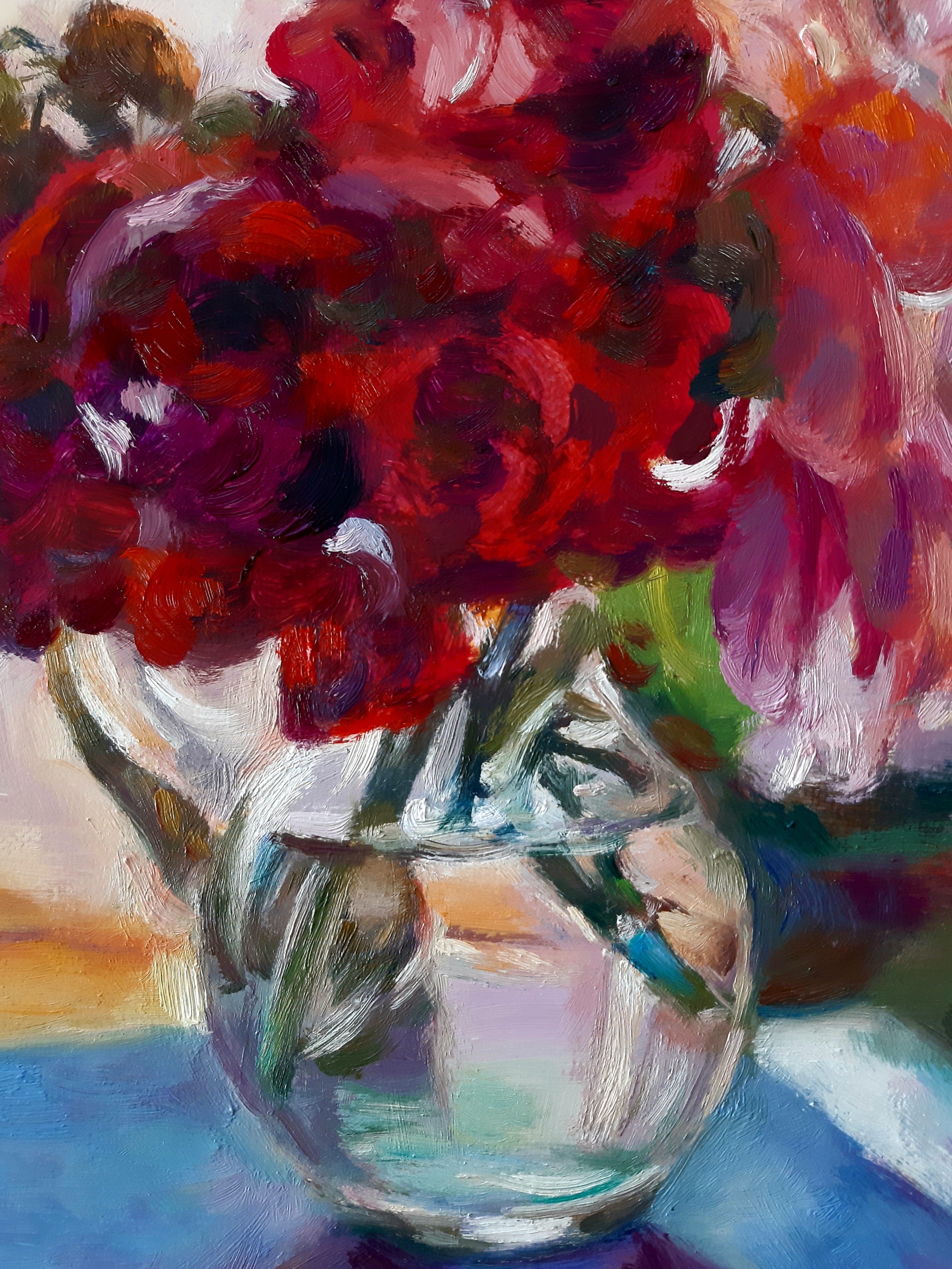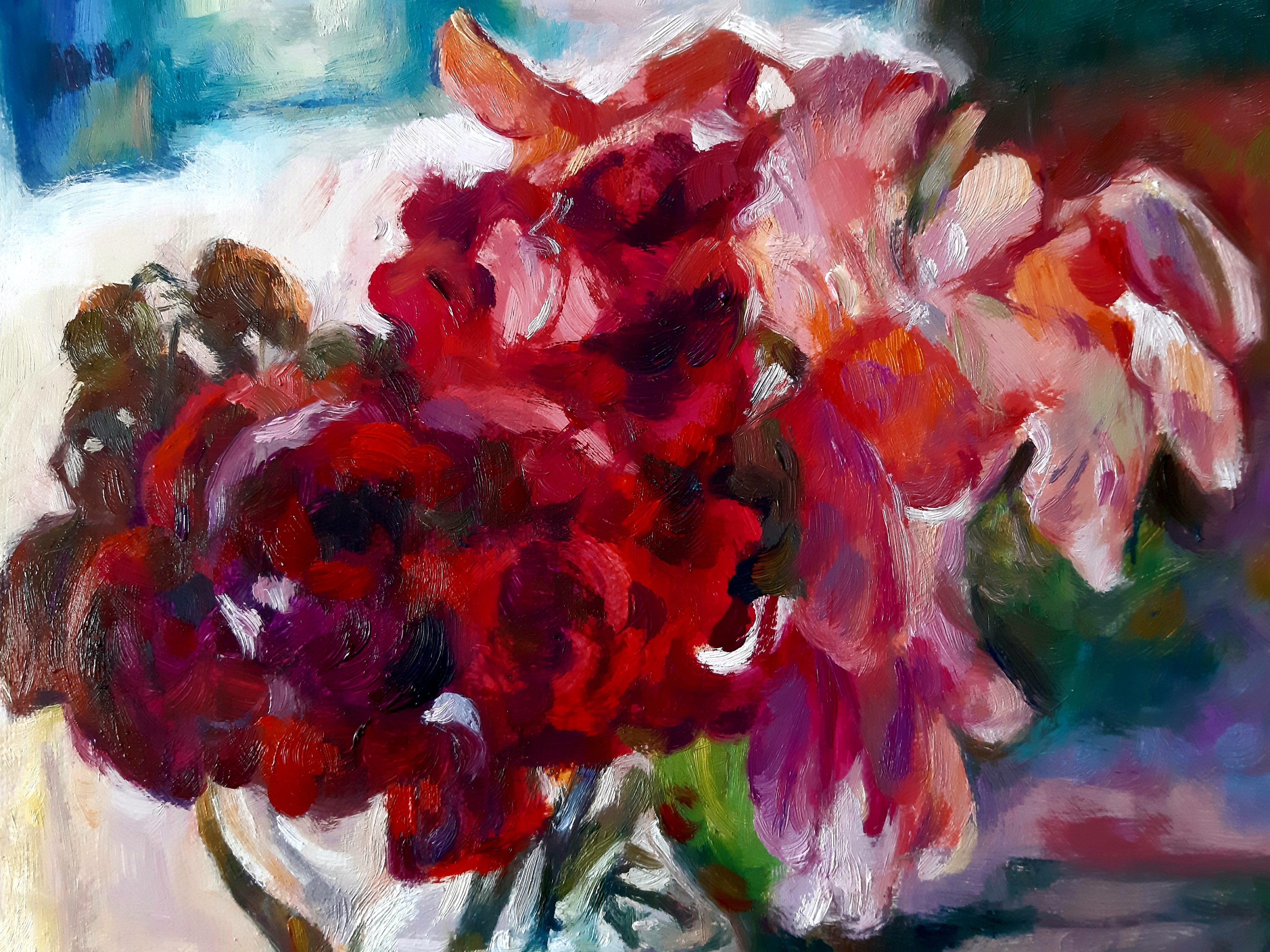 "Irysy i róże", olej na płótnie, 40x30 cm. Martwa natura z bukietem kwiatów w przejrzystym, szklanym wazonie na tle okna. Intensywne, dźwięczne, czerwienie, karminy i róże kontrastują z chłodnymi odcieniami błękitów tła. Obraz przywodzi na myśl obfitość i dojrzałość natury, pełnię jej cyklu. Zawiera w sobie dużą dozę energii. Obraz malowany swobodnymi, pewnymi pociągnięciami pędzla, które zostawiają czytelny ślad i wyraźną, bogatą fakturę.