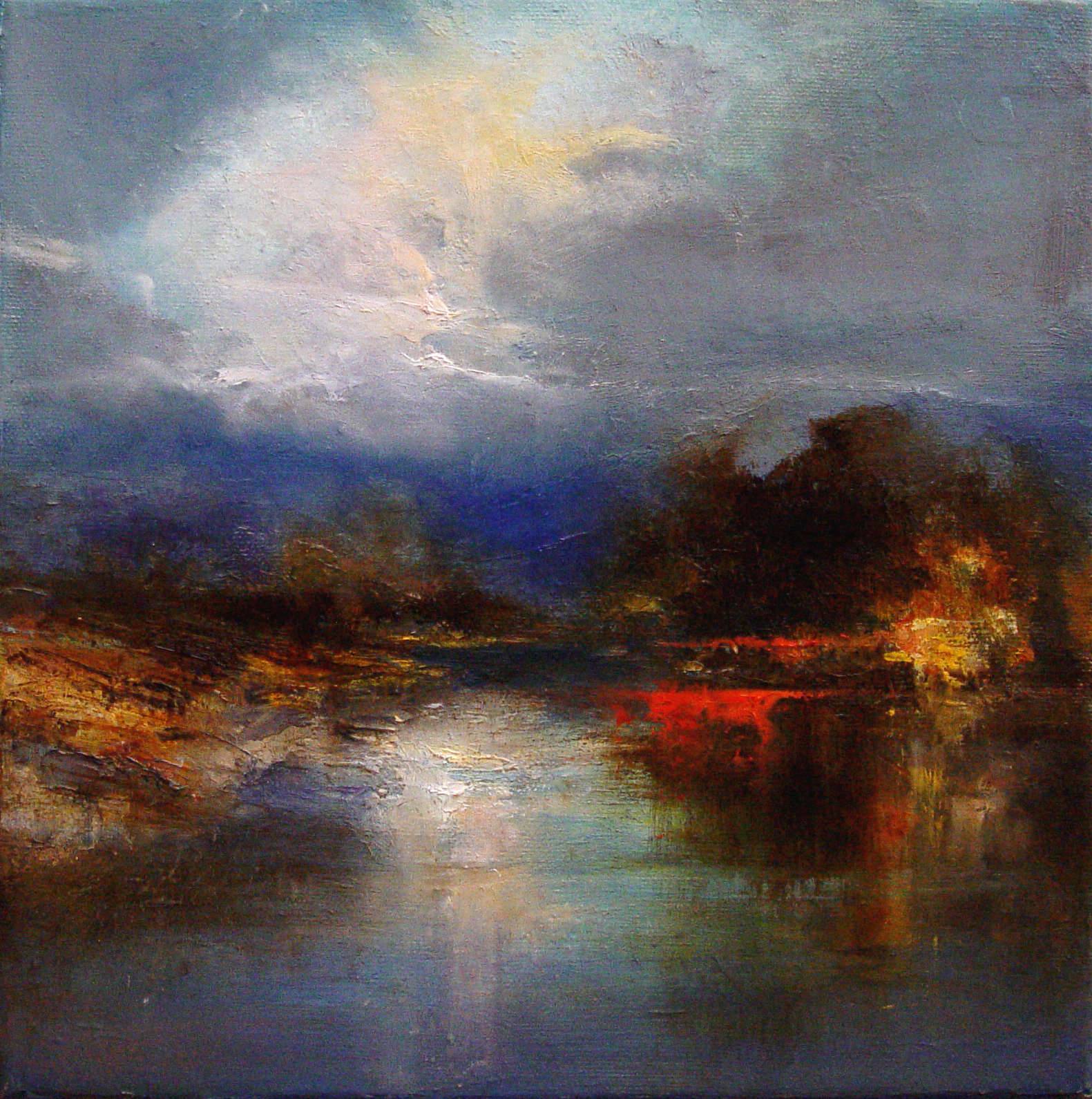 Na obrazie dominują ciemne chmury oraz bogate odcienie niebieskiego i czerwieni, które tworzą dramatyczny kontrast. Rozmazane kształty przypominają zarys krajobrazu, z wodą odbijającą niebo u dołu płótna. Kompozycja jest dynamiczna, nadając wrażenie burzliwej sceny. Wygląda jakby niebo miało się zaraz otworzyć, ujawniając niespodziewany widok. Atmosfera jest napięta, pełna emocji i tajemnicy. To trochę jak w starym filmie noir, gdzie wszystko owiane jest tajemnicą. Artysta zastosował technikę impastu, nakładając farbę grubą warstwą, co dodaje tekstury i głębi. Odbiorca może poczuć wewnętrzny niepokój, ale i fascynację tym niezwykłym pięknem natury. Jak siedmiolatek powiedziałby: "To wygląda jak gdyby niebo miało wybuchnąć!" Język barw i pociągnięć pędzla jest pewny, jakby artysta chciał powiedzieć "look closer". Obraz może budzić refleksję nad potęgą natury i kruchością chwili.